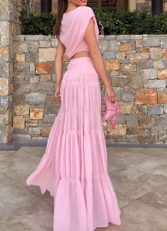 Pleated Sleeveless Top Stitching Pink Dress Suit
