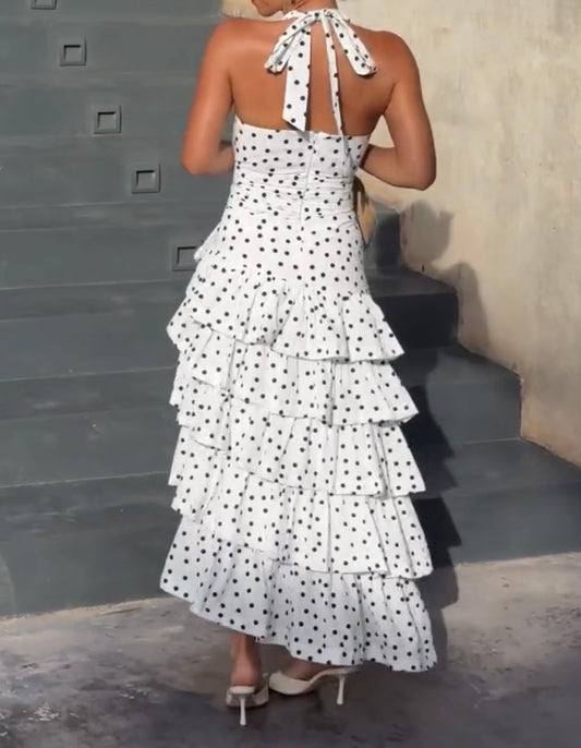Polka-Dot Slim-Fit V-neck Halter Cake Dress