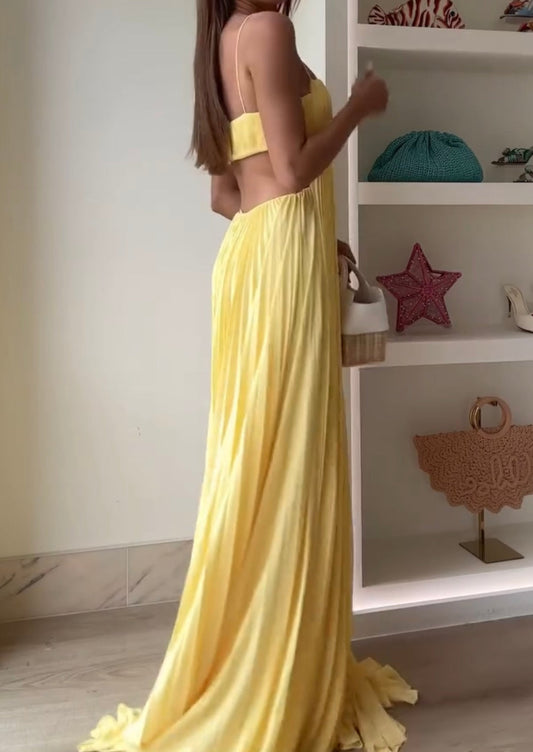Sexy Elegant Waist Slimming Yellow Gallus Pleated Hollow Dress