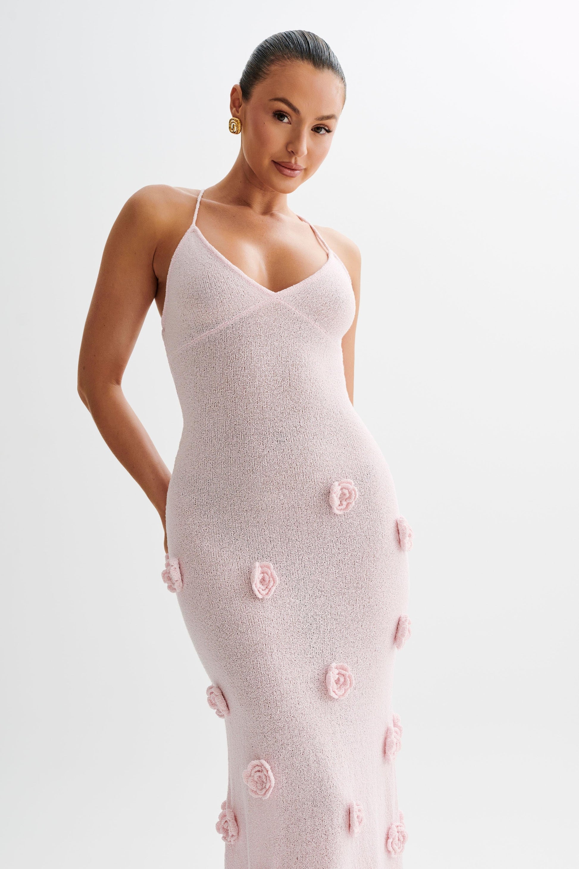 The SUKI Flowers Maxi Dress is a stunning blend of elegance and modern femininity, featuring a flattering V-neckline, crisscross straps, and a body con silhouette that enhances your curves while delicate 3D floral appliqué adds a romantic touch; crafted from lightweight, sheer knitwear, it offers breathable comfort and a dreamy layered look that keeps your style effortlessly sophisticated.