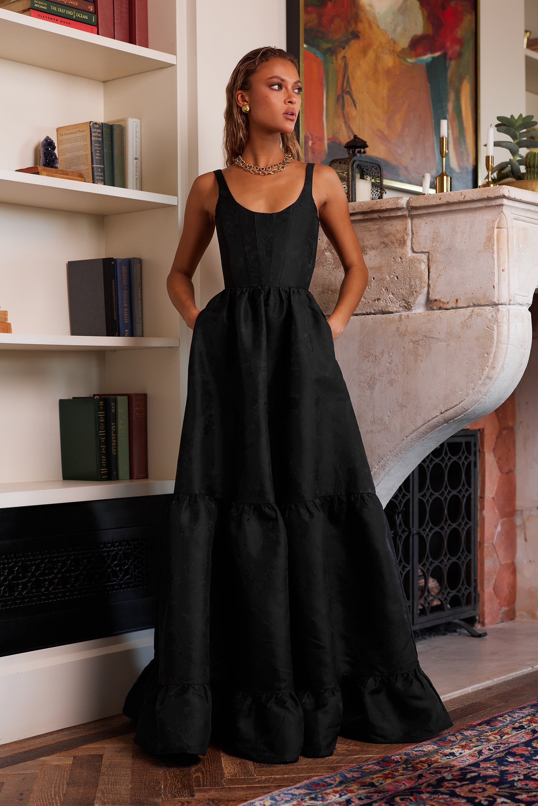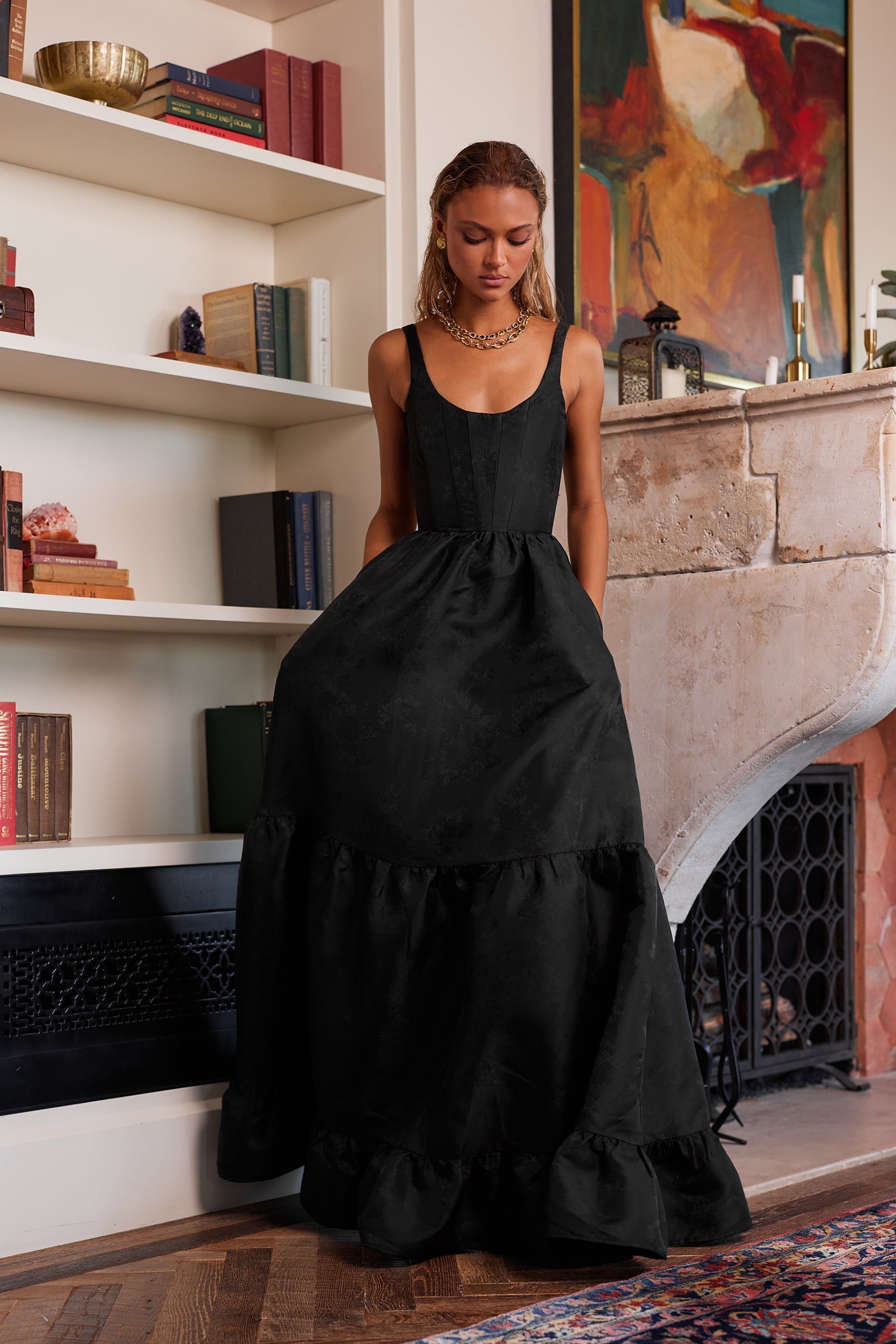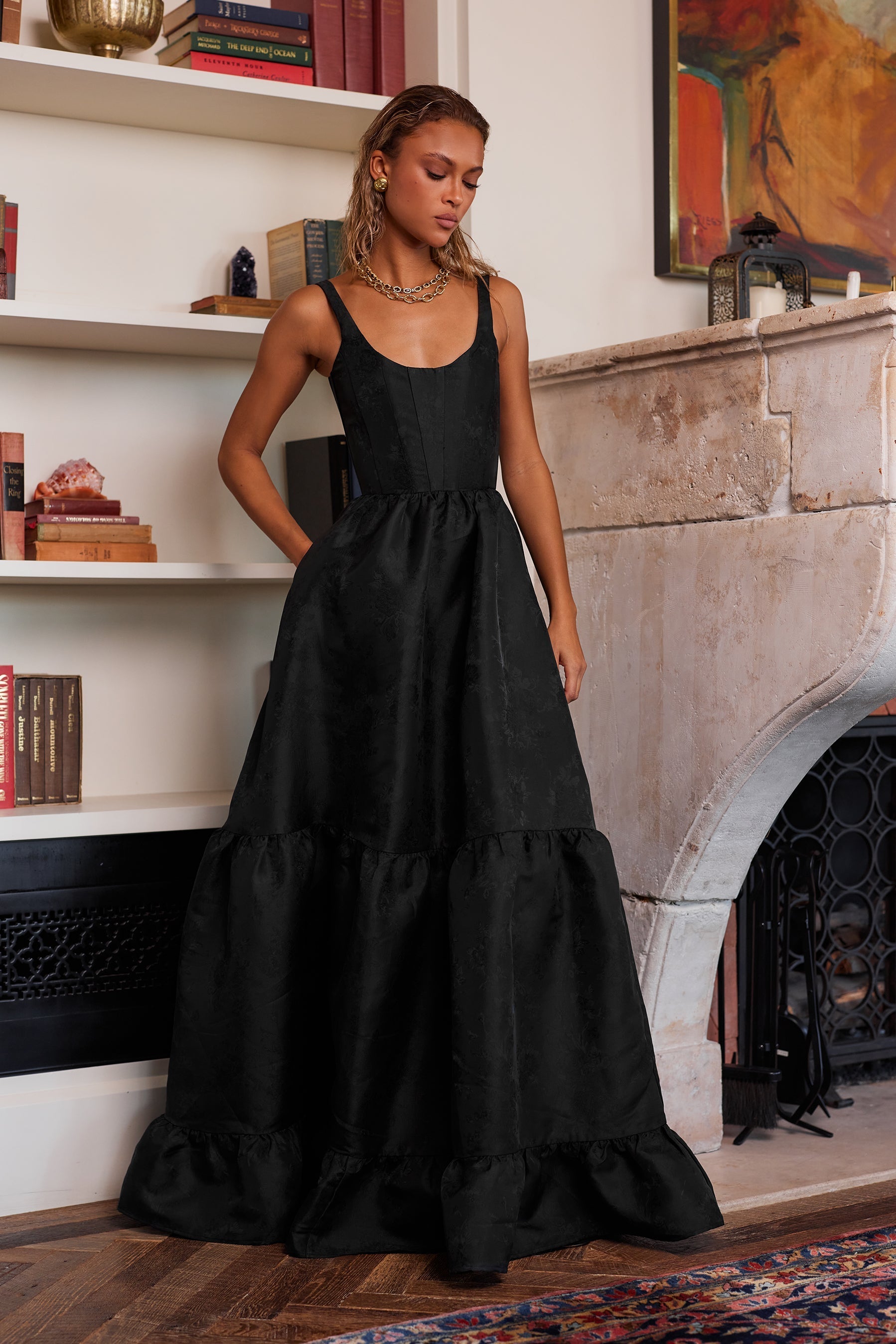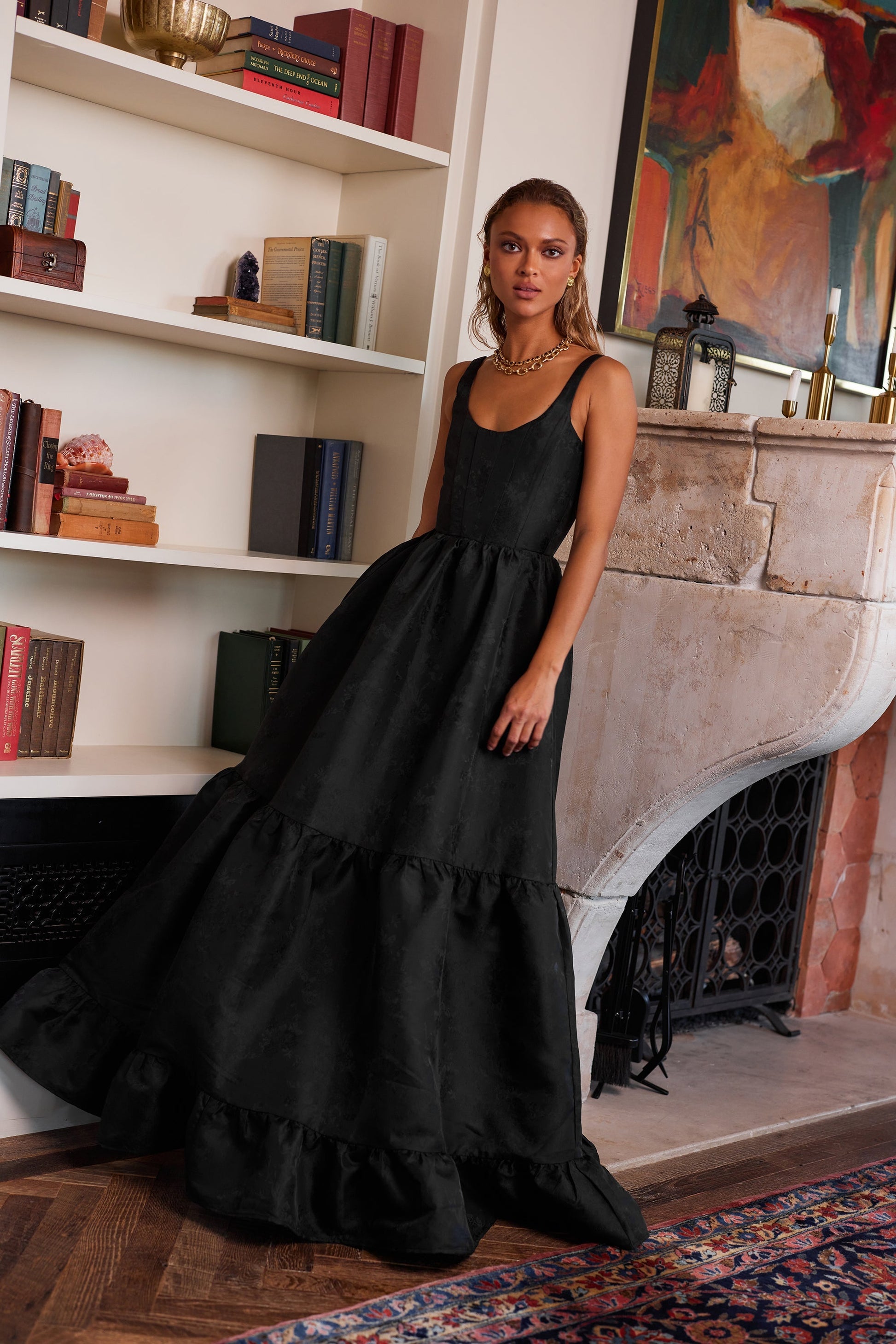 Meet The Avery Dress! She's a beautifully corseted scoop-neck gown with cascading gathered tiers and side pockets. Fall in love with her classic silhouette and darling floral details. Featured in our romantic Black Windsor Brocade fabric, which features black florals on a black background, she's the perfect party dress!