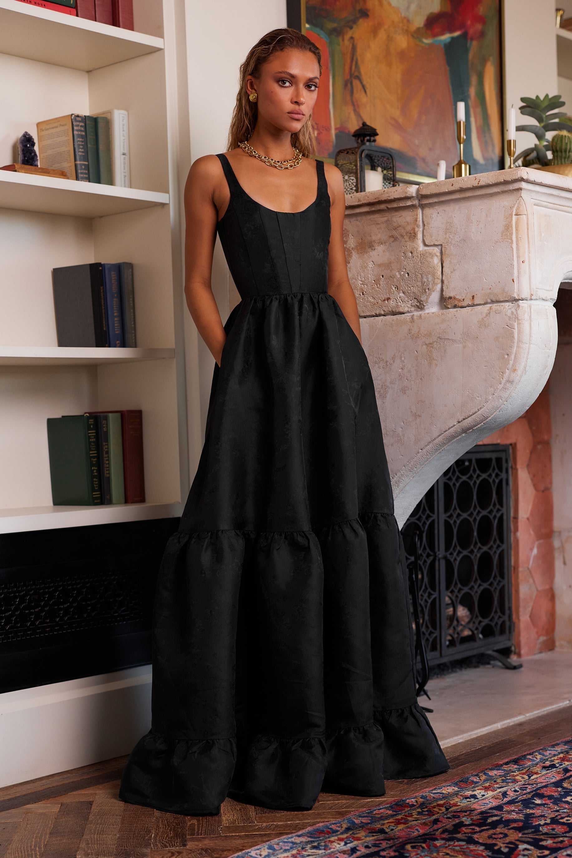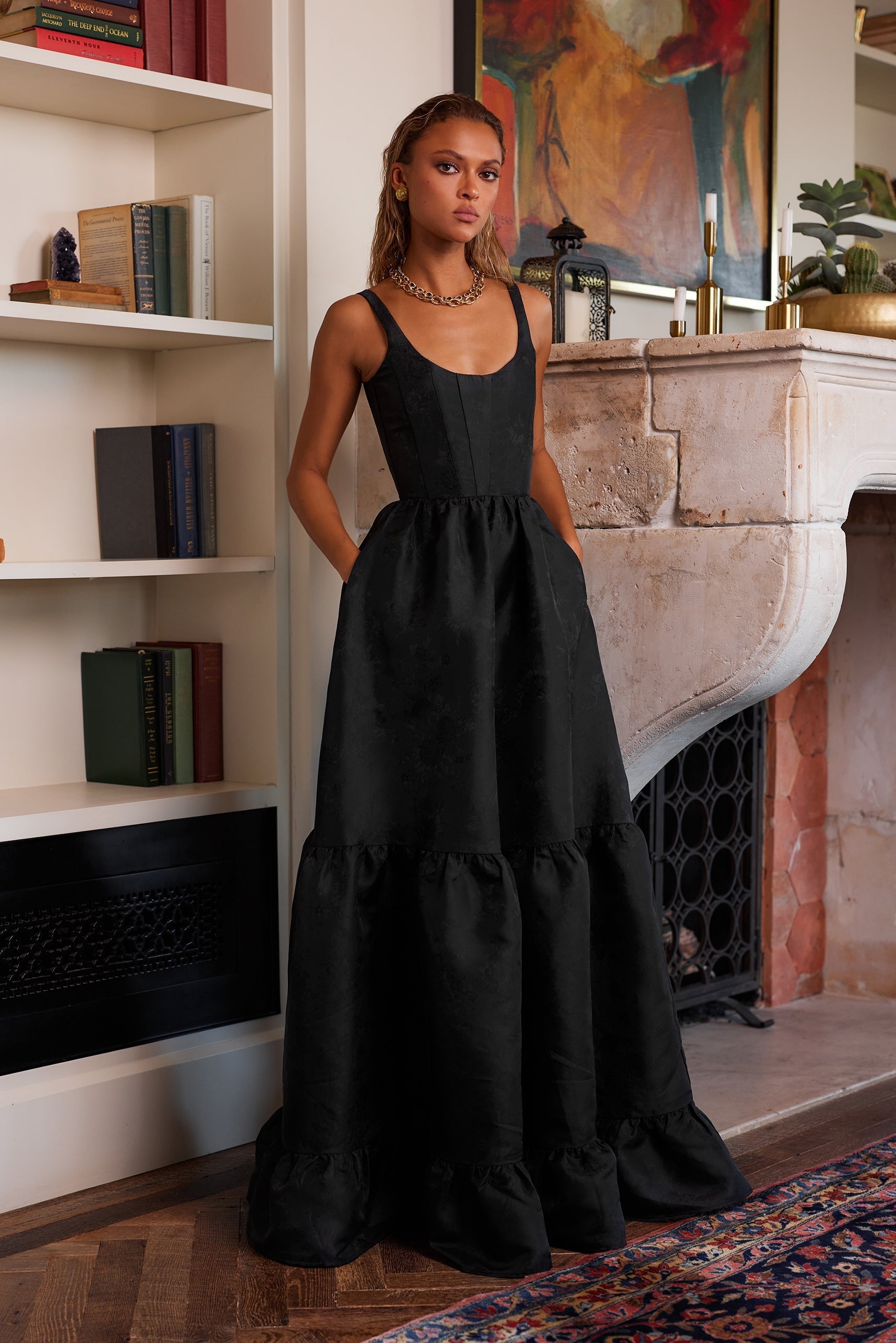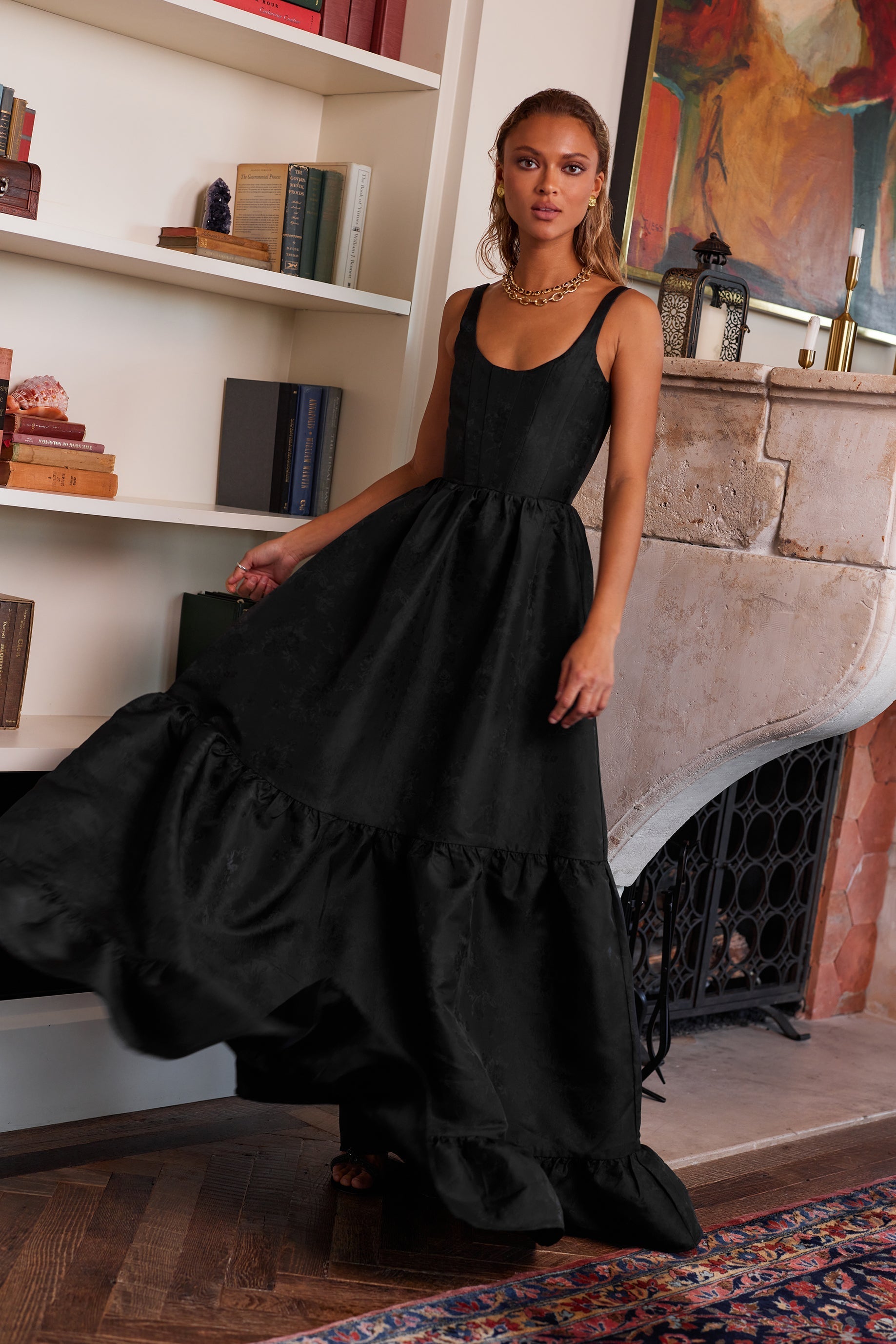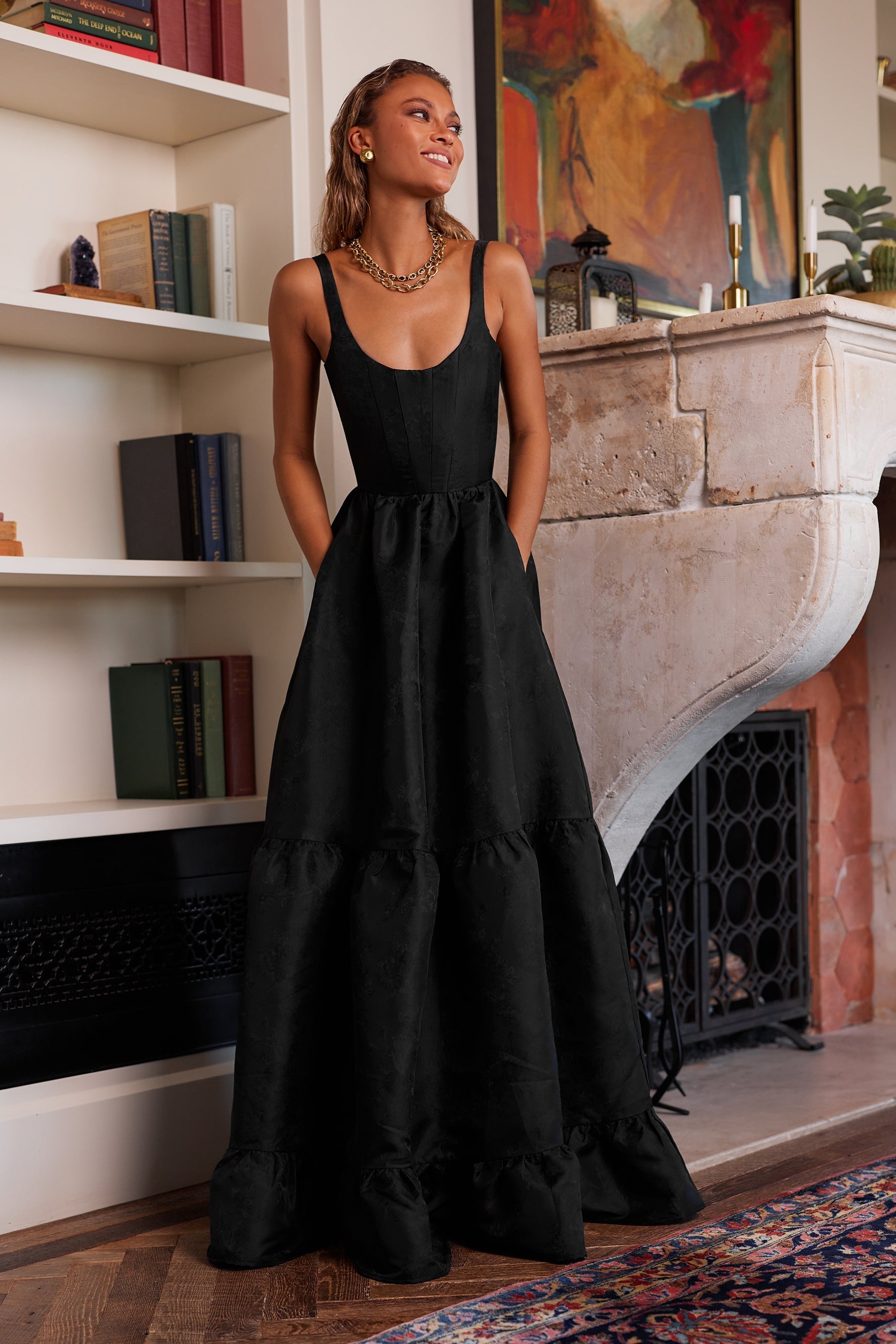Meet The Avery Dress! She's a beautifully corseted scoop-neck gown with cascading gathered tiers and side pockets. Fall in love with her classic silhouette and darling floral details. Featured in our romantic Black Windsor Brocade fabric, which features black florals on a black background, she's the perfect party dress!