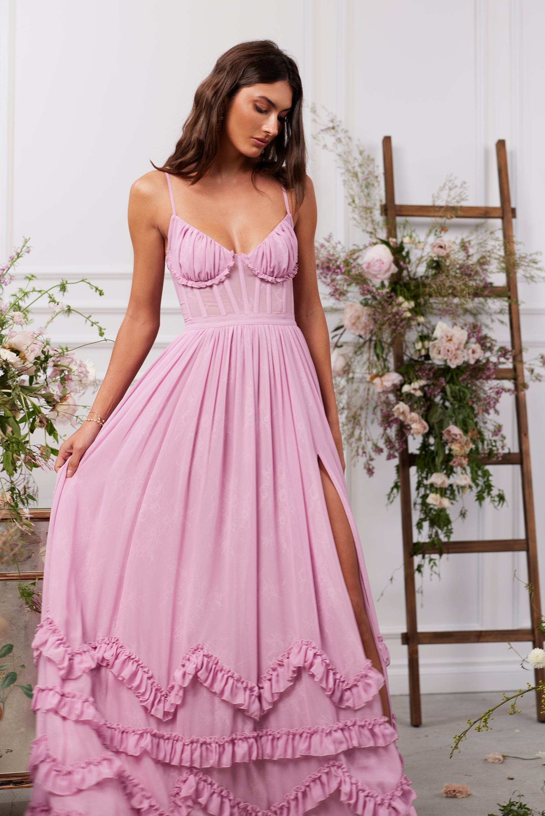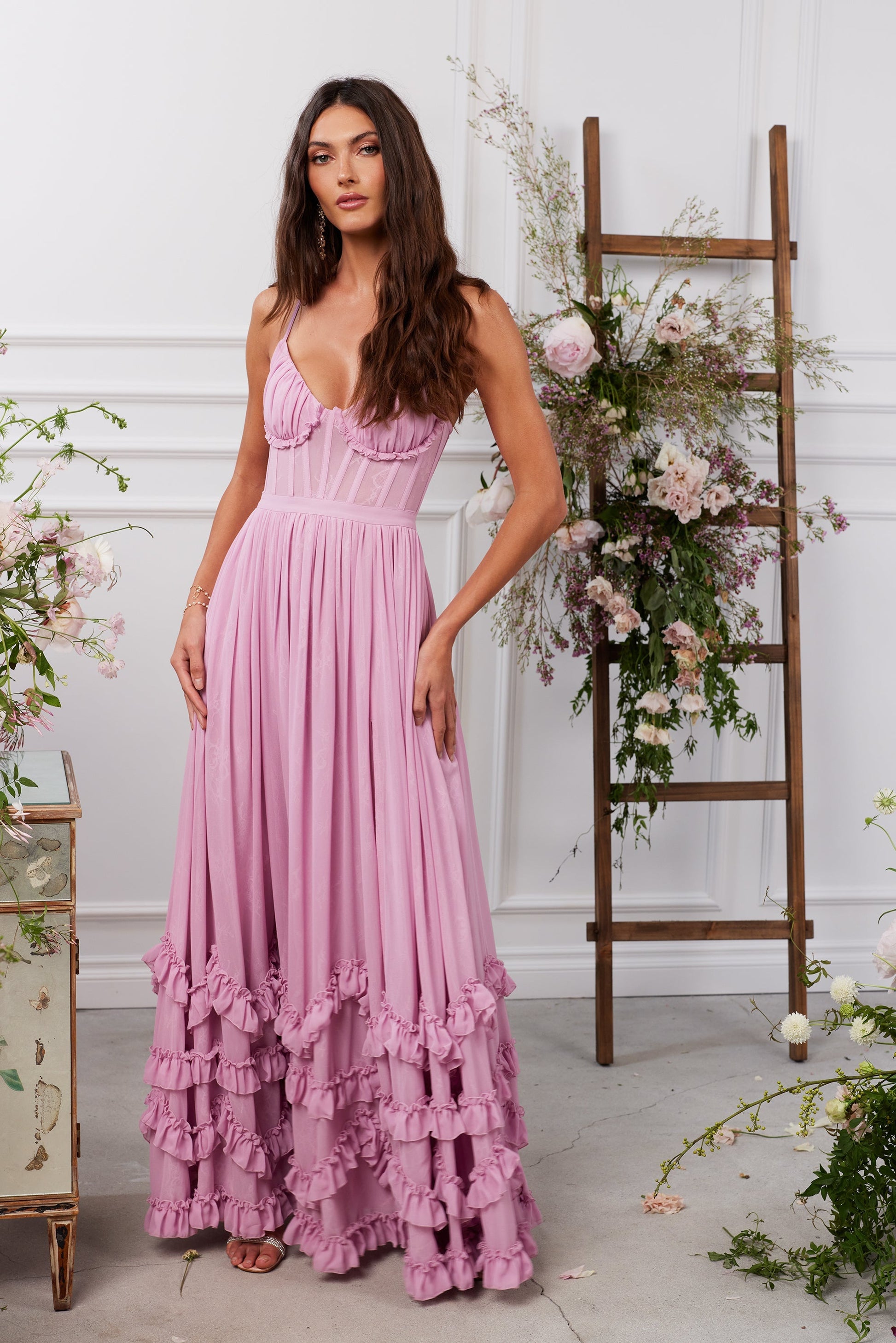 Meet Carmen! She's a stunning full-length corset gown featuring a high side front slit and adorned with delicate ruffle details at the hem. She's made from our solid Mauve Mist chiffon over soft, subtle layers of lace and accented with a beautiful bow-tie detail at the back.