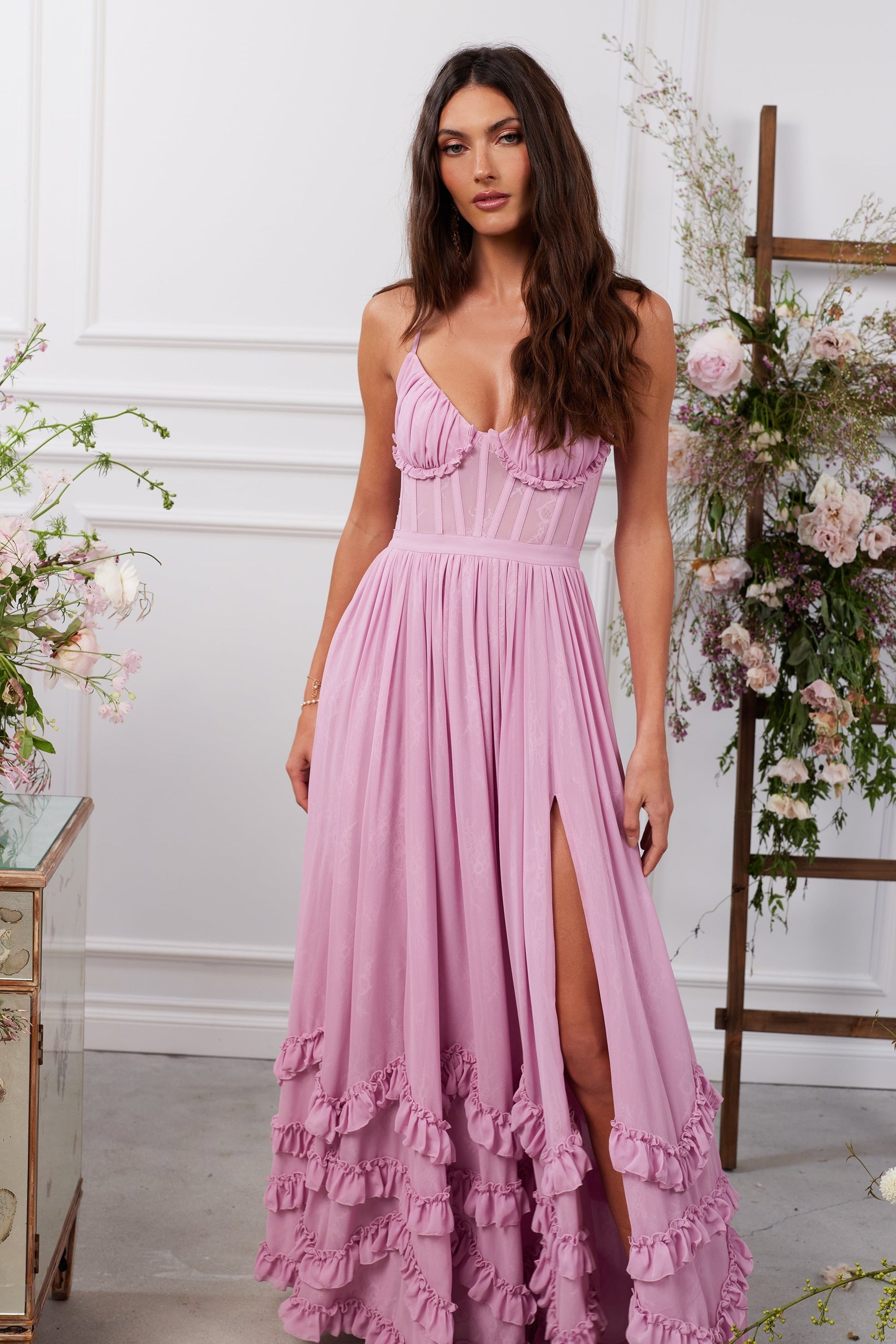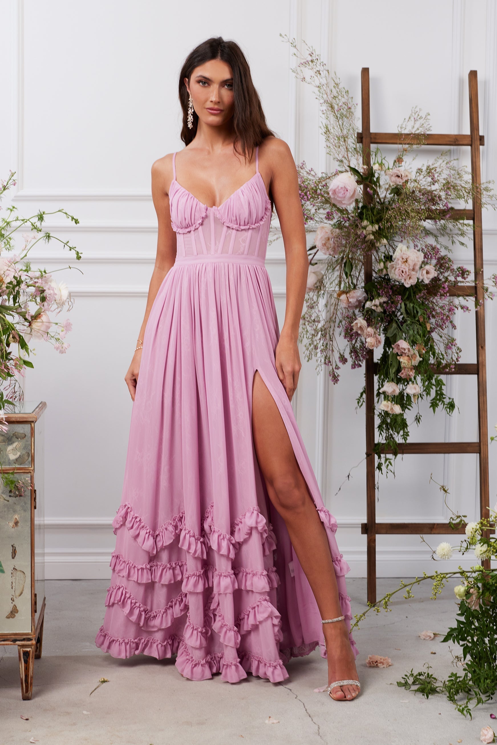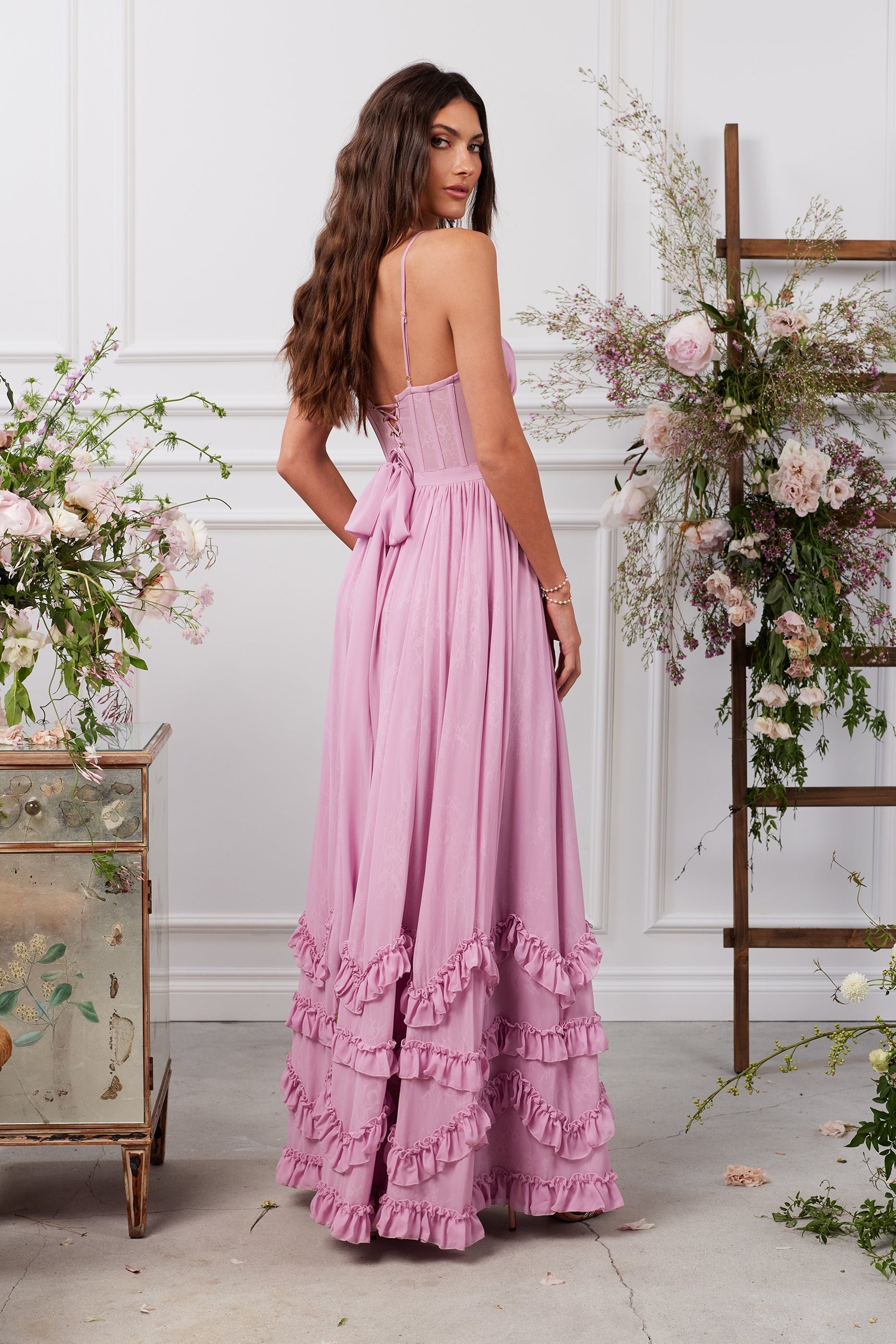 Meet Carmen! She's a stunning full-length corset gown featuring a high side front slit and adorned with delicate ruffle details at the hem. She's made from our solid Mauve Mist chiffon over soft, subtle layers of lace and accented with a beautiful bow-tie detail at the back.