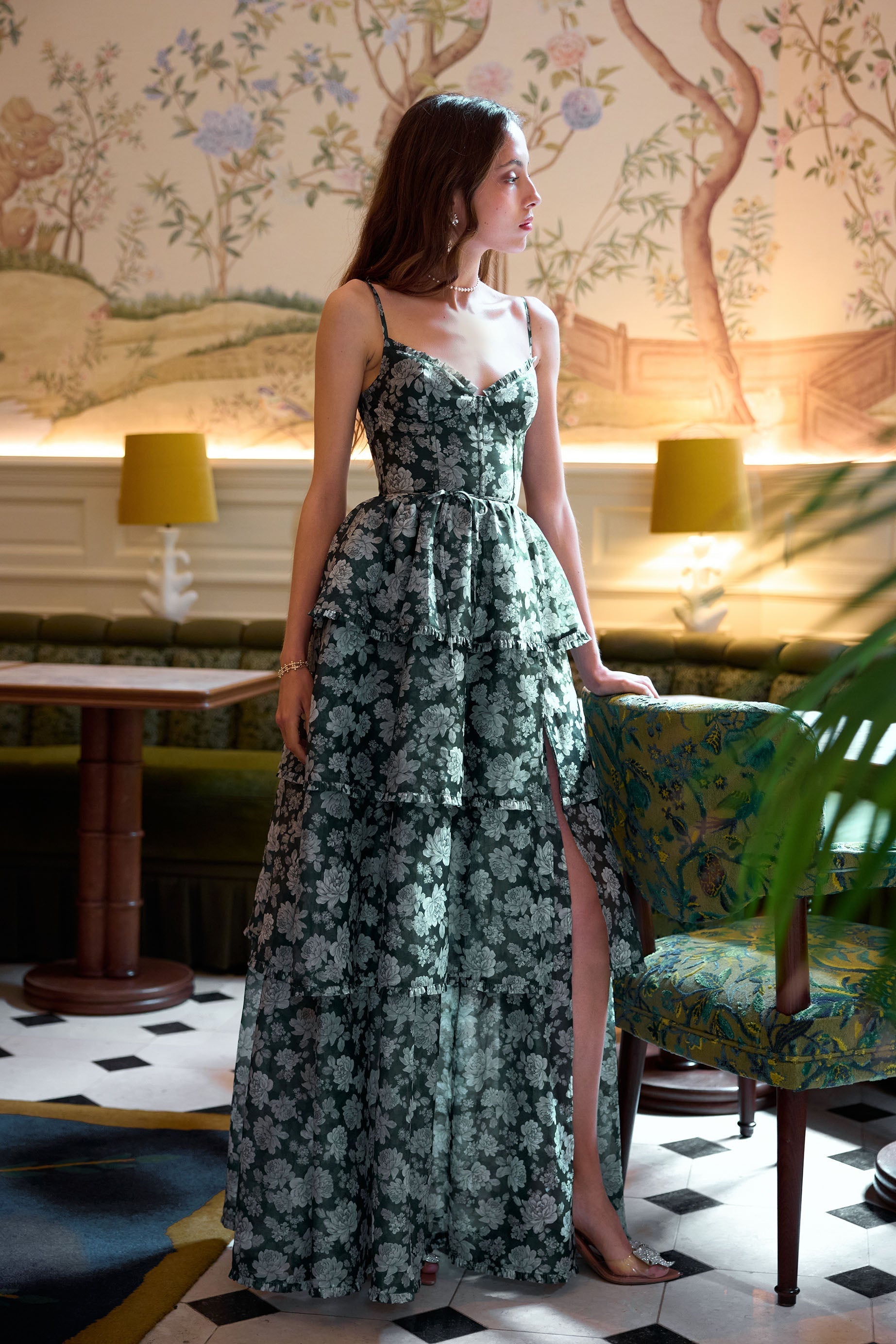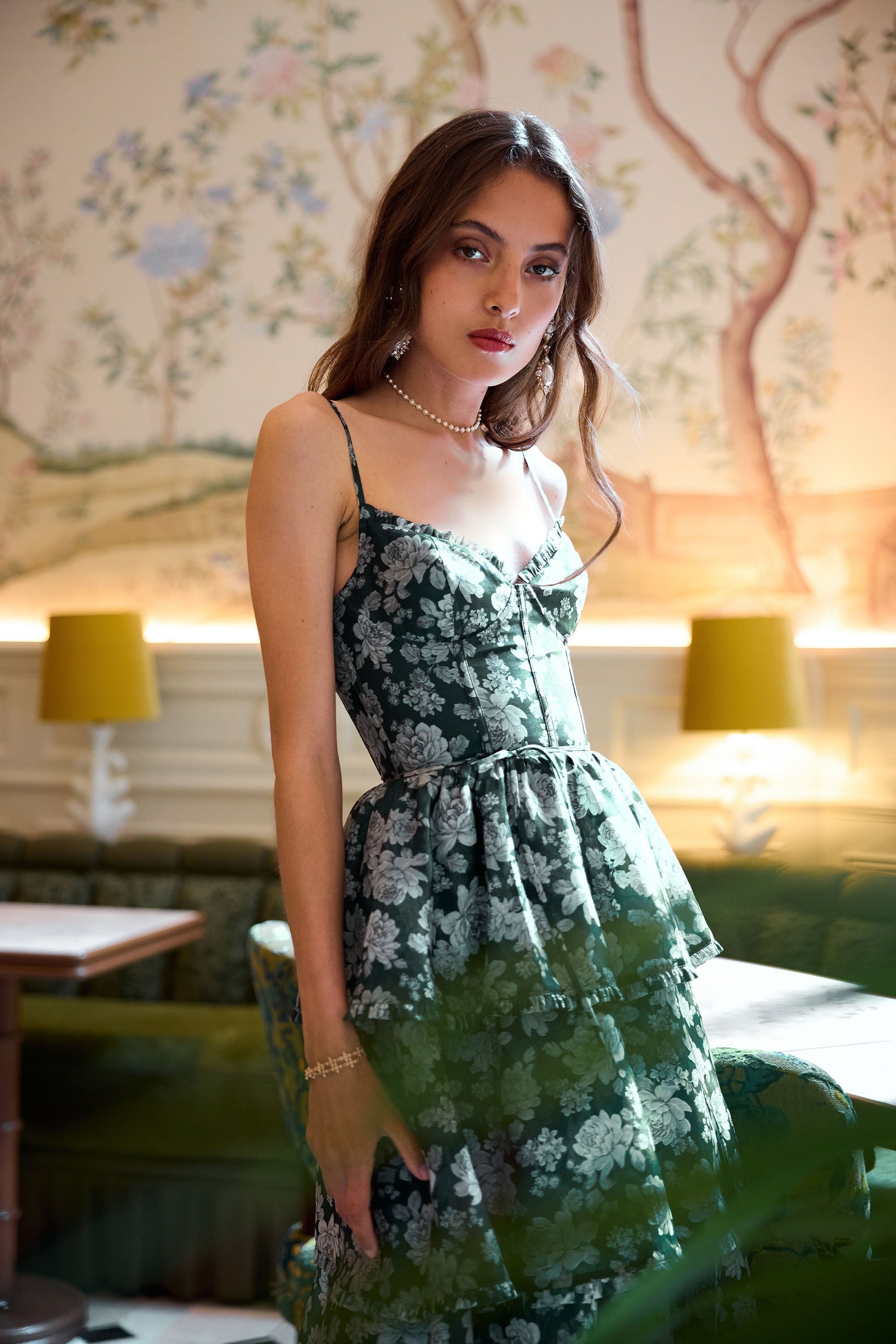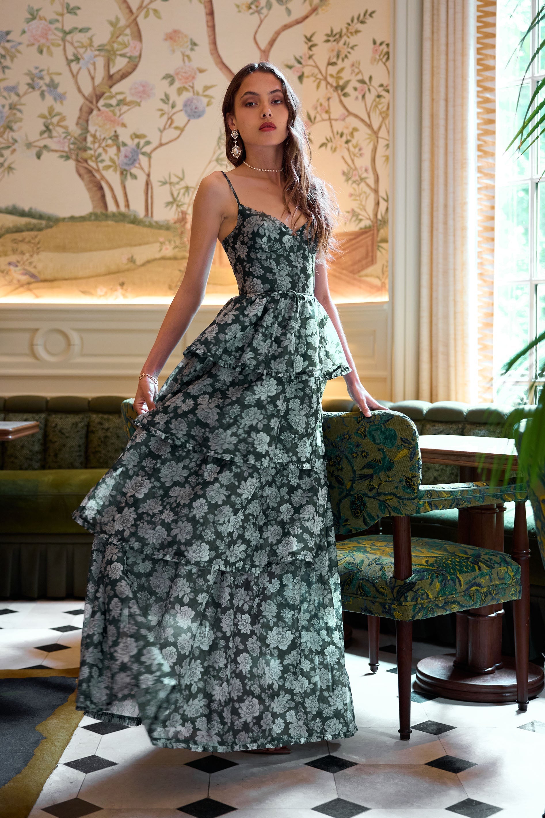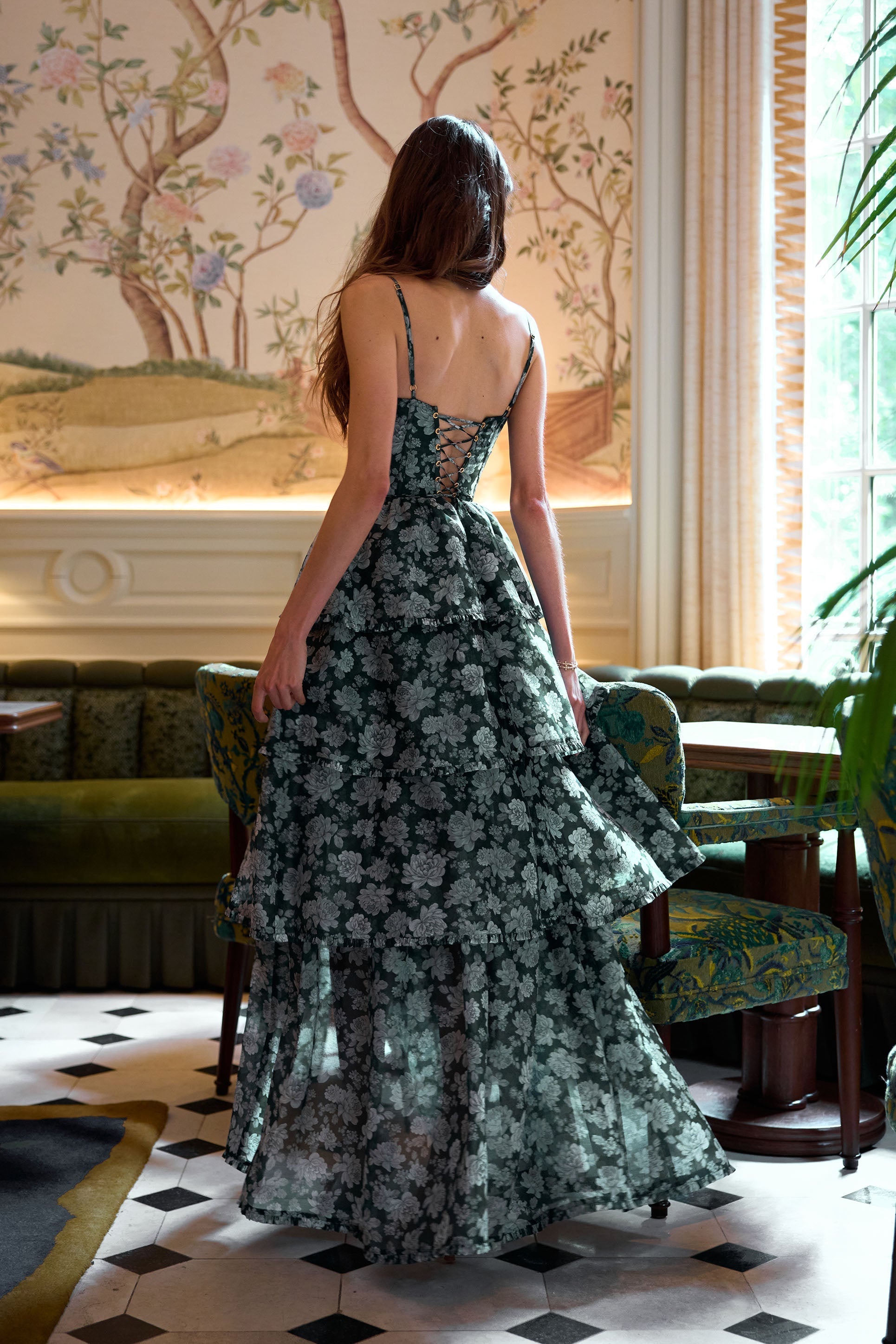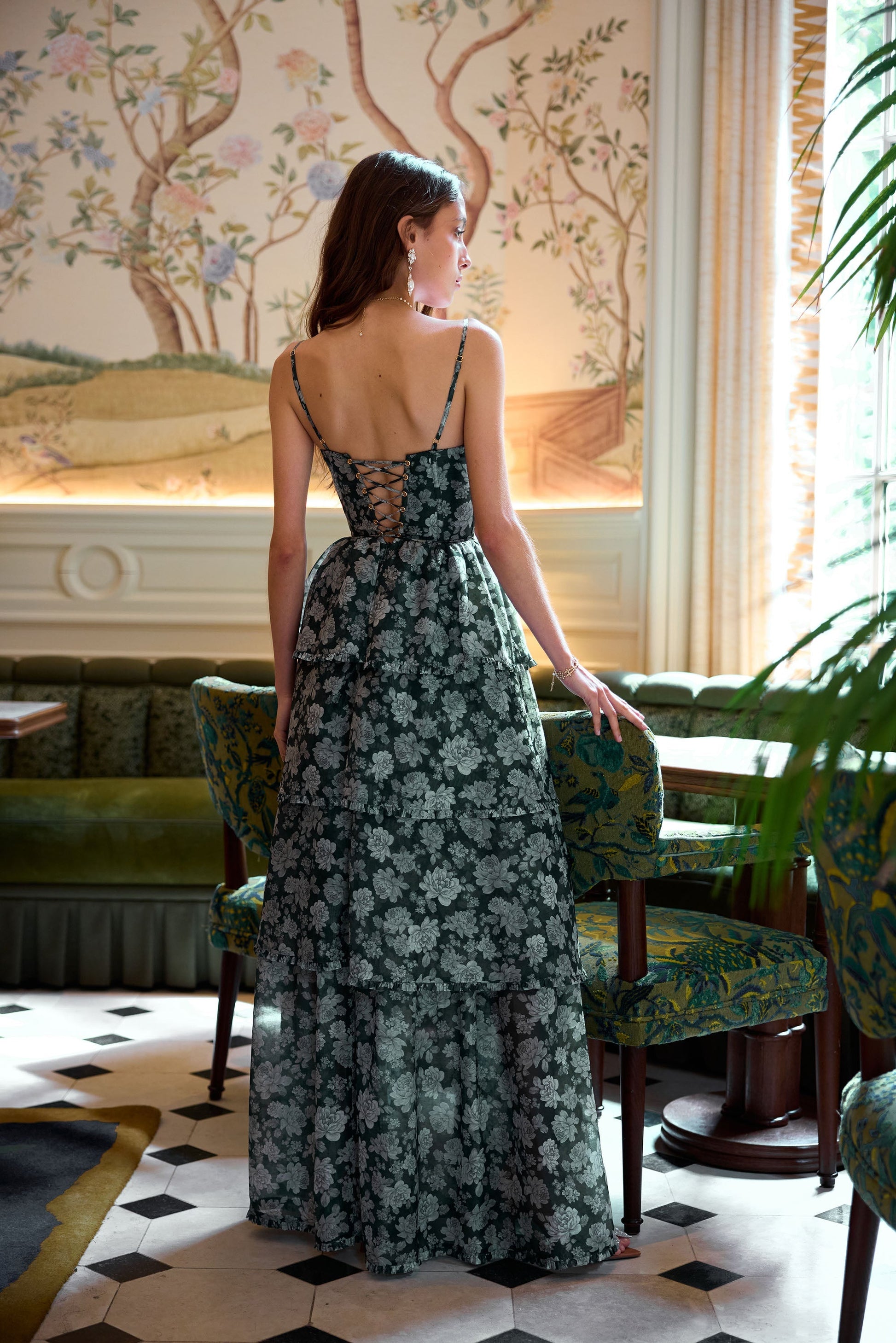Meet Caterina! She's a beautifully tiered, full length gown made in our gorgeous organza. Printed in our delicate Emerald Peony Print, which features grey and green florals on a emerald green background, she flaunts a stunning corset bodice and darling ruffle details. She's a floral dream come true!