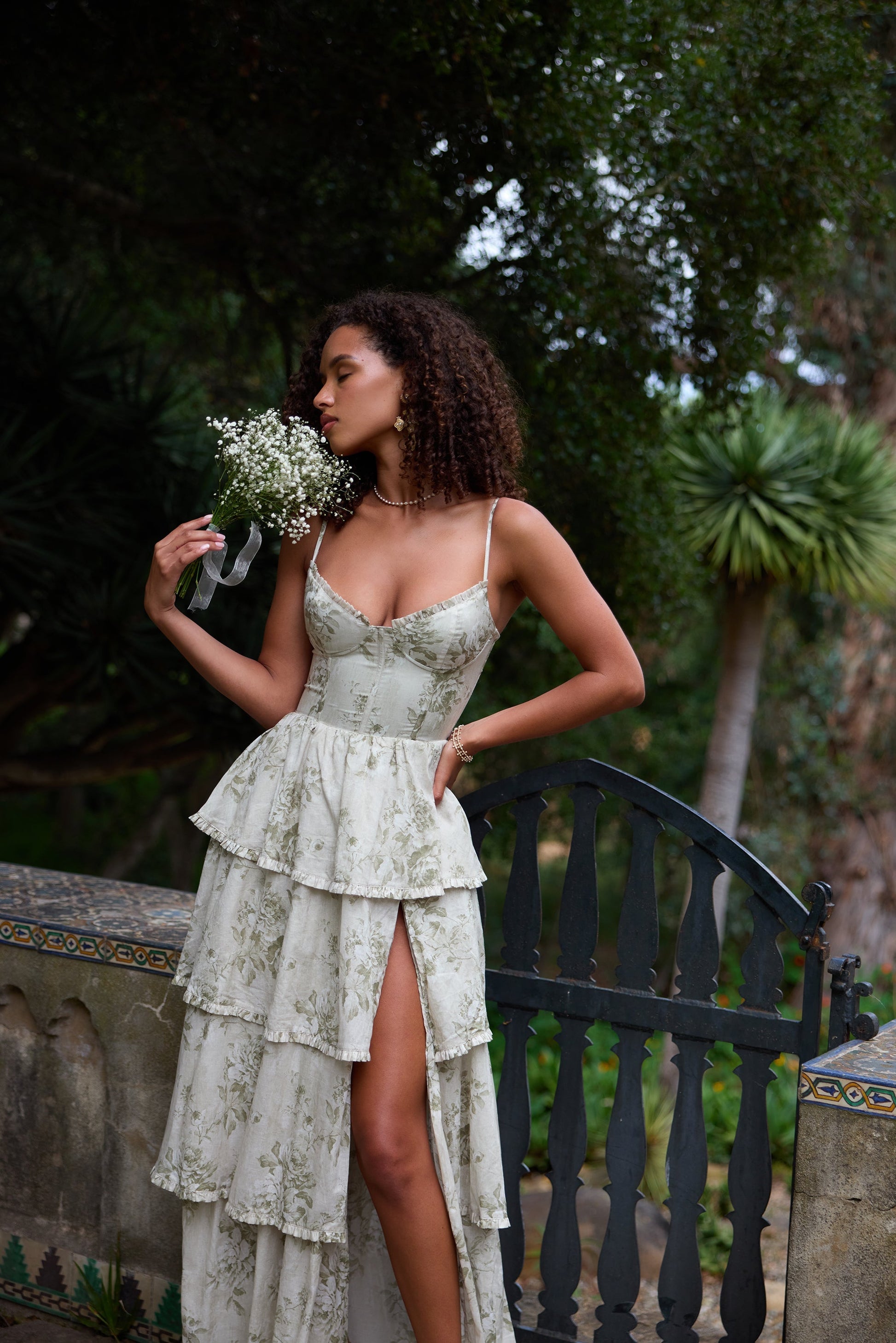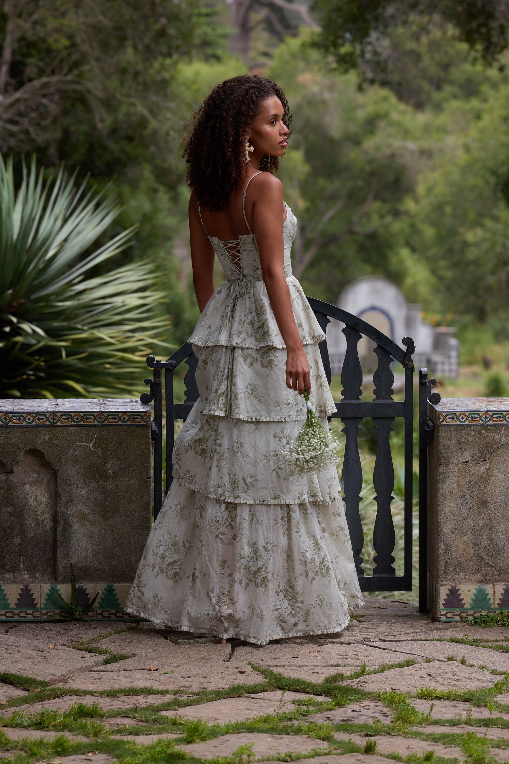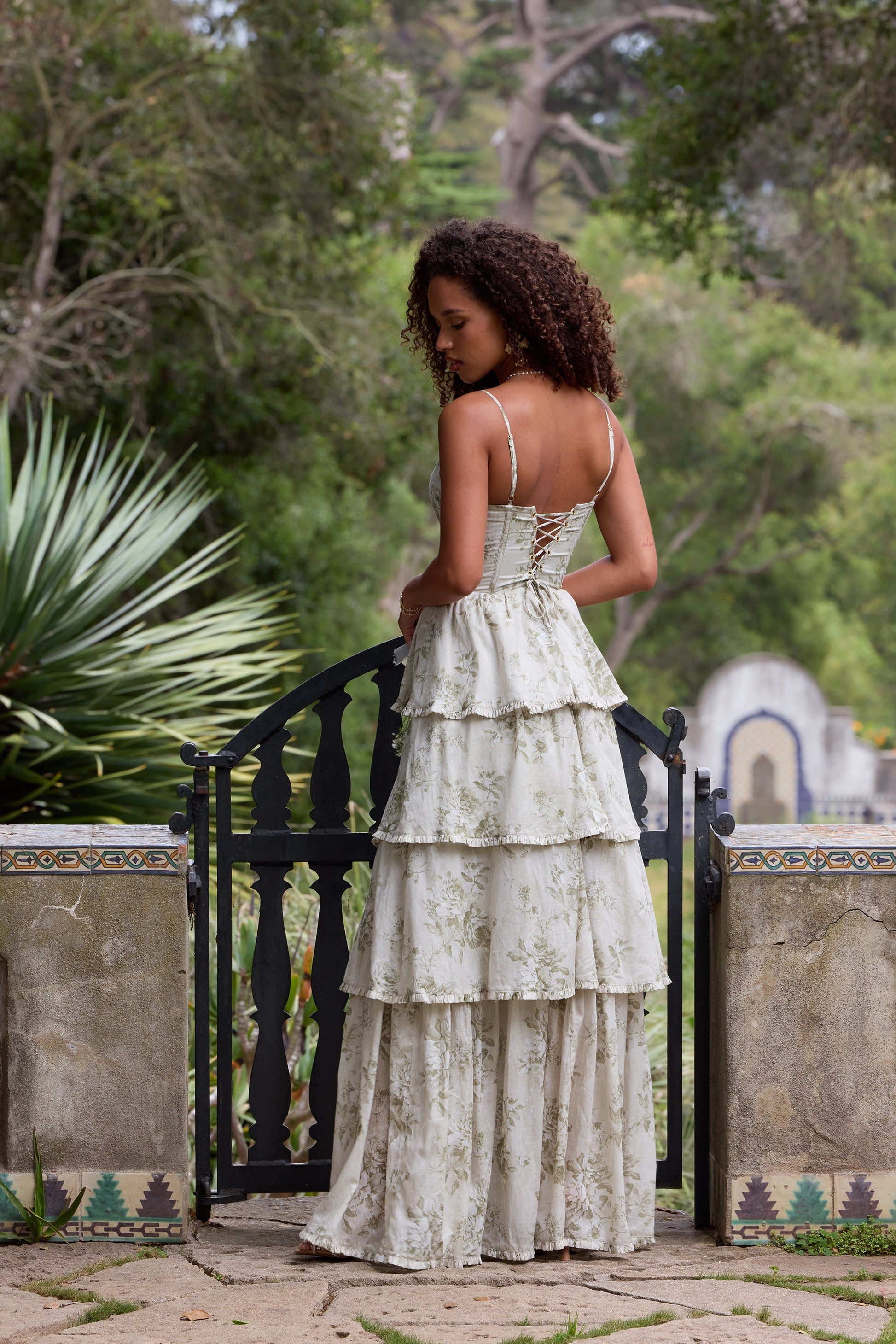Meet Caterina, a beautifully tiered full length gown made in our lightest and softest cotton voile fabric. She's made in our delicate Sage Tapestry floral print, which features sage florals on a sage background, and flaunts a stunning corset bodice and darling ruffle details. She's a floral dream come true!
