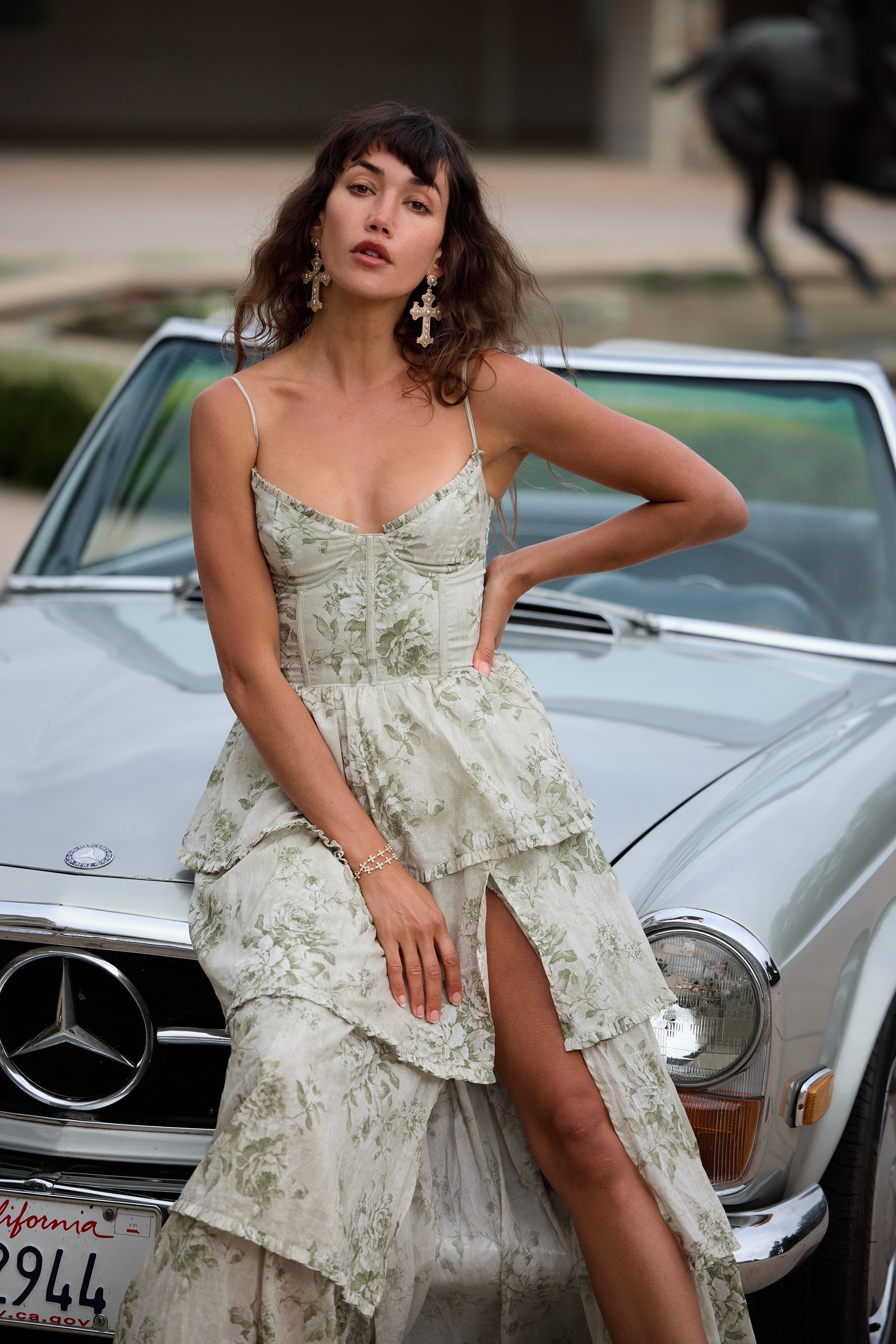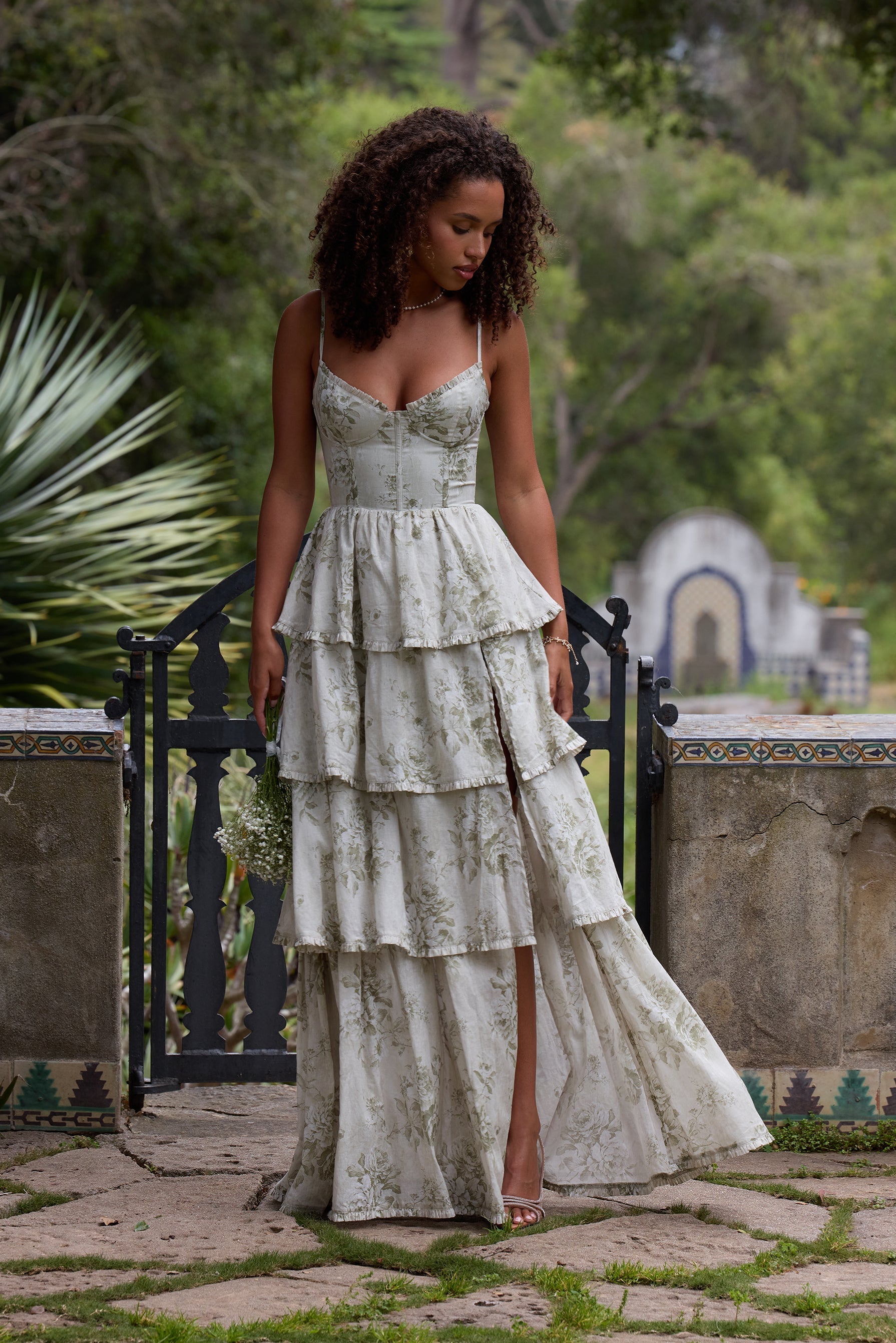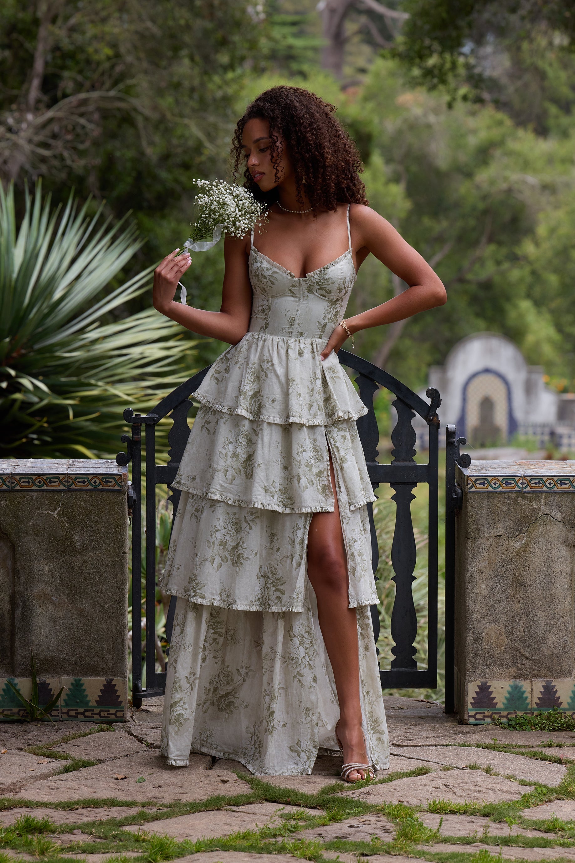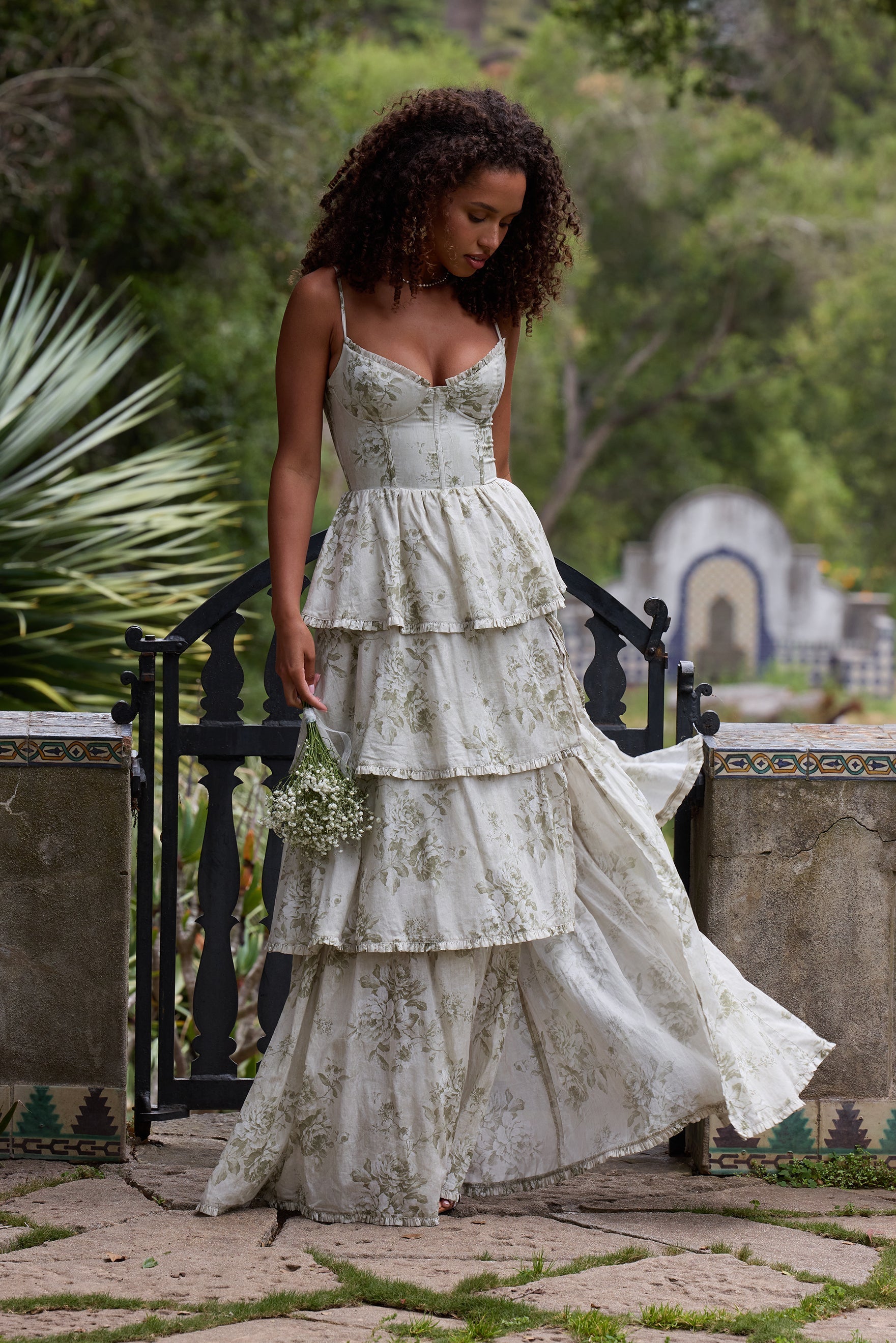 Meet Caterina, a beautifully tiered full length gown made in our lightest and softest cotton voile fabric. She's made in our delicate Sage Tapestry floral print, which features sage florals on a sage background, and flaunts a stunning corset bodice and darling ruffle details. She's a floral dream come true!