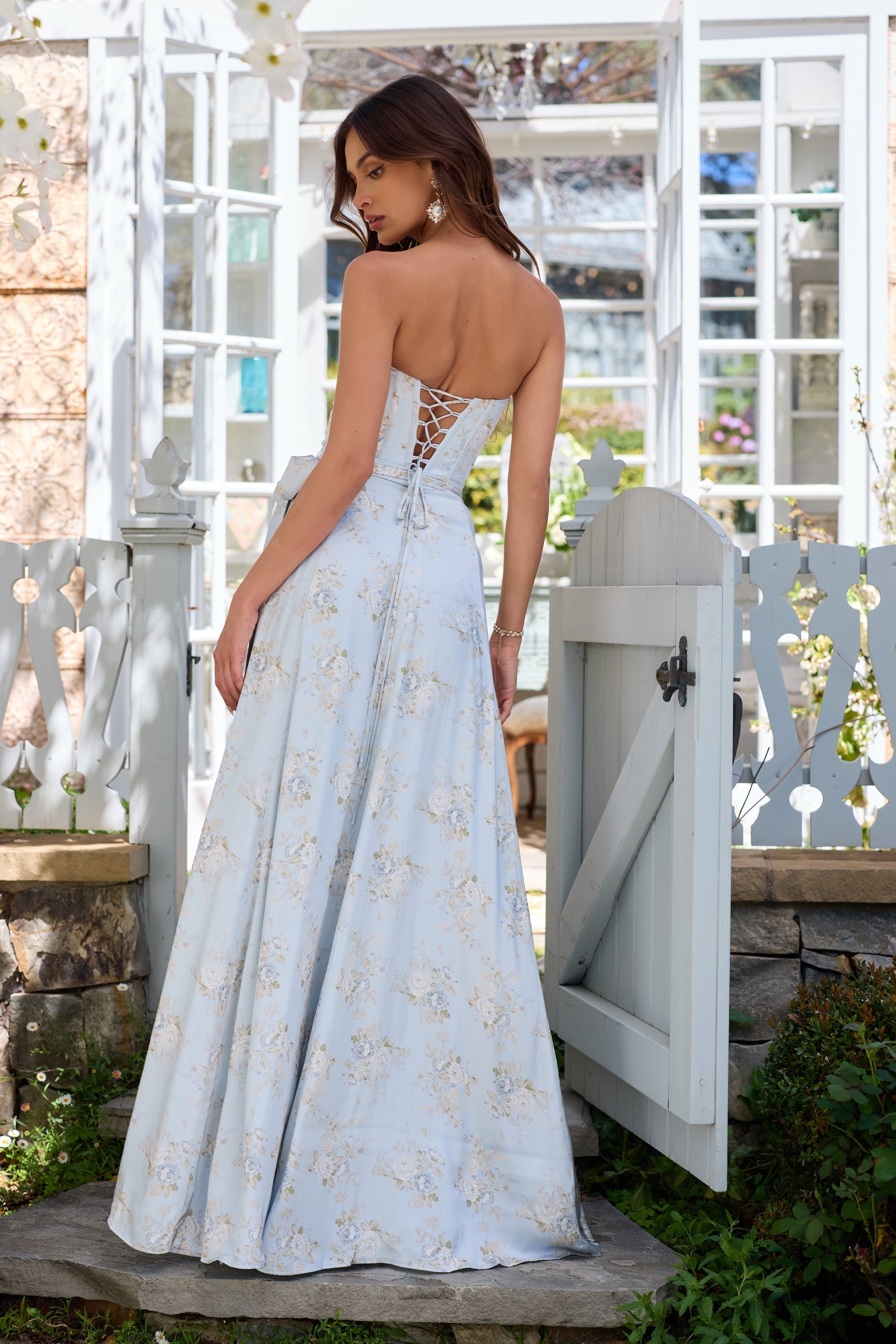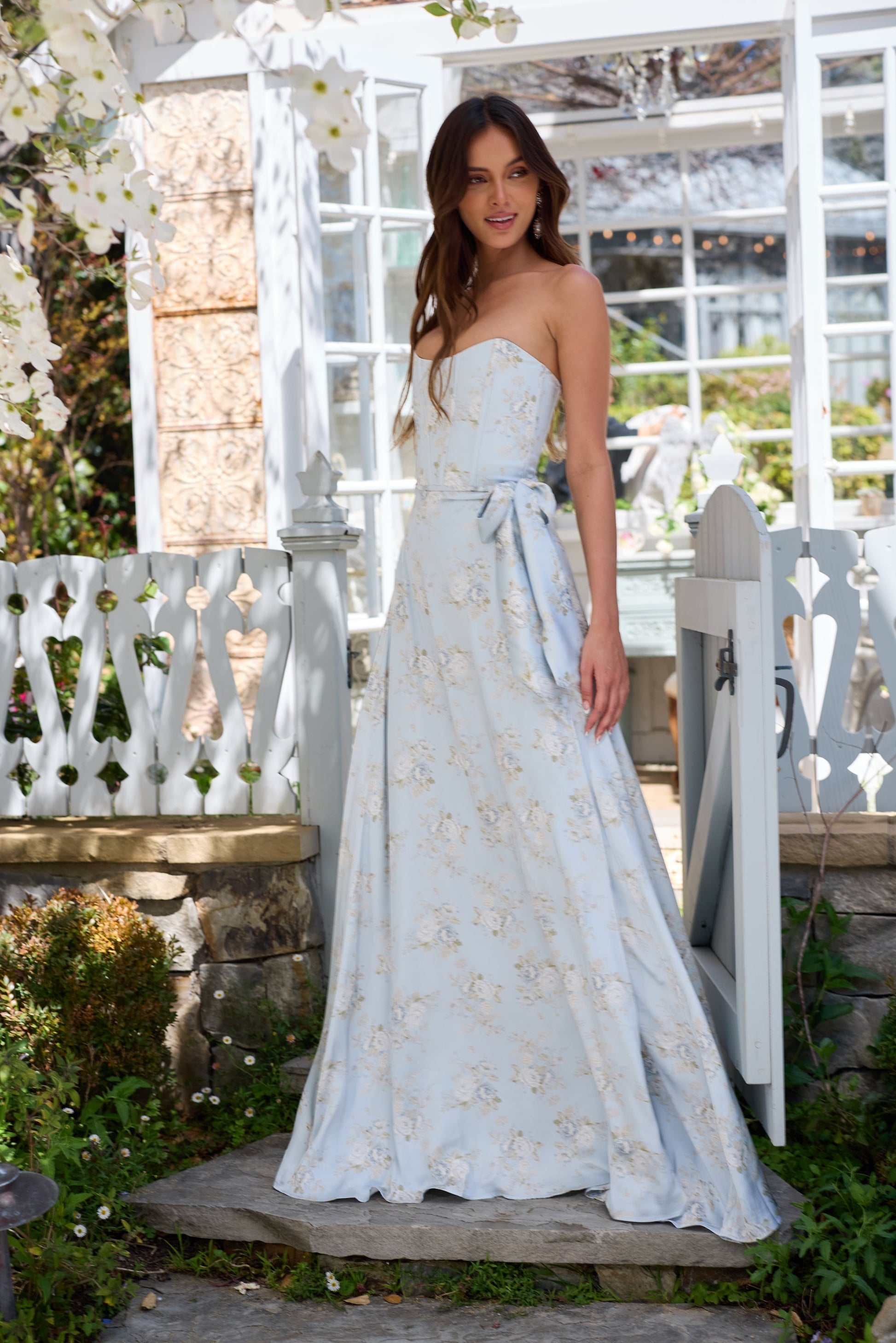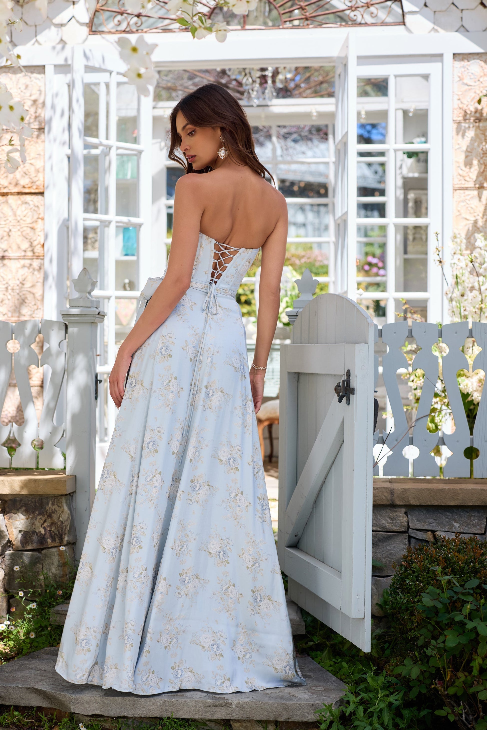 Meet Cecilia! She's a gorgeous strapless corset gown with a beautifully draped wrap-tie skirt and optional button and loop at the skirt slit. Fall in love with her laced corset back, side-front slit, and bow detail. She's made in Victorian Blue Roses, which features white and blue florals on a light blue background. She's classic, elegant, and effortlessly romantic!
