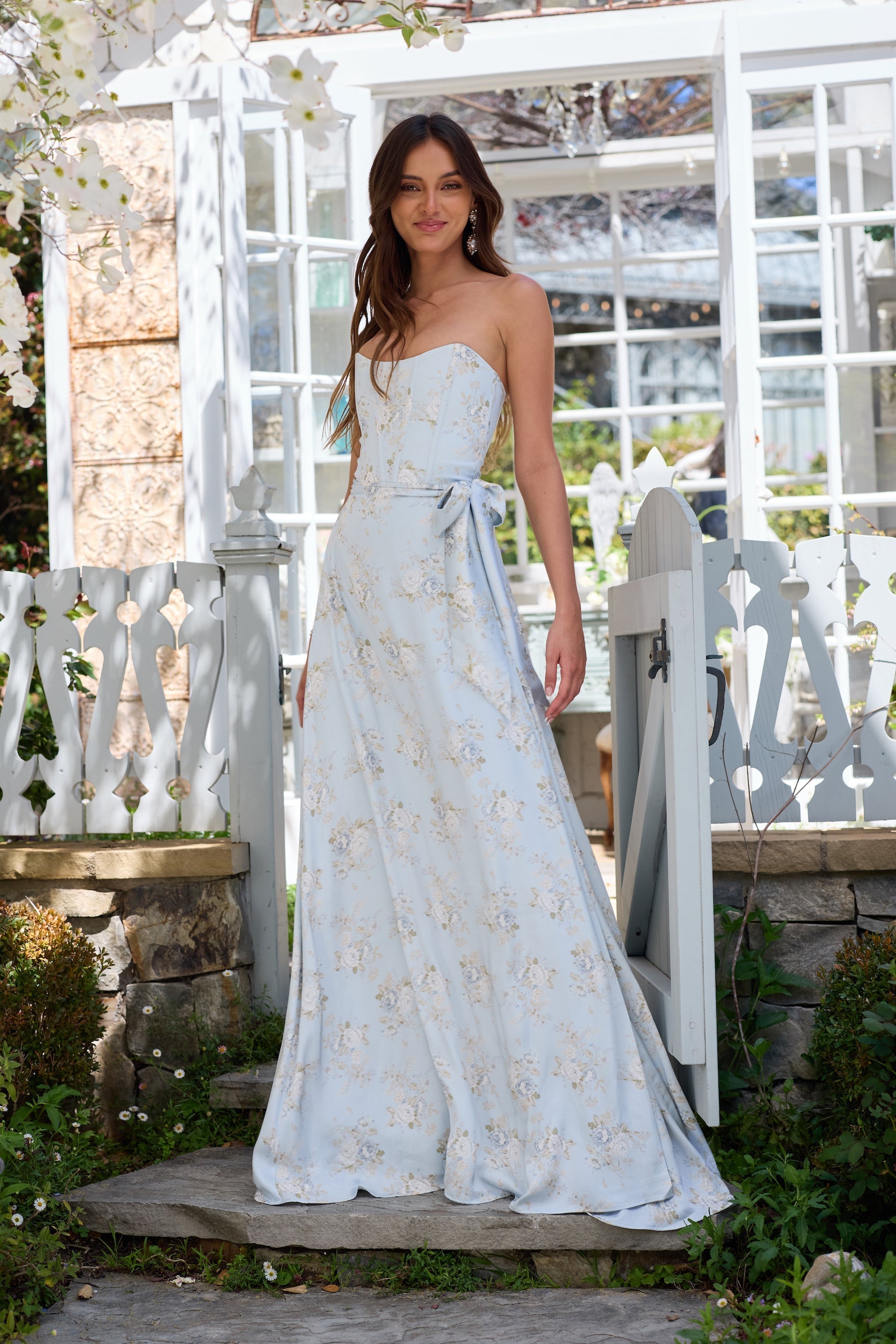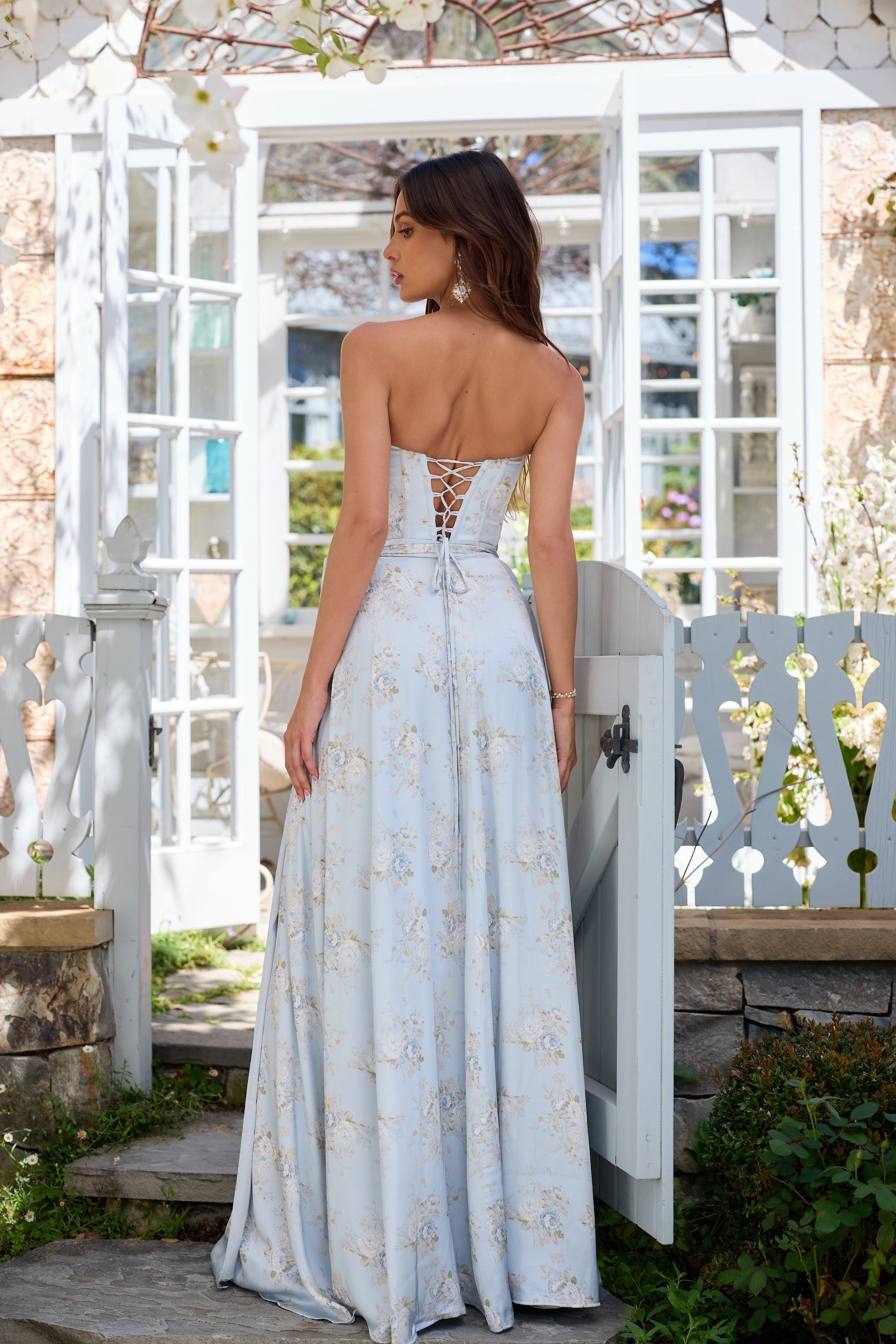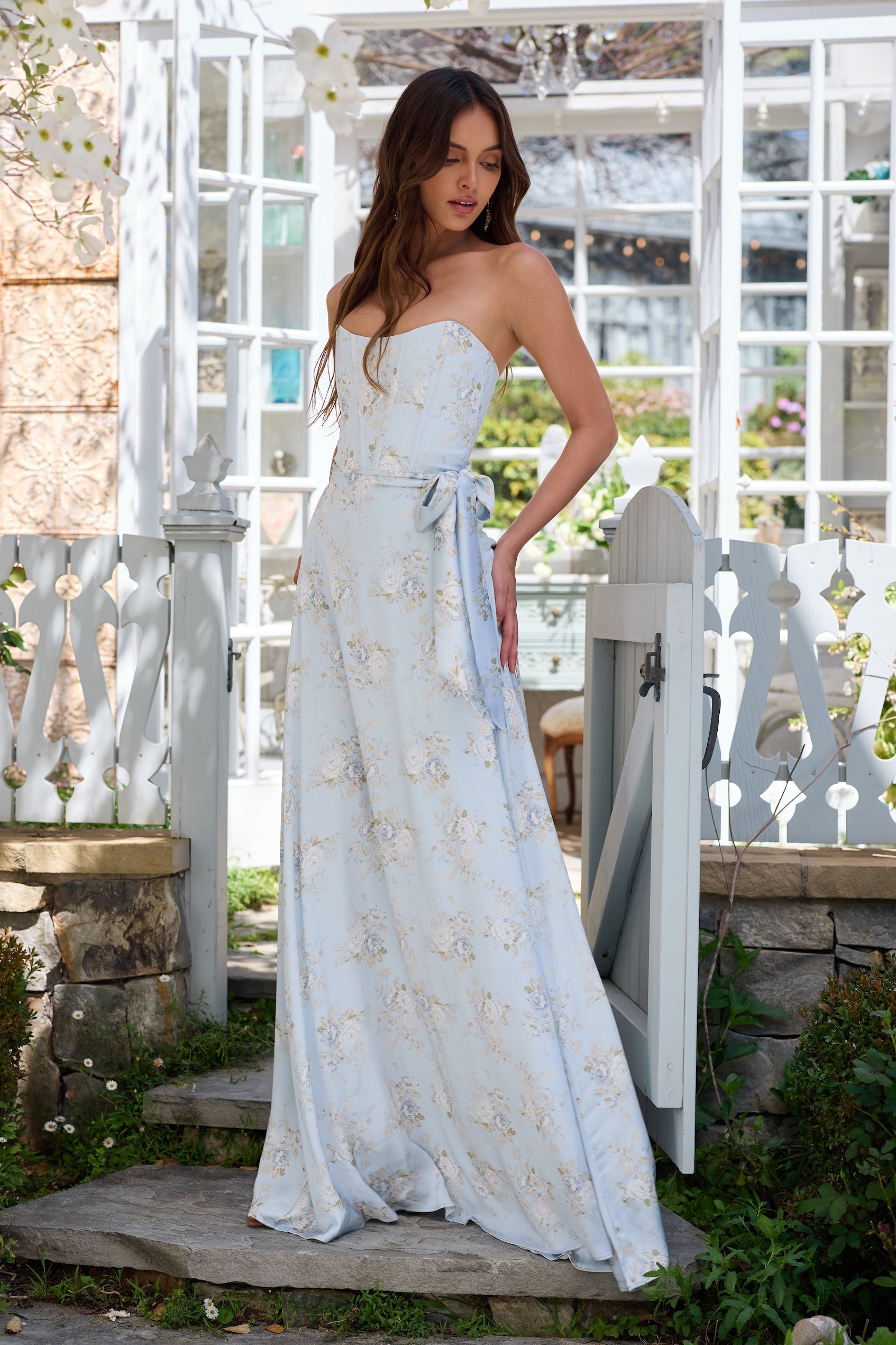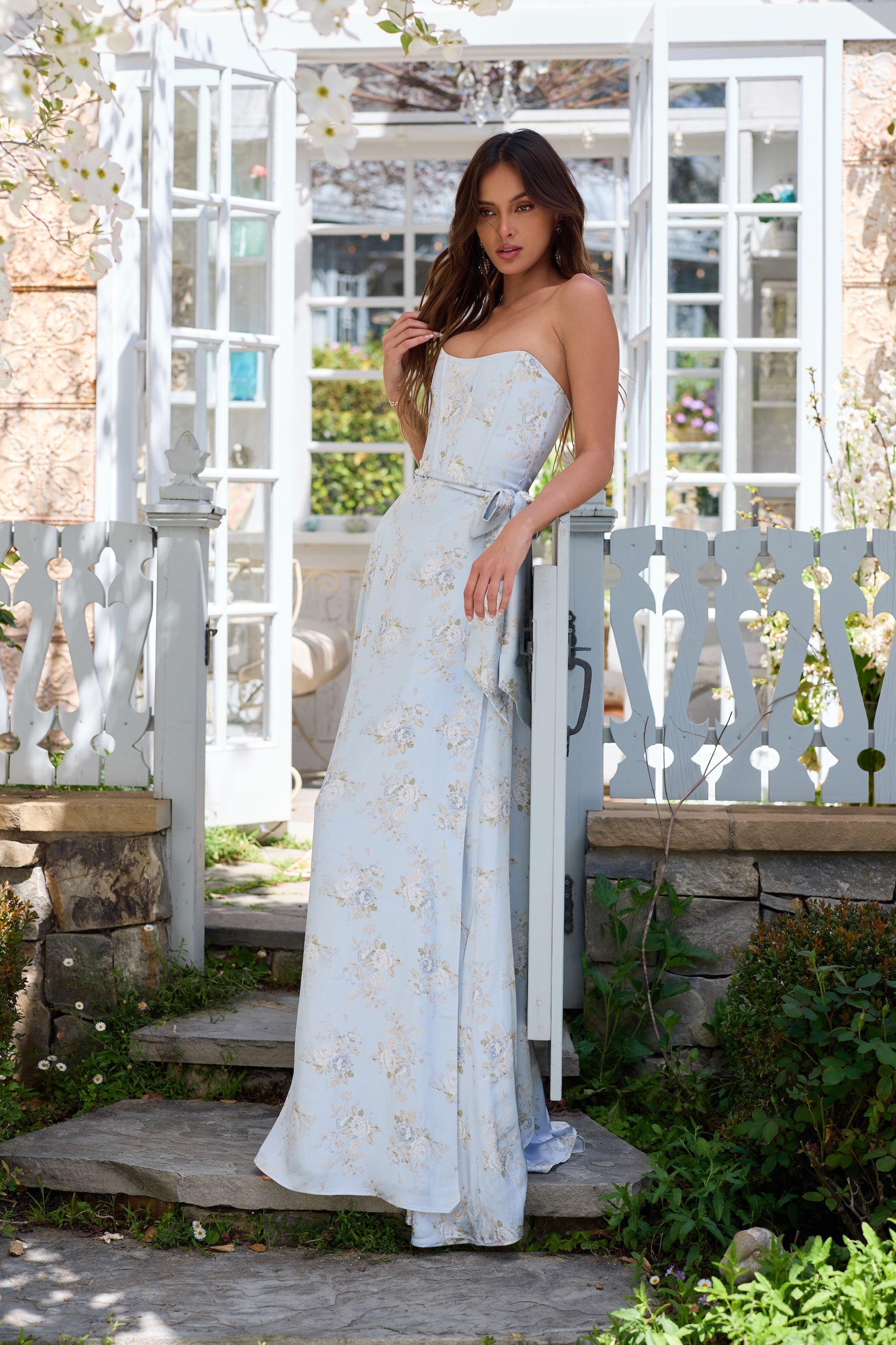 Meet Cecilia! She's a gorgeous strapless corset gown with a beautifully draped wrap-tie skirt and optional button and loop at the skirt slit. Fall in love with her laced corset back, side-front slit, and bow detail. She's made in Victorian Blue Roses, which features white and blue florals on a light blue background. She's classic, elegant, and effortlessly romantic!