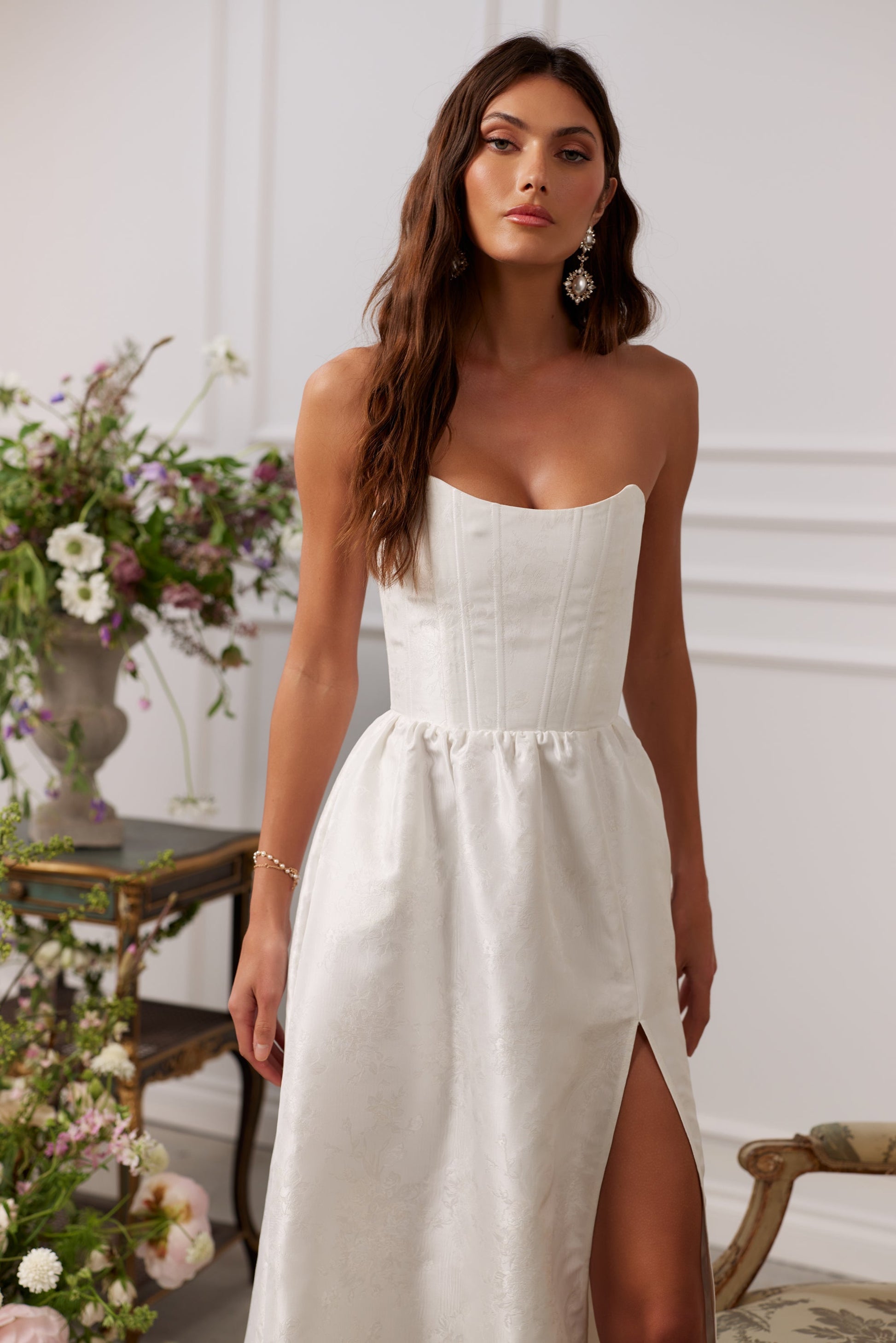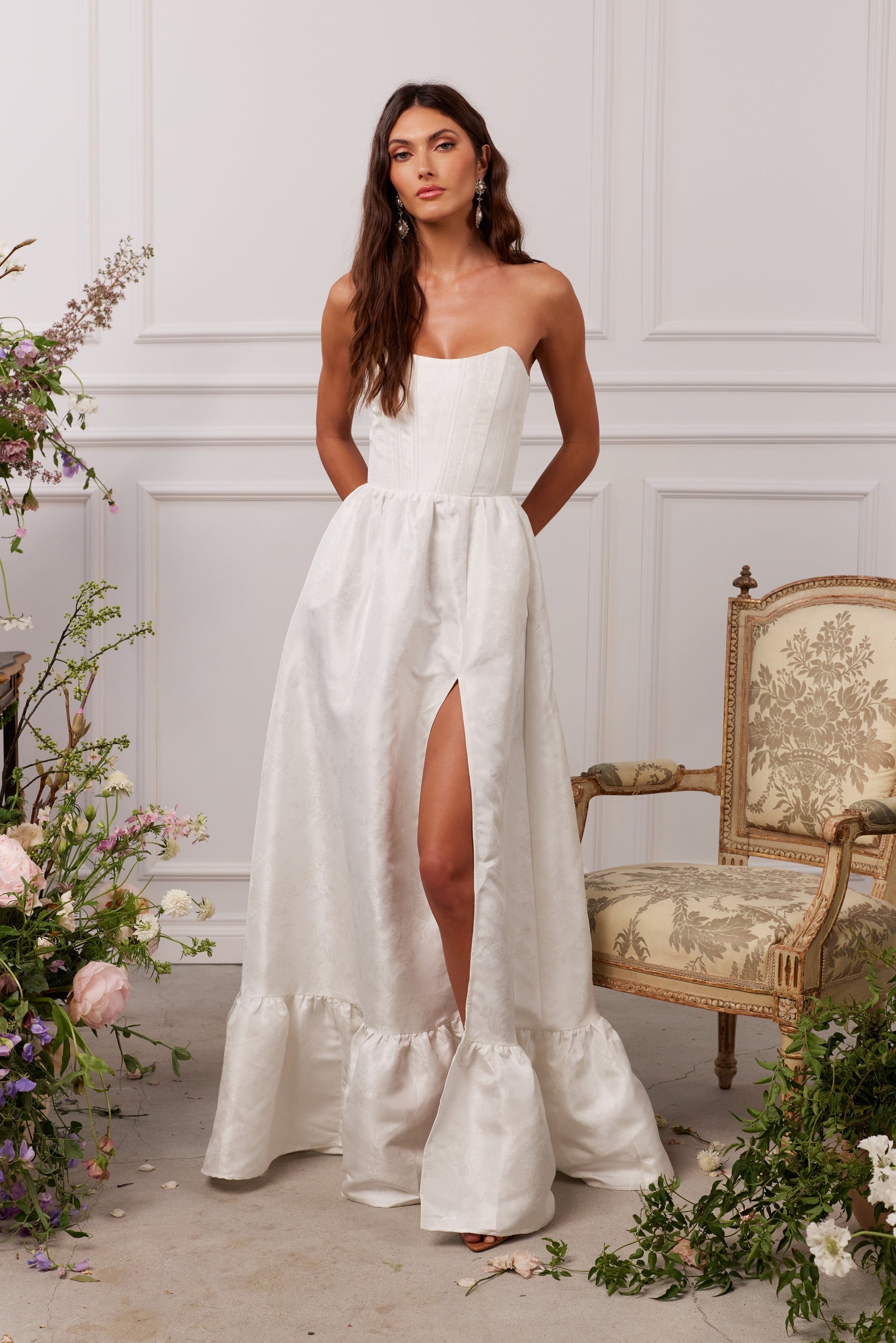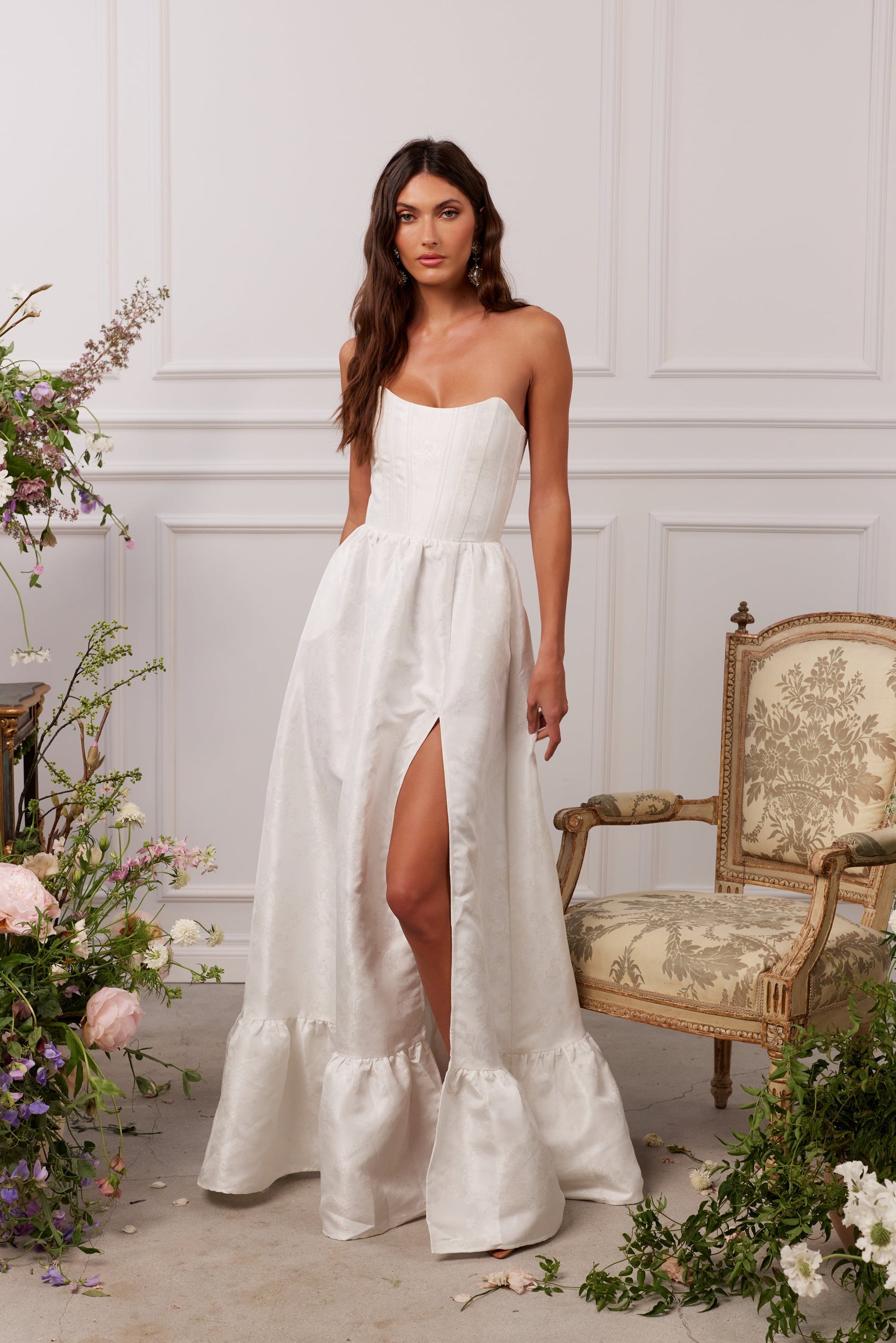 Introducing The Charlotte Dress! She's the perfect strapless gown featuring all things classy and elegant. She's made in our White Windsor Brocade, which features white florals on a white background, and flaunts a flirty side-front slit. Fall in love with beautiful boning details at the bodice, a stunningly laced corset back, and the sweetest gathered bottom ruffle tier for any and all occasions.
