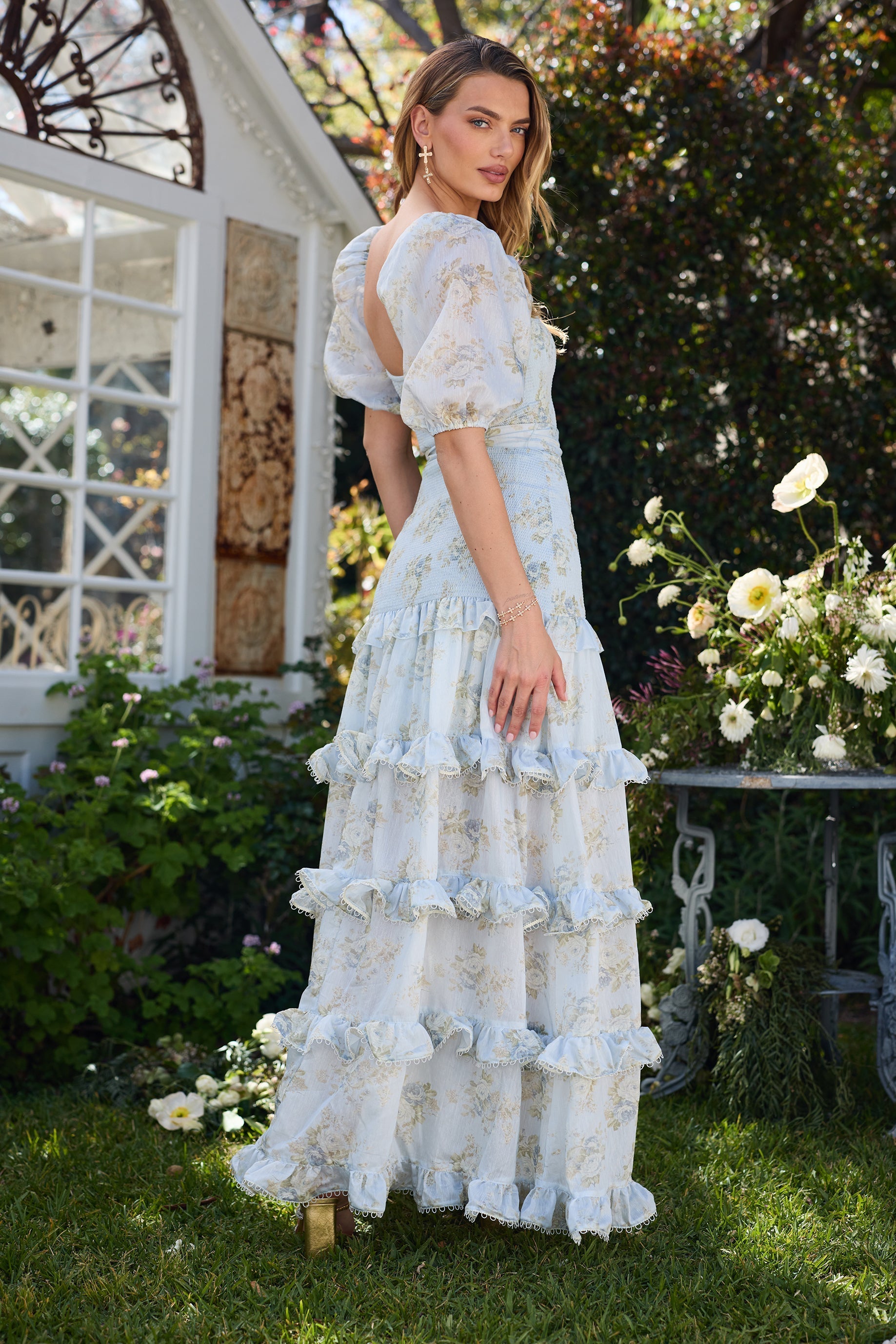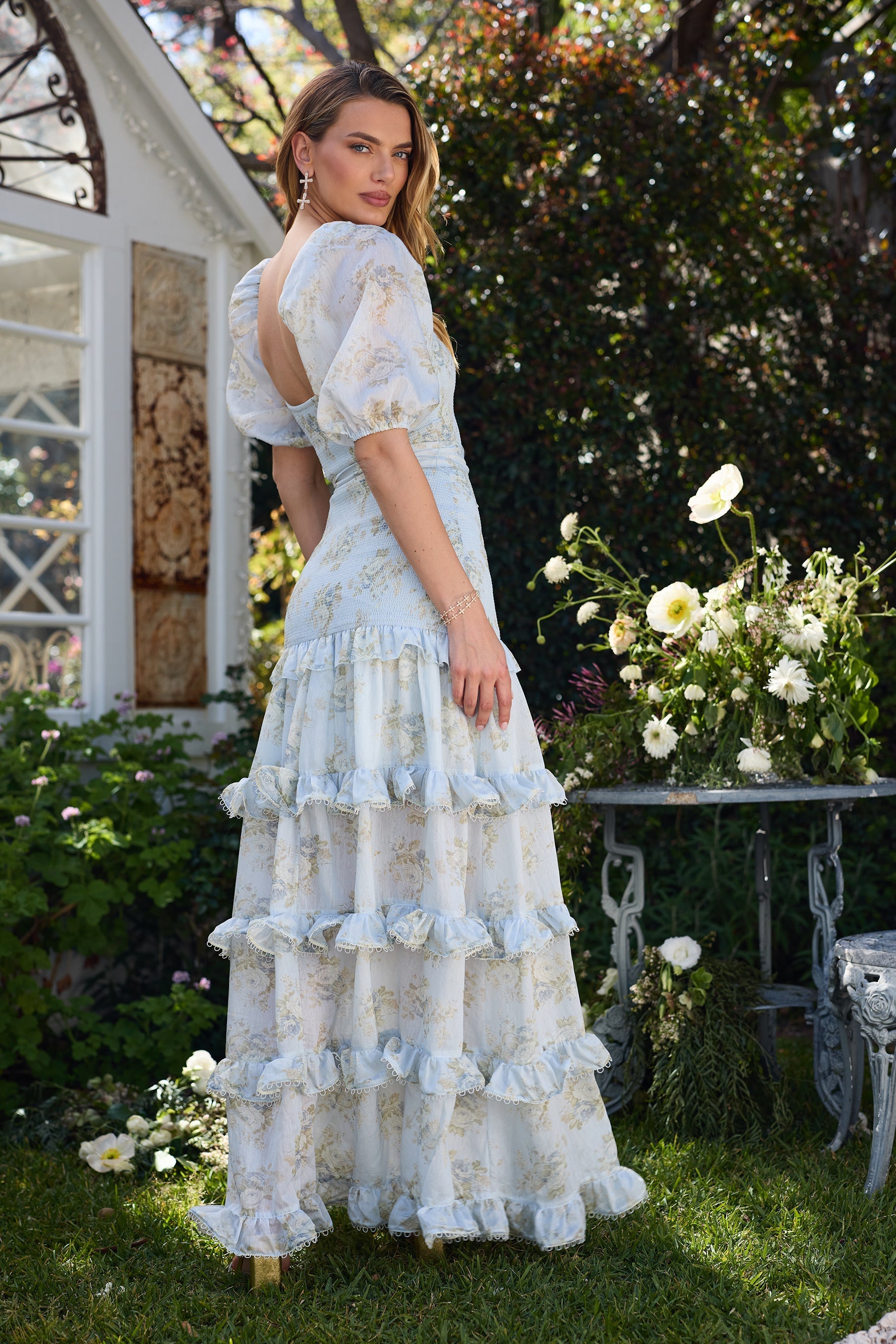 Meet The Elsie Dress! She's a full-length gown featuring a gorgeous ruched bodice and tiered ruffle skirt. She's made in textured organza and features our Victorian Blue Roses floral print, which flaunts white and blue florals on a light blue background. Fall in love with her charming poof sleeves and detachable self-tie belt. She's elegant, cute, and oh so comfy!