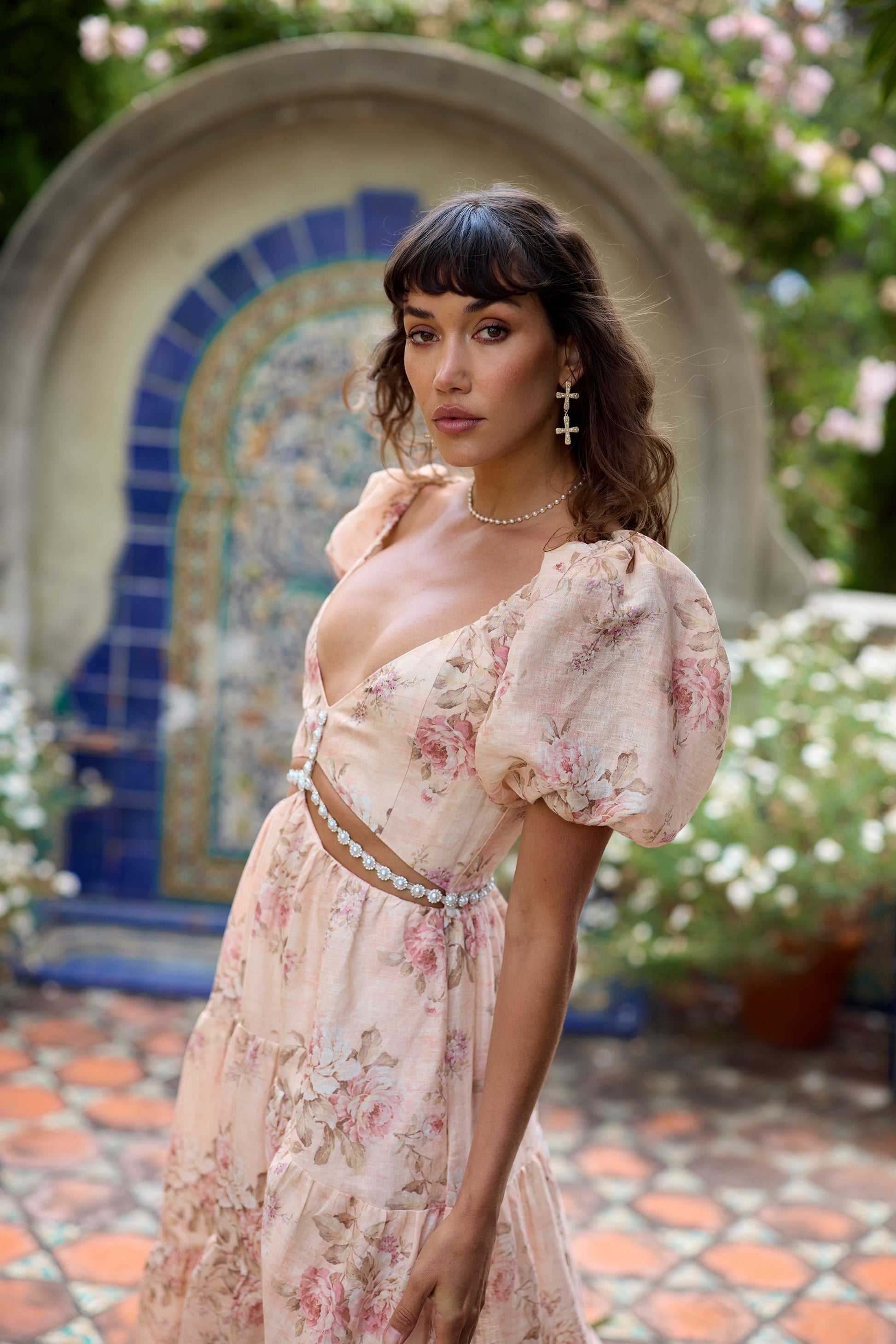 Meet Emma! She's a full-length gown featuring a stunning cutout bodice, high-low hem, and embellished with ornate pearl and crystal beaded trim. Fall in love with sweet poof sleeves, side pockets, ruched back panel and zipper closure, and gorgeously gathered tiers. Made from our beautiful Peach Tapestry linen, which flaunts pink florals on a peachy pink background, she's truly a dream.