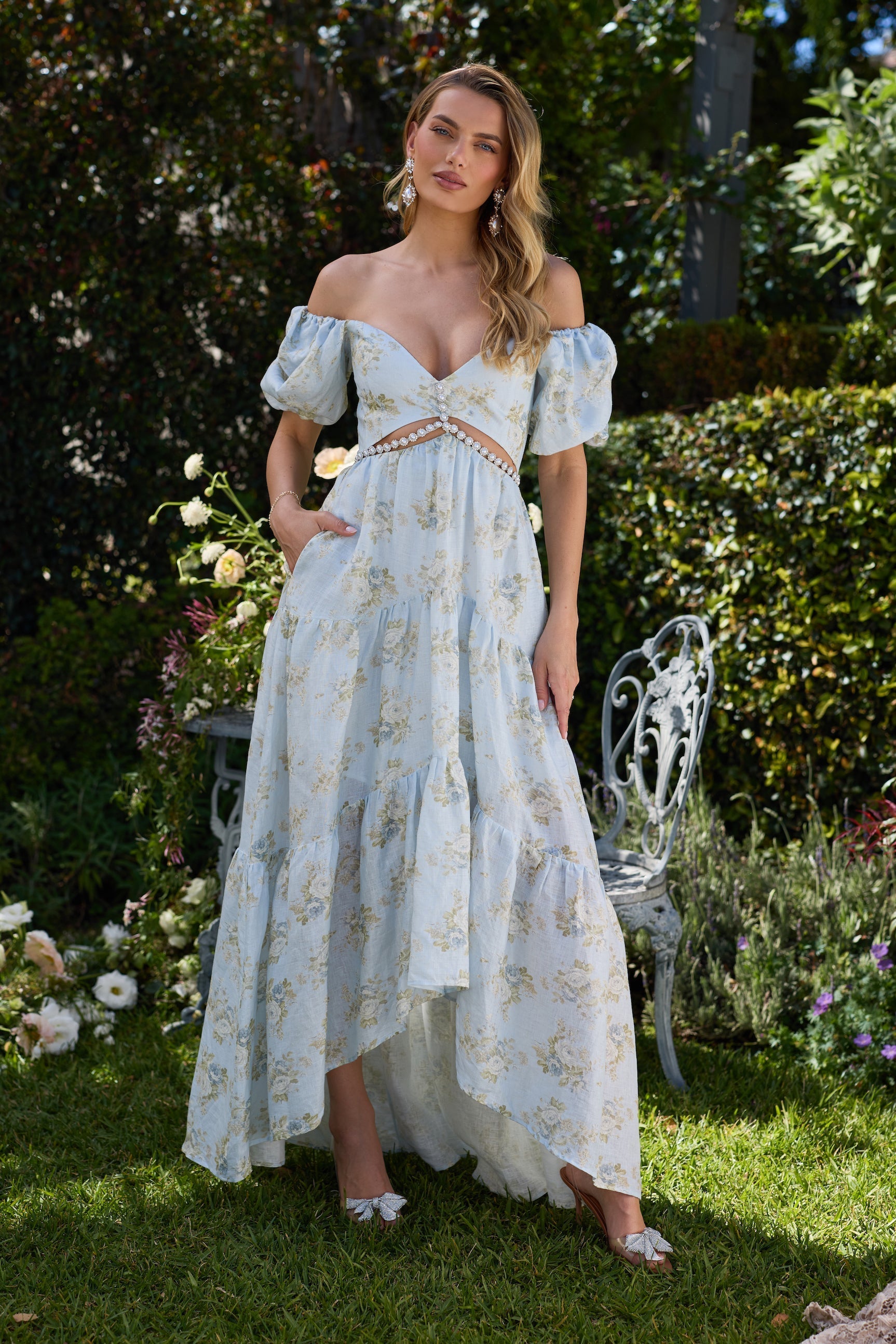 Meet Emma! She's a full-length gown featuring a stunning cutout bodice, high-low hem, and embellished with ornate pearl and crystal beaded trim. Fall in love with sweet poof sleeves, side pockets, ruched back panel and zipper closure, and gorgeously gathered tiers. Made from our beautiful Victorian Blue Roses linen, which flaunts white and blue florals on a light blue background, she's truly a dream.