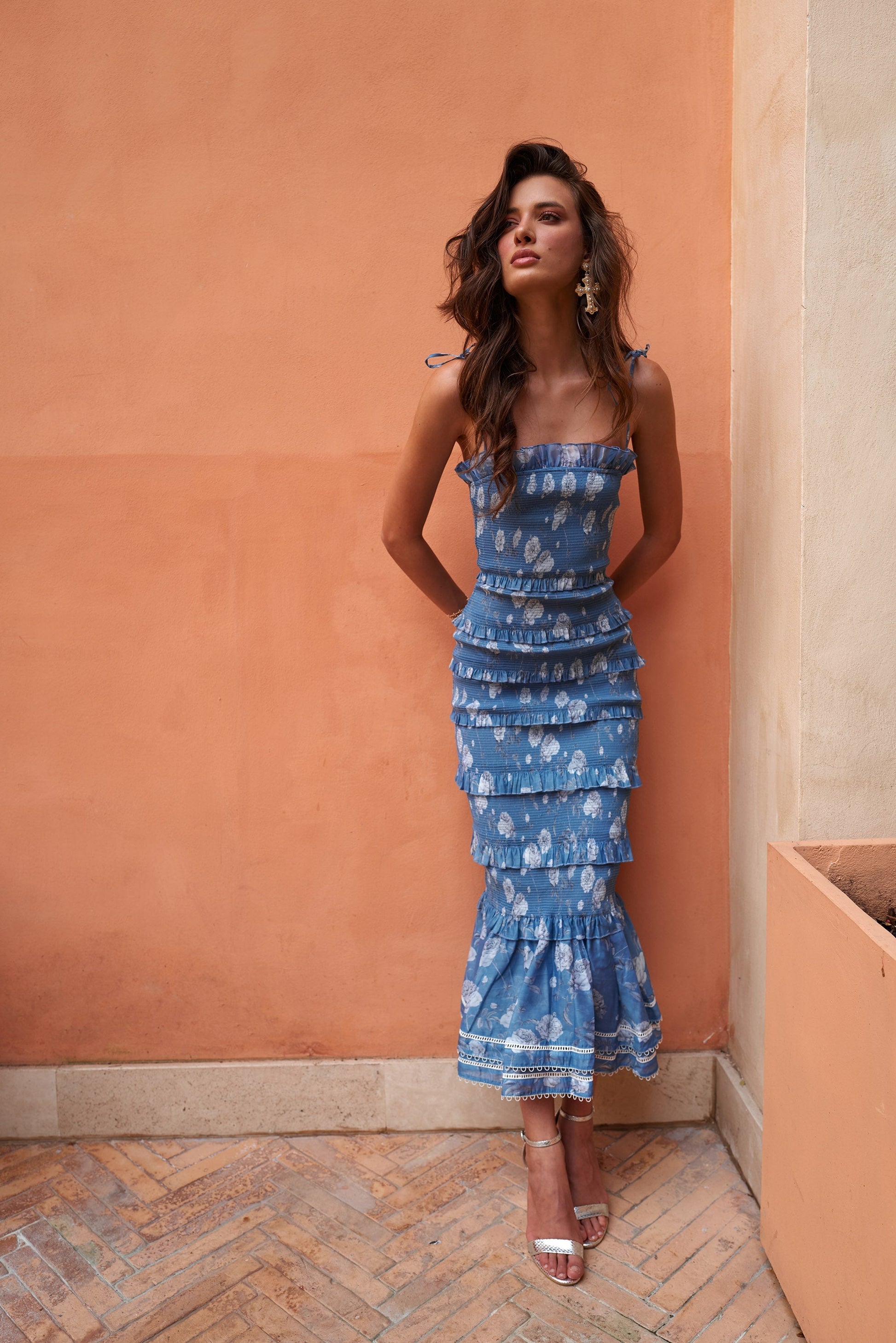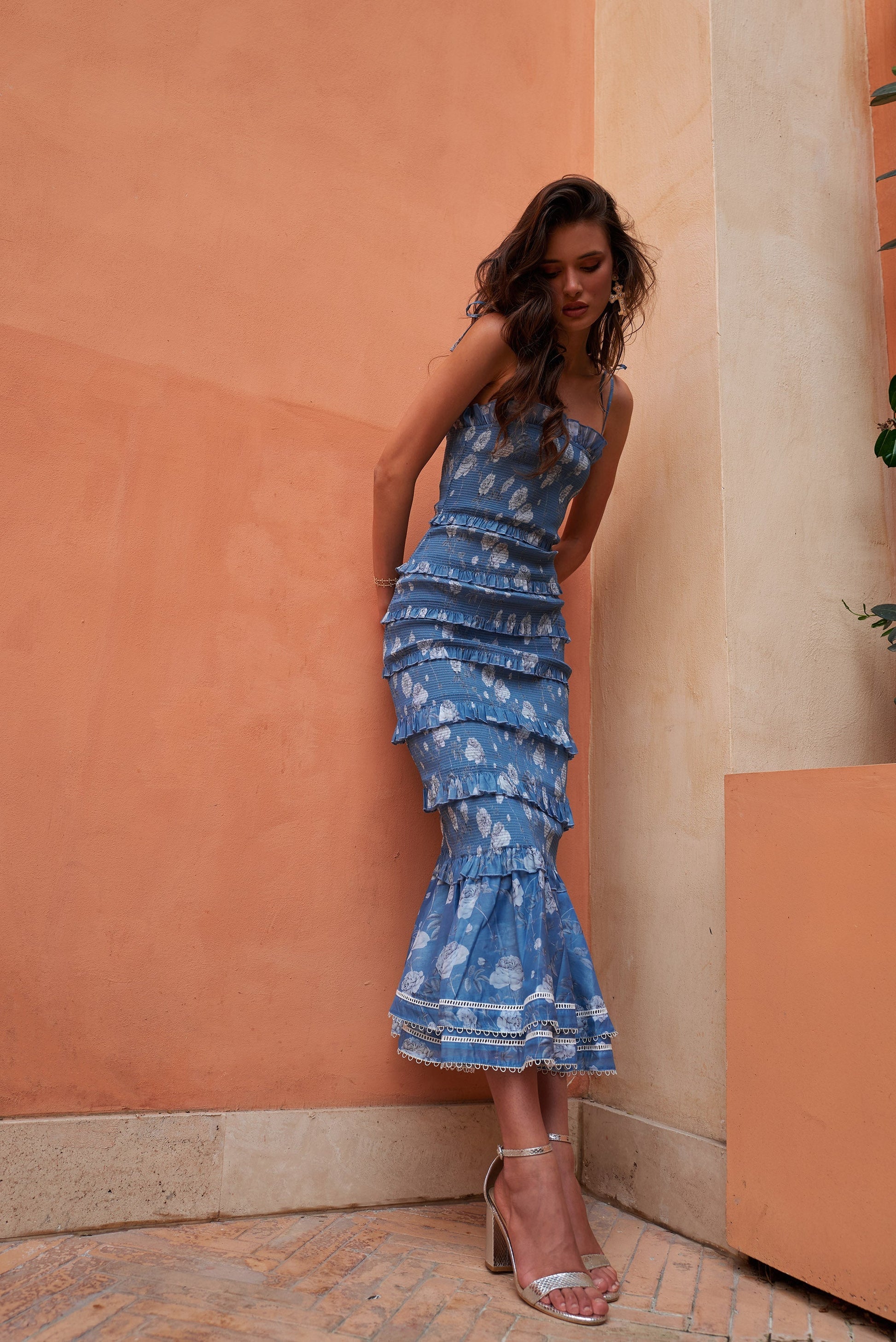 The Geranium dress is a fitted floral midi dress perfect for any garden party! She is made with elastic ruching for easy fit and comfort. She is accented with ruffles all the way down and finished with a gathered flounce at the hem. She is made in our Dusk Blue Roses printed organza, which features light grey florals on a blue background, and lined with a cotton jersey for a soft inside touch.