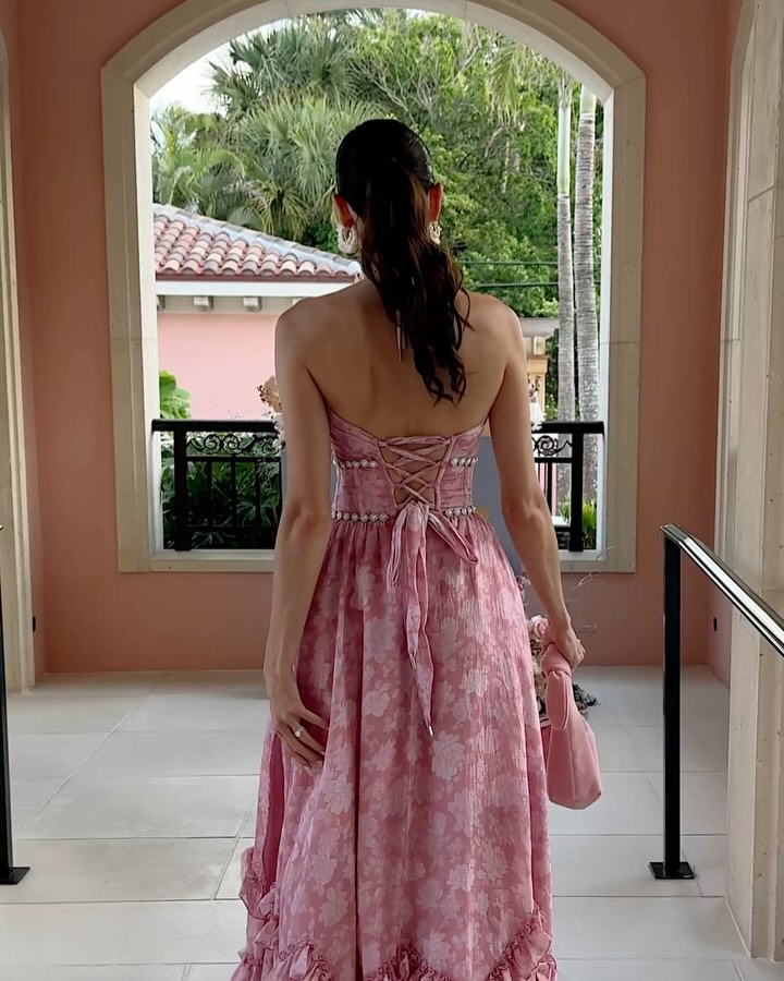 Introducing The Pink Tapestry Rose Scarlet Dress! She's a stunning halter corset gown embellished with dazzling pearl and crystal beaded trim. She flaunts a beautifully gathered skirt and is made in our pink Tapestry Rose textured organza, which features dusty red florals on a light pink  background. Finished with dreamy ruffle details, side-front slit, and laced corset back, she'll surely turn heads.