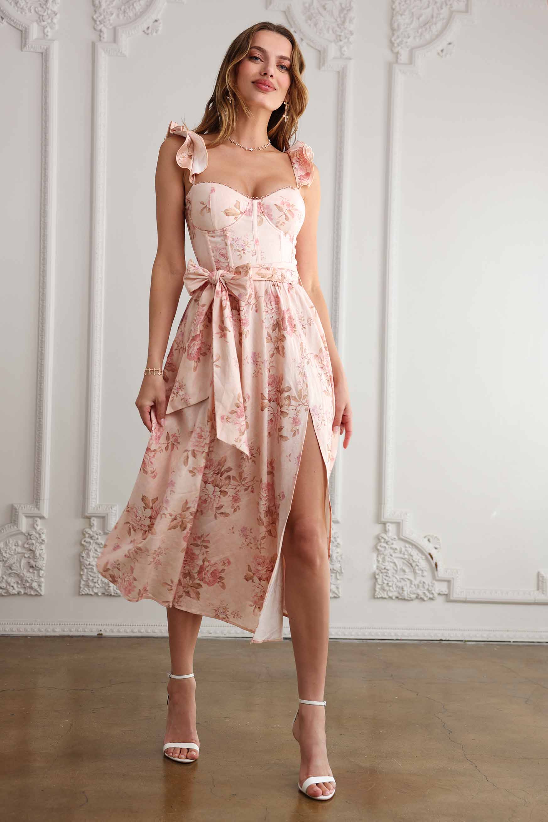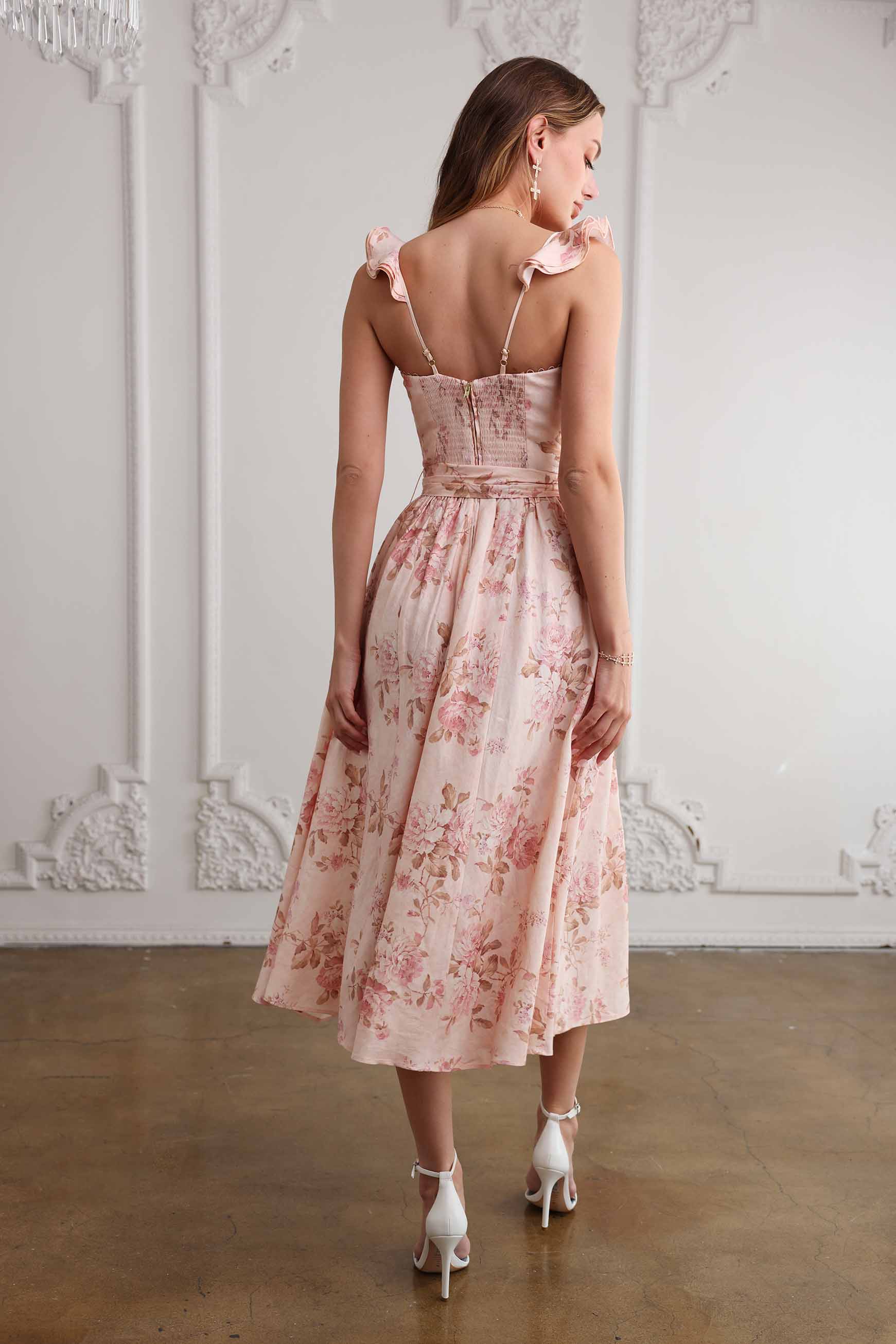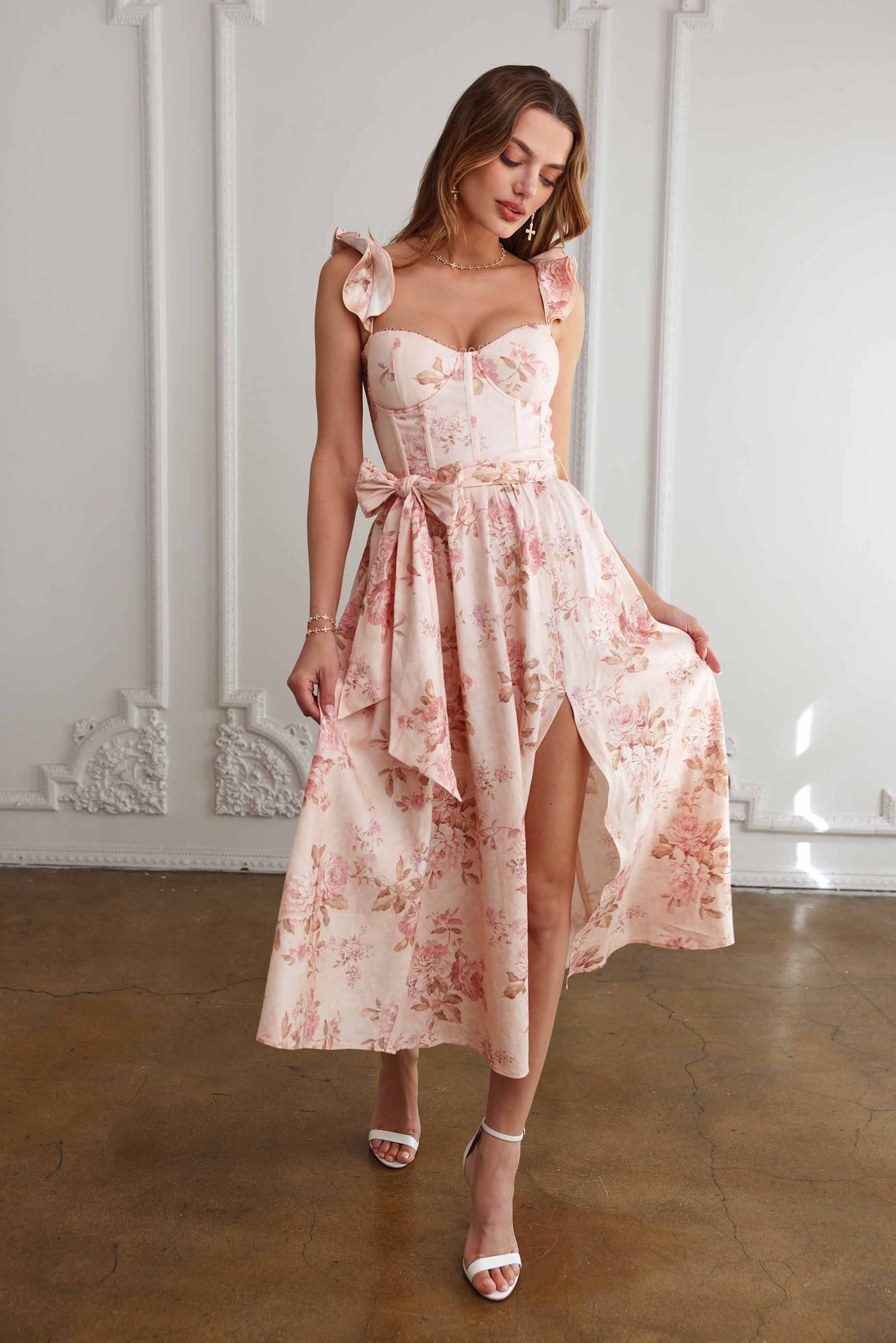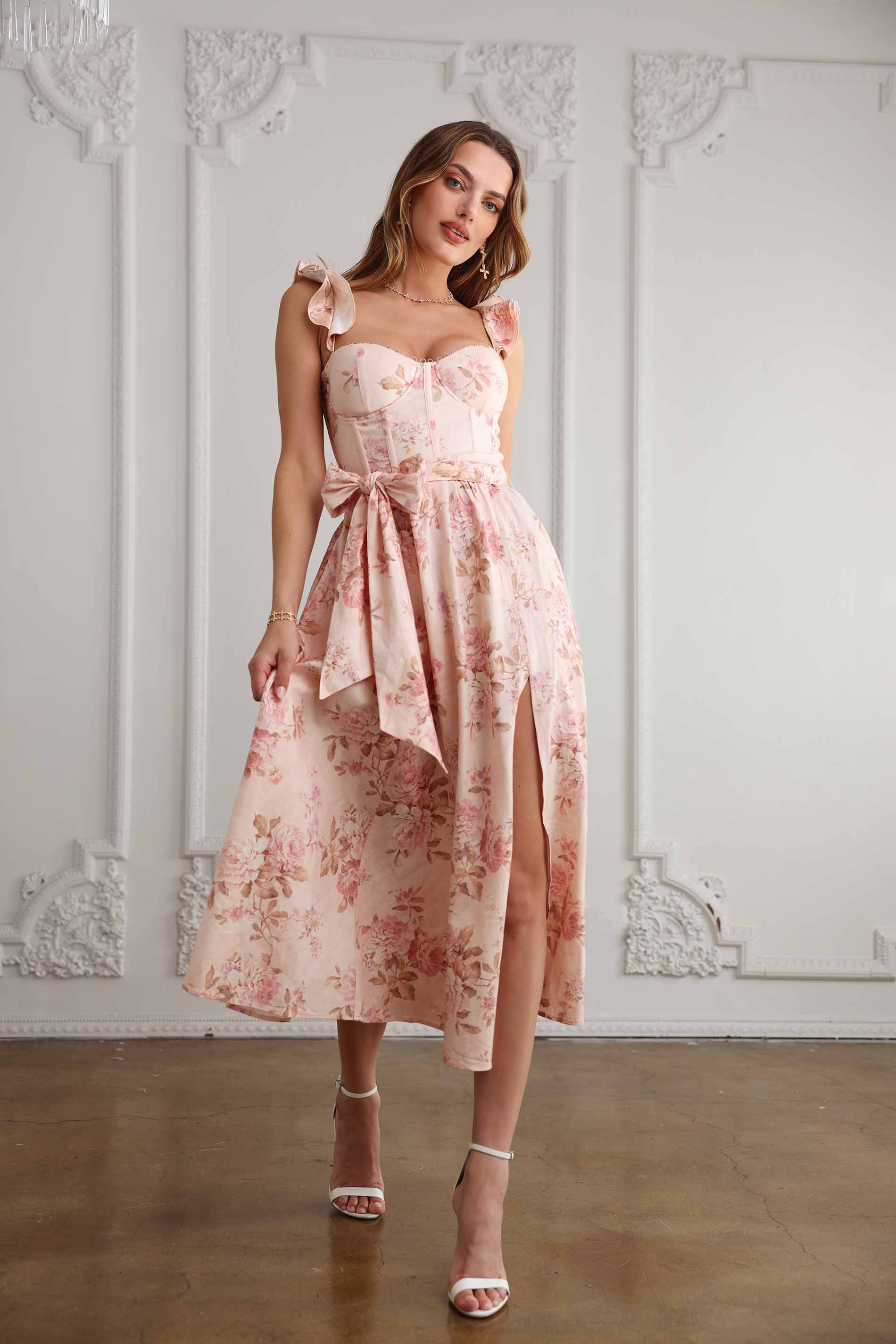 The Vera Dress is an ankle length corset dress featuring a side front slit and bow-tie belt. She's made in our romantic Peach Tapestry printed stretch linen and adorned with dainty loop trim and the sweetest ruffle details. She's classic, sophisticated, and ready for evenings out!