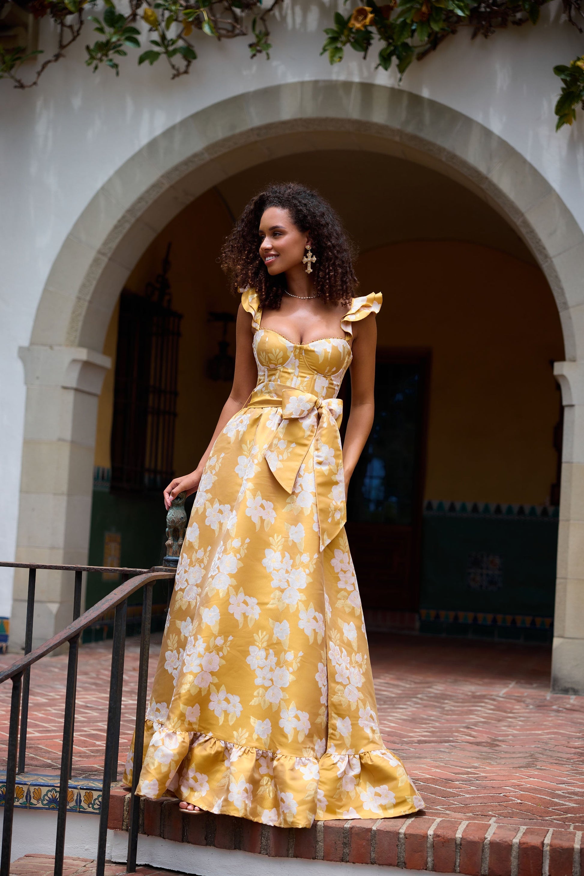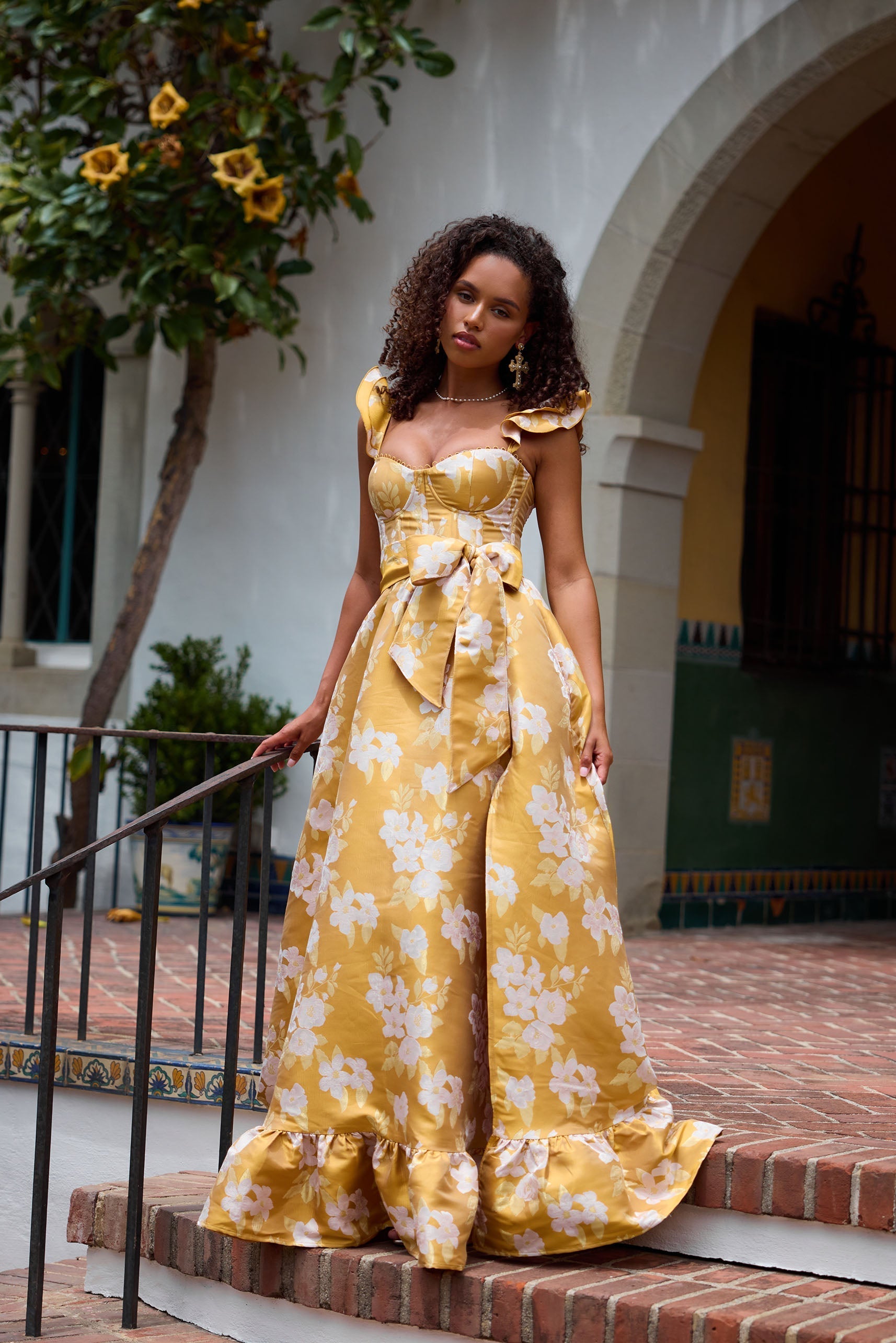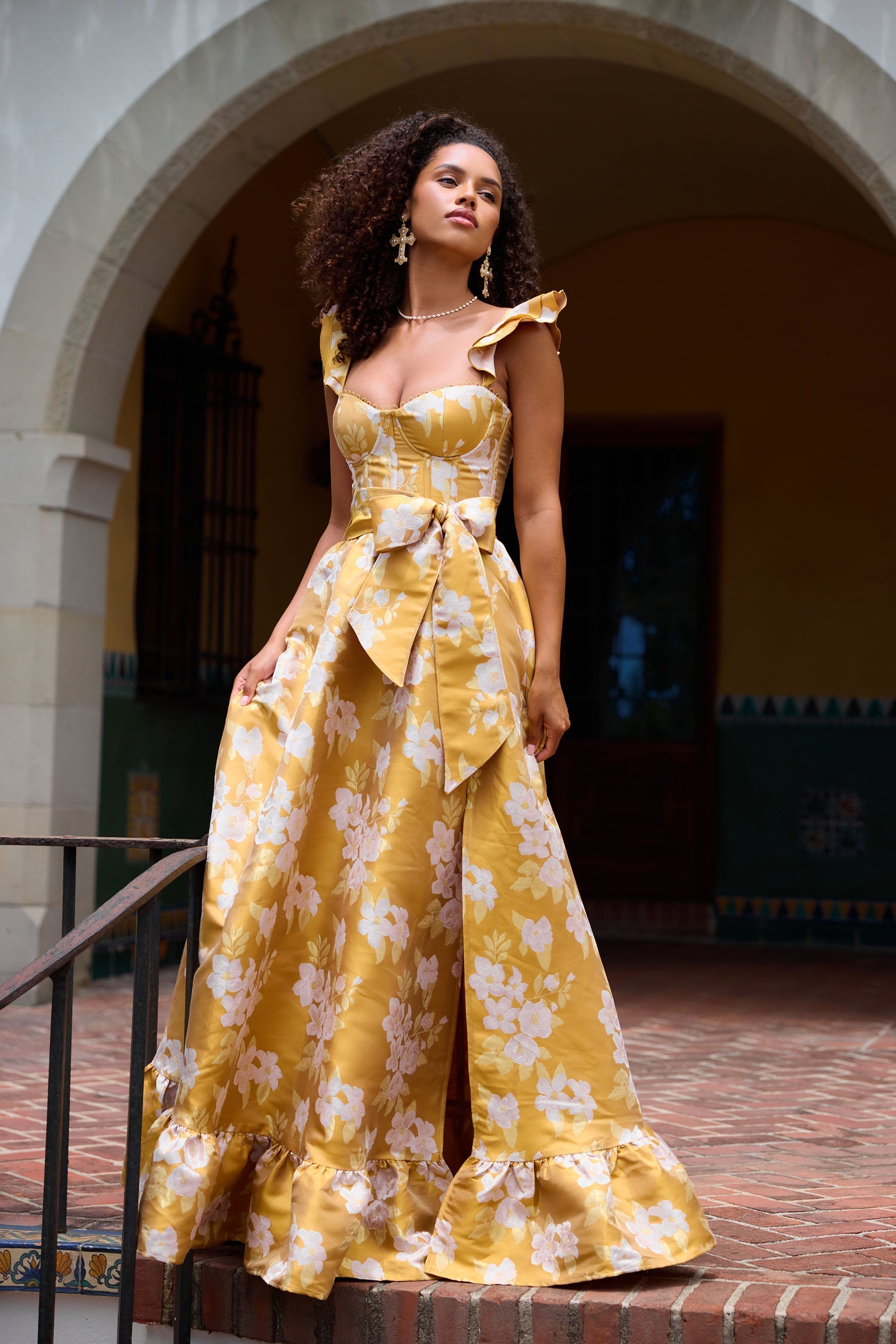 The Veronica Dress is a full-length corset dress featuring a side front slit and bow-tie belt. She's made in our romantic Gold Baroque Floral, which flaunts soft pink flowers on a gold background, and adorned with dainty loop trim and the sweetest ruffle details. She's classic, sophisticated, and ready for evenings out!