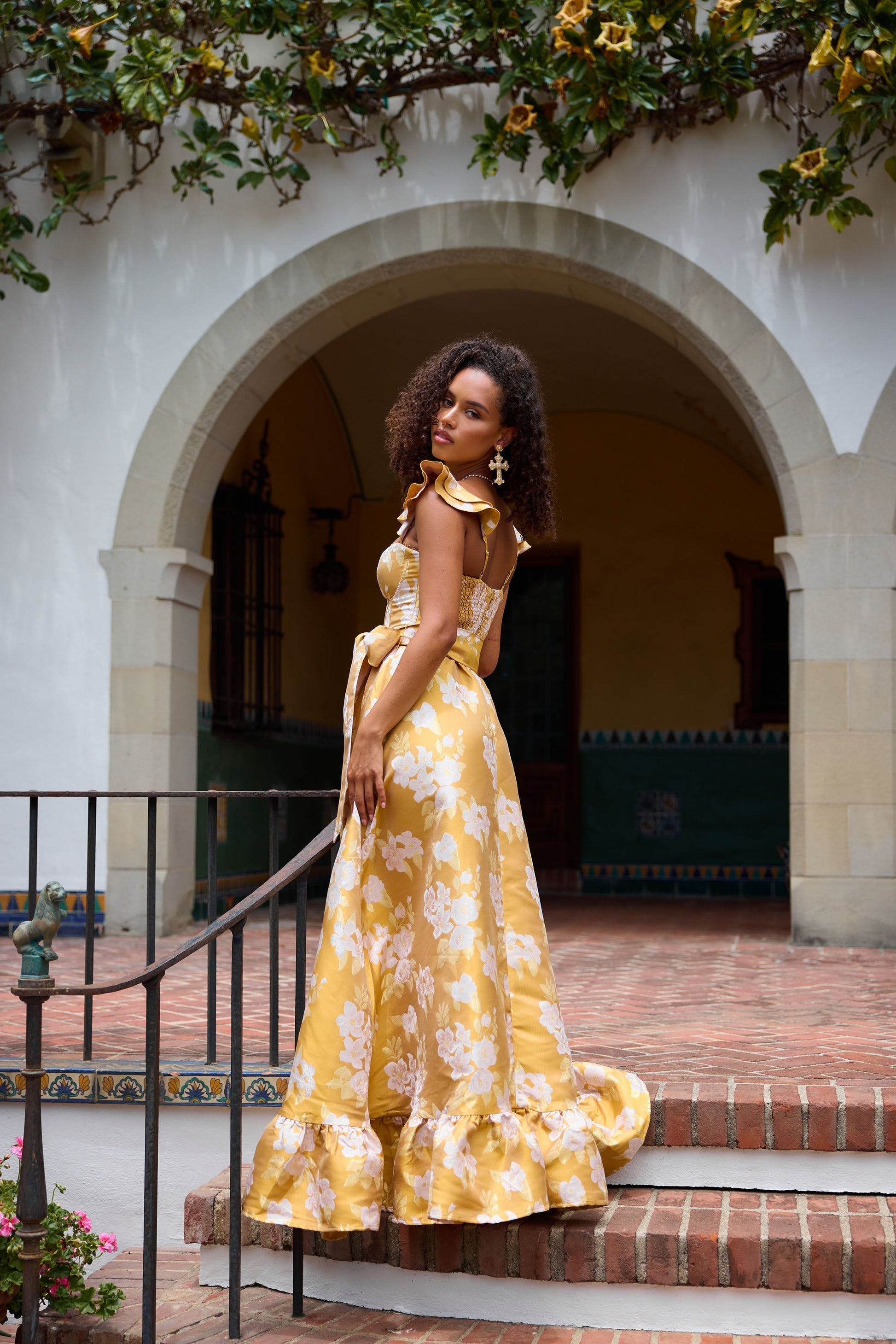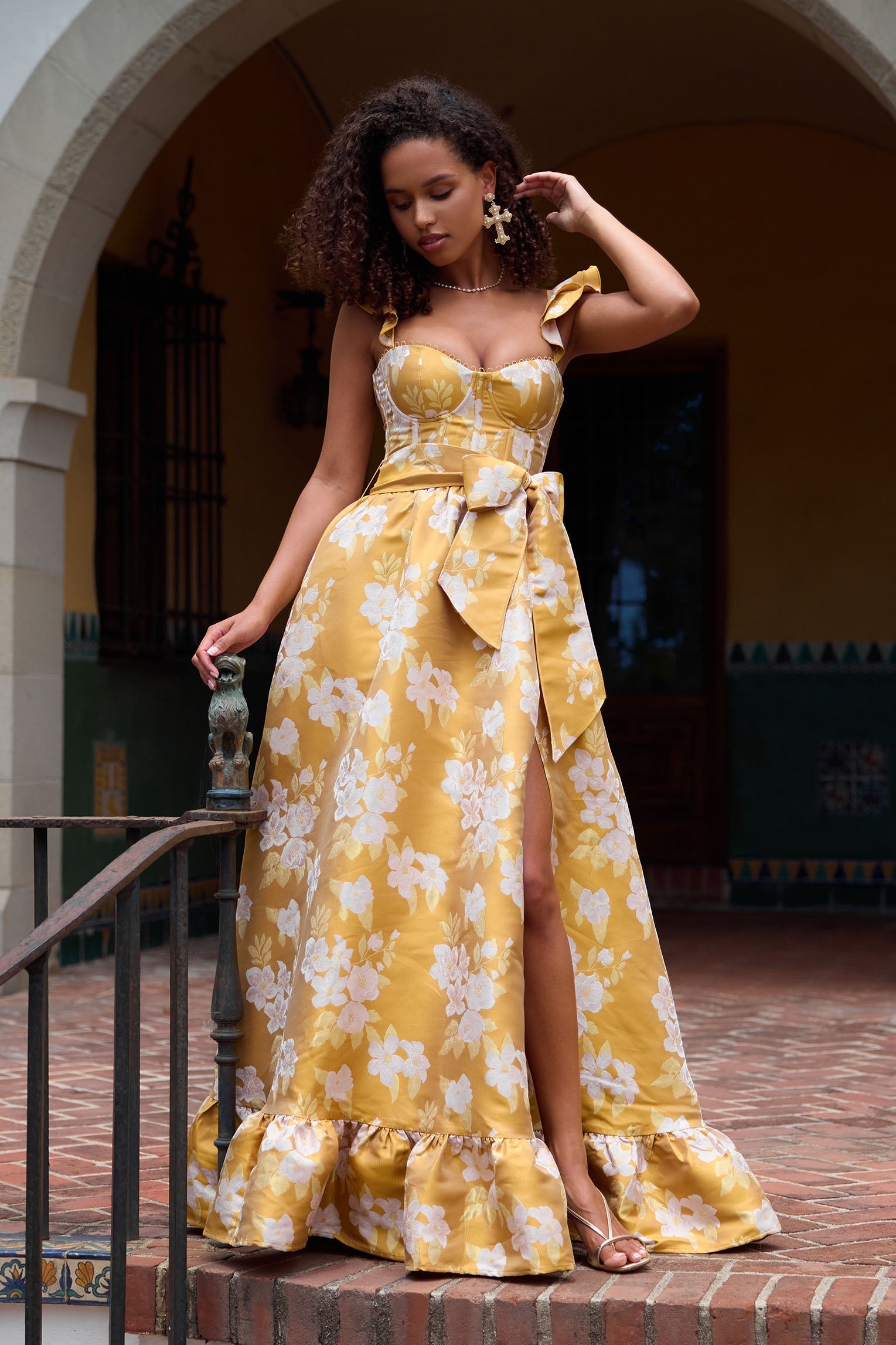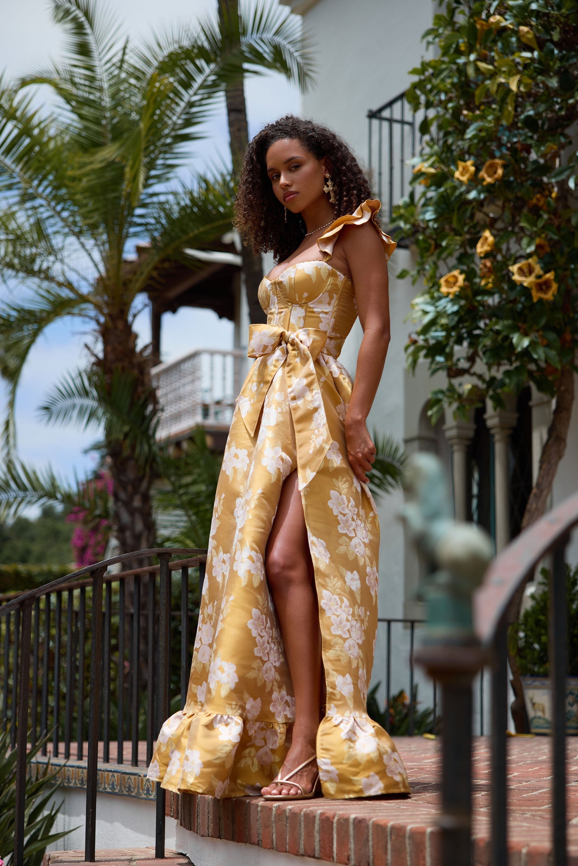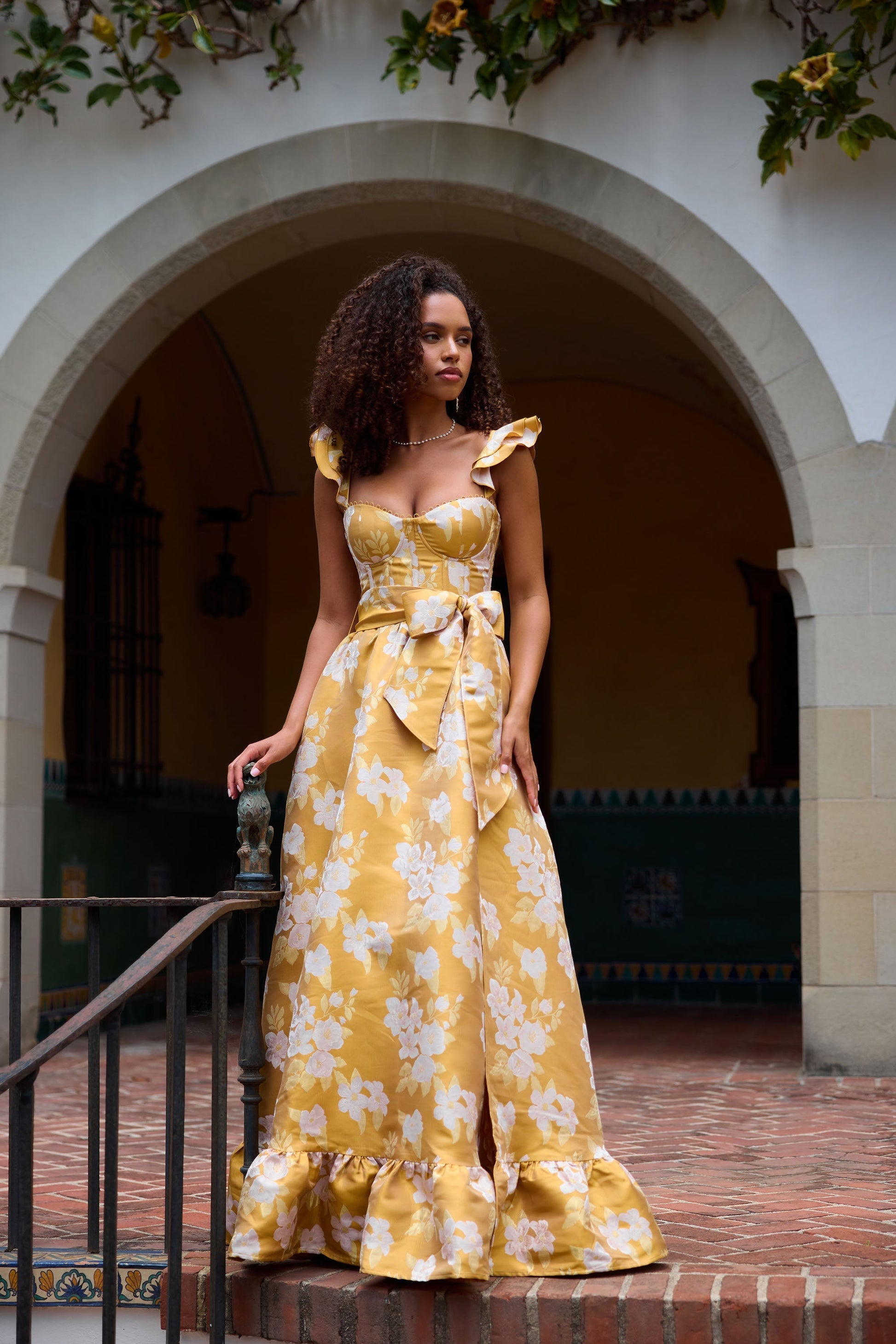 The Veronica Dress is a full-length corset dress featuring a side front slit and bow-tie belt. She's made in our romantic Gold Baroque Floral, which flaunts soft pink flowers on a gold background, and adorned with dainty loop trim and the sweetest ruffle details. She's classic, sophisticated, and ready for evenings out!