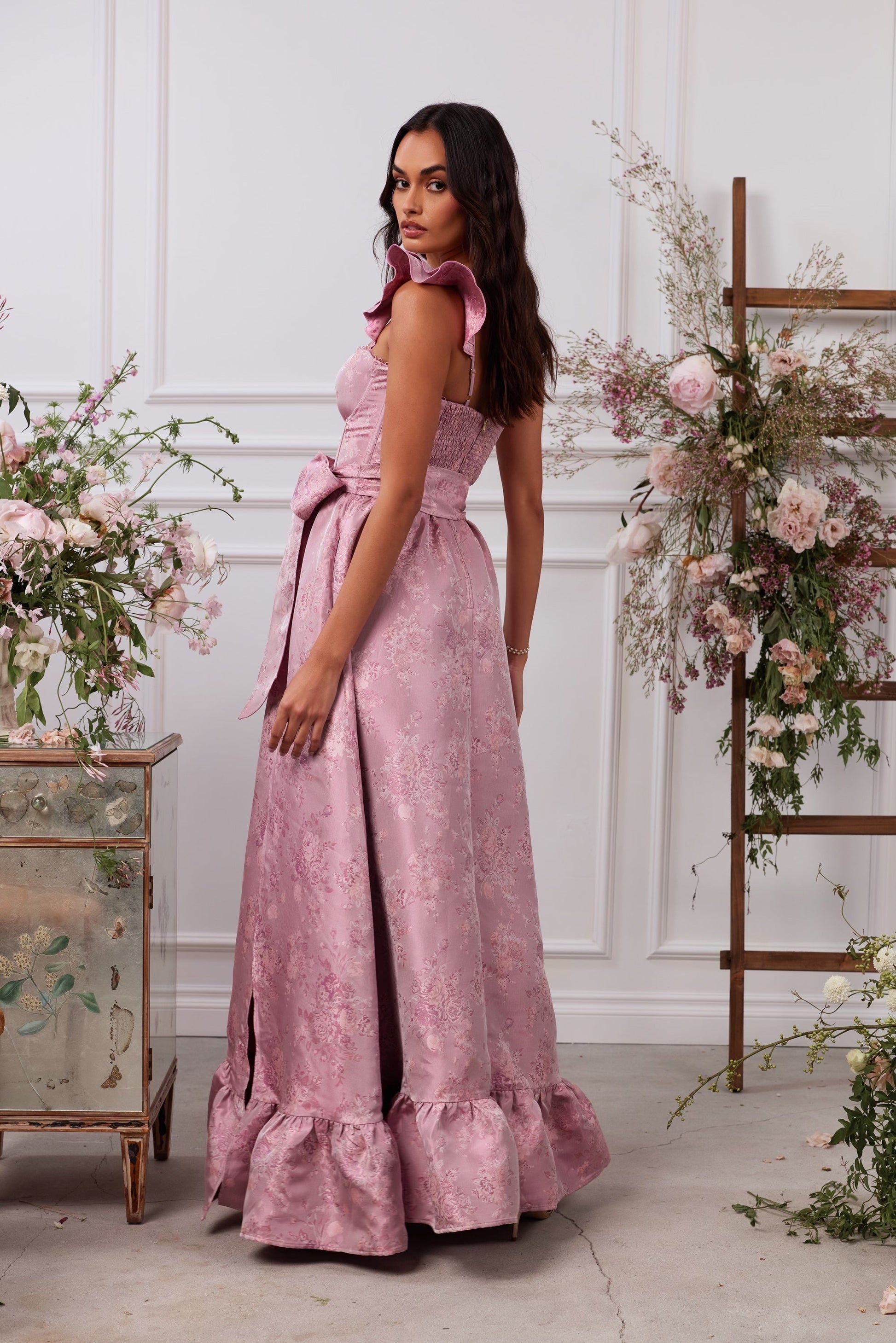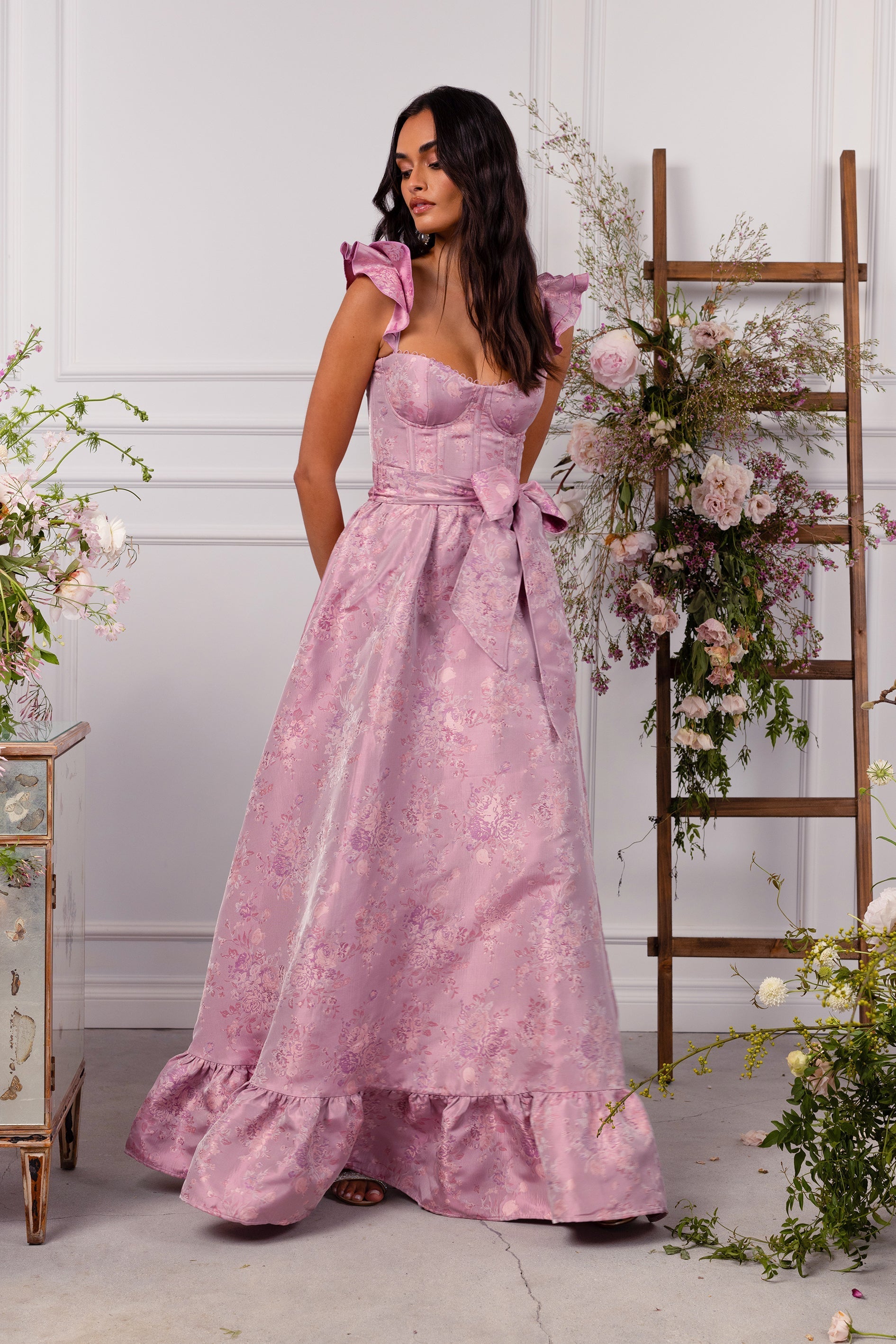 The Veronica Dress is a full-length corset dress featuring a side front slit and bow-tie belt. She's made in our romantic Orchid Haze Windsor brocade fabric, which features pink and purple florals on a pink background, and adorned with dainty loop trim and the sweetest ruffle details. She's classic, sophisticated, and ready for evenings out!