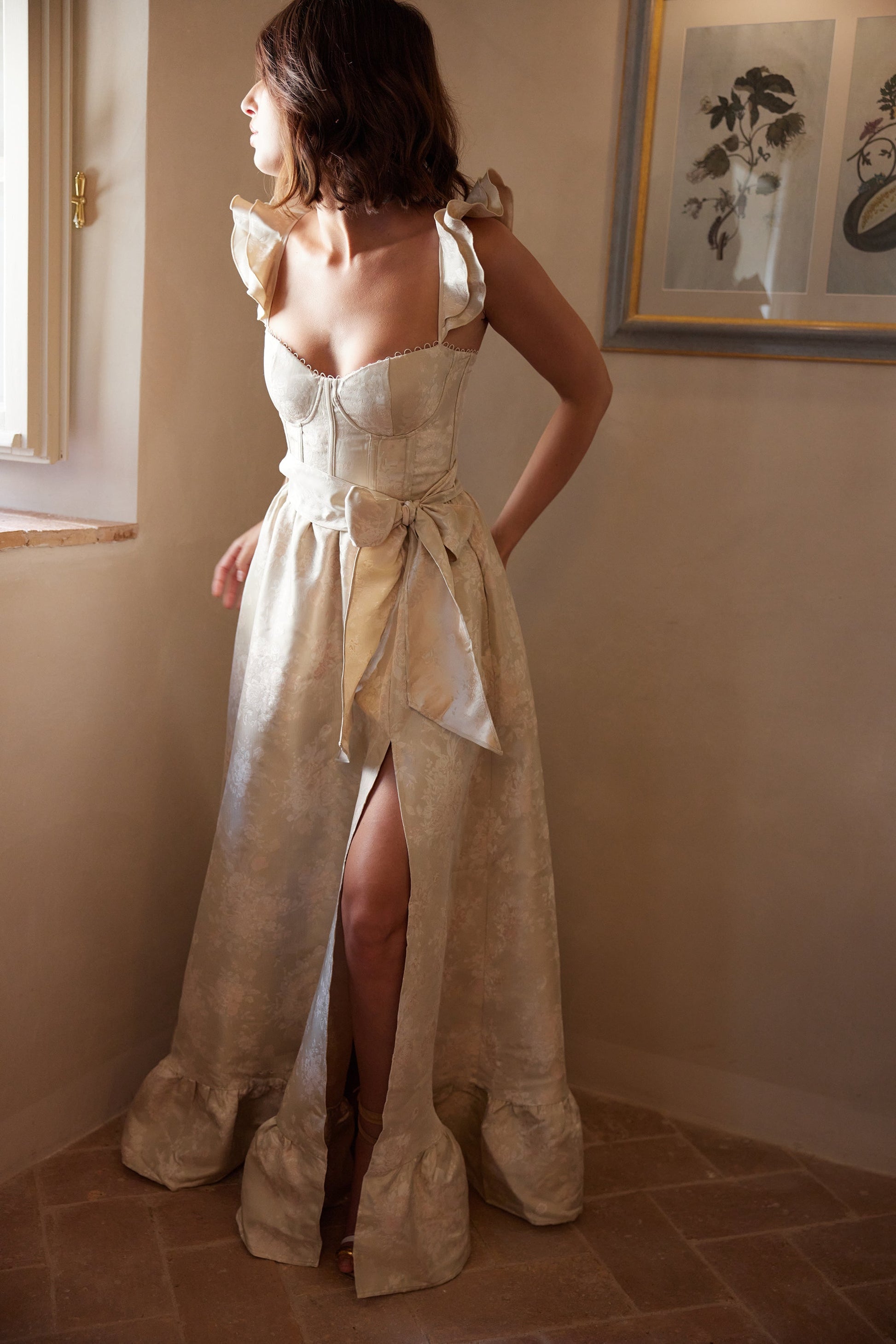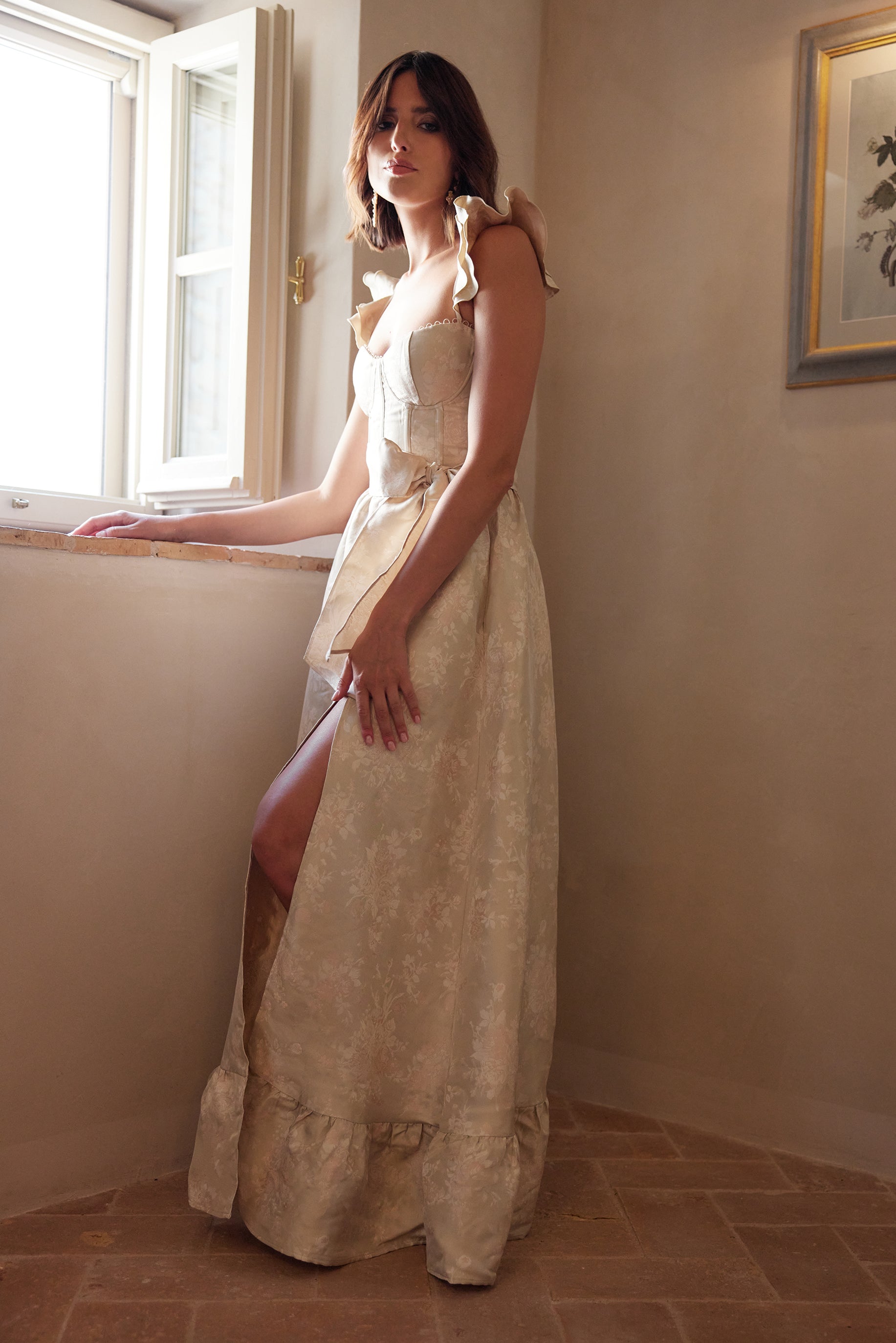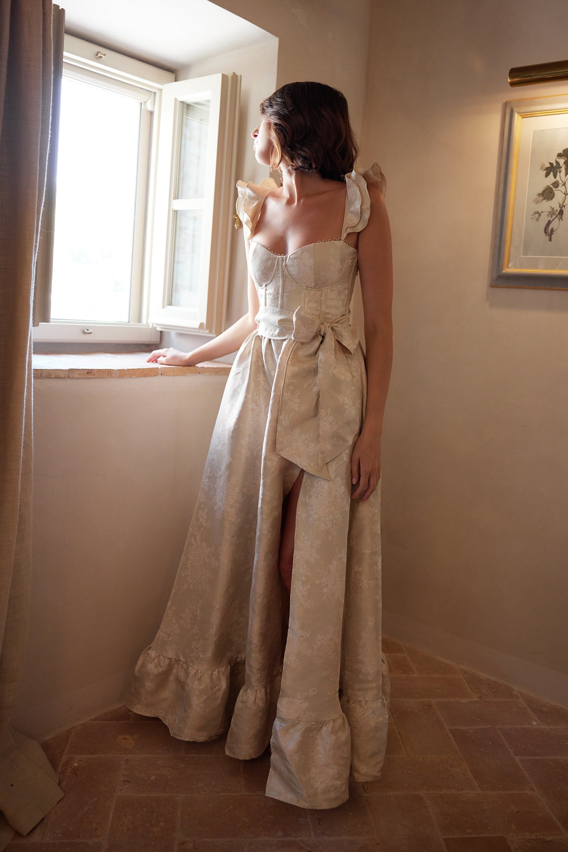The Veronica Dress is a full-length corset dress featuring a side front slit and bow-tie belt. She's made in our romantic Taupe Windsor Brocade, which flaunts taupe florals on a taupe background, and adorned with dainty loop trim and the sweetest ruffle details. She's classic, sophisticated, and ready for evenings out!