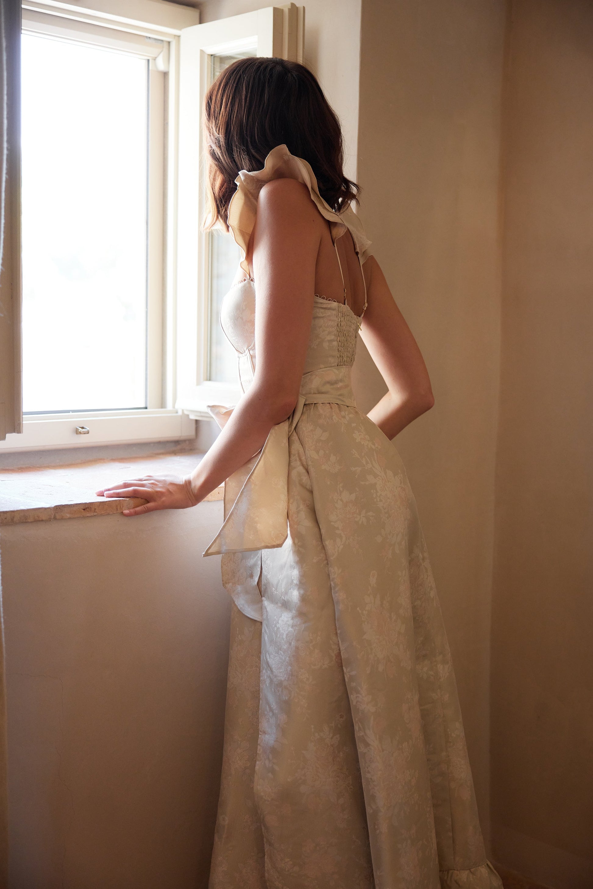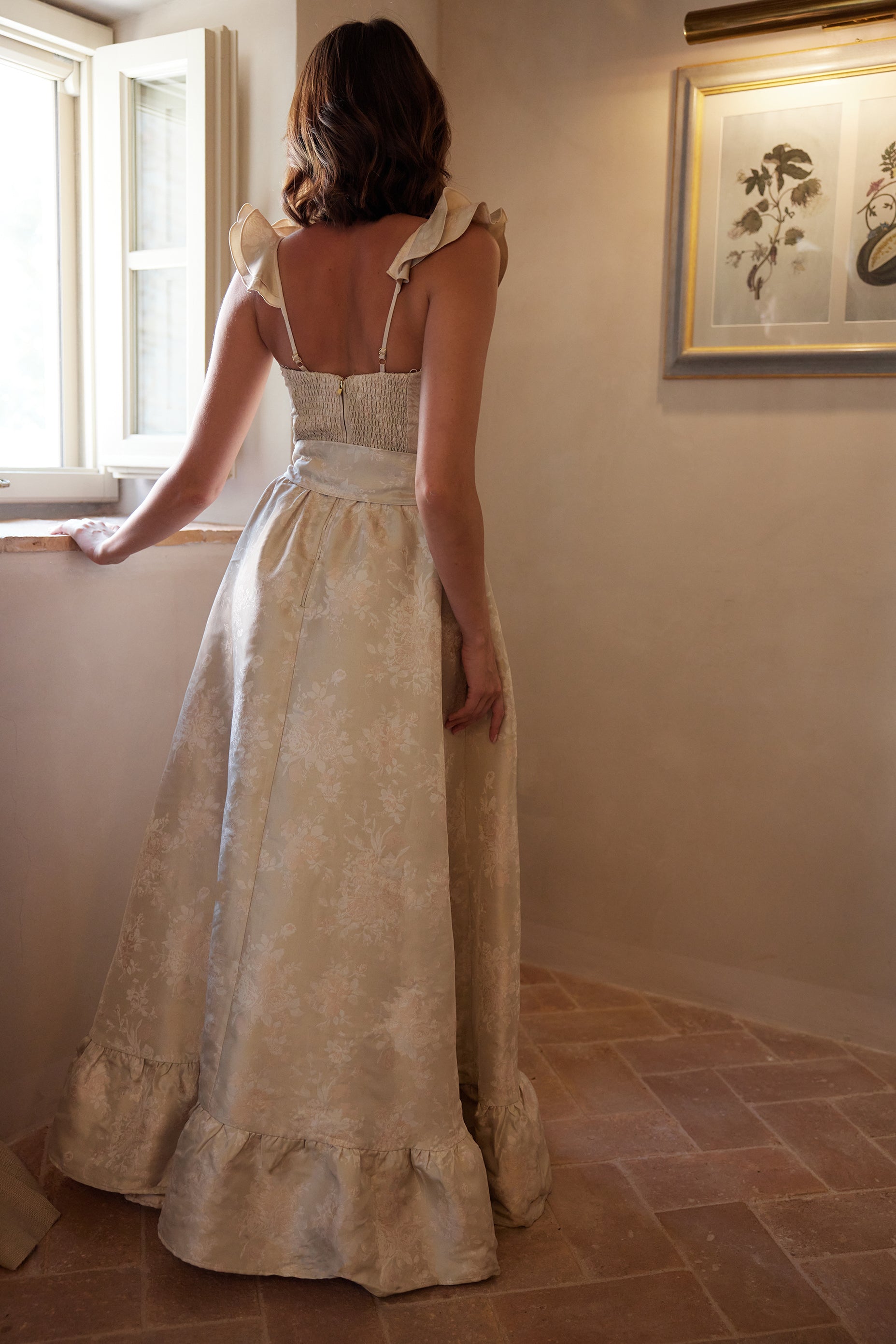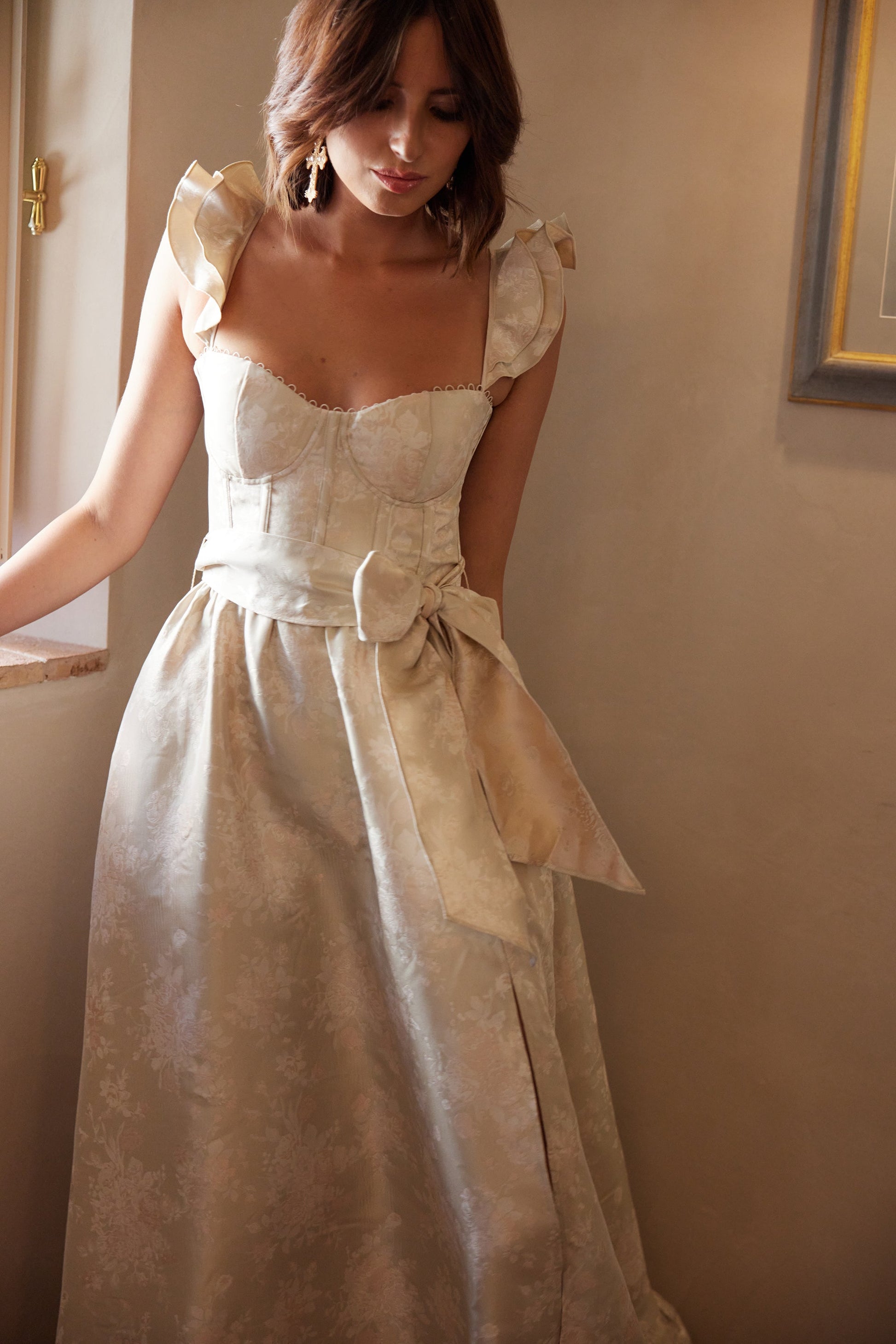 The Veronica Dress is a full-length corset dress featuring a side front slit and bow-tie belt. She's made in our romantic Taupe Windsor Brocade, which flaunts taupe florals on a taupe background, and adorned with dainty loop trim and the sweetest ruffle details. She's classic, sophisticated, and ready for evenings out!