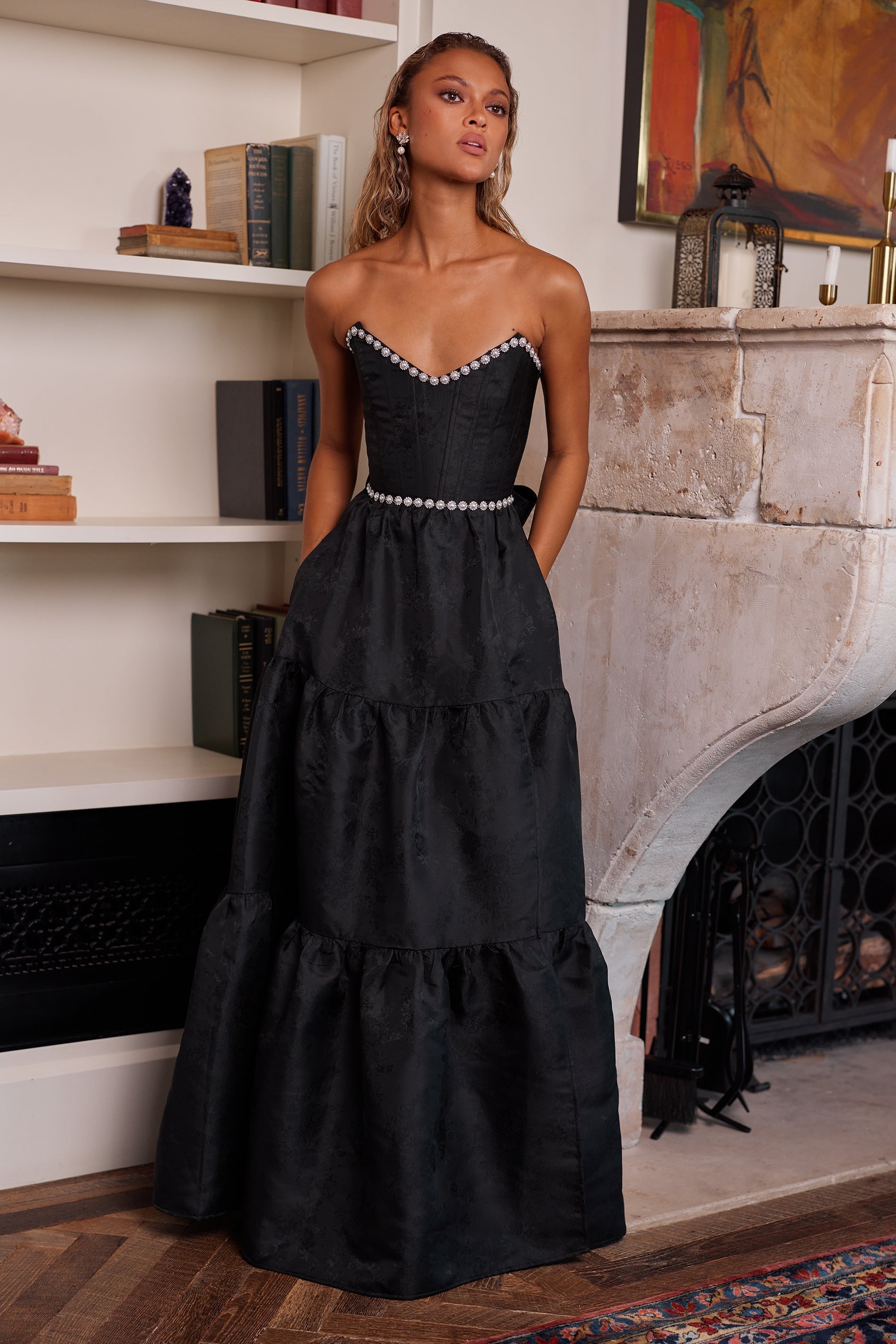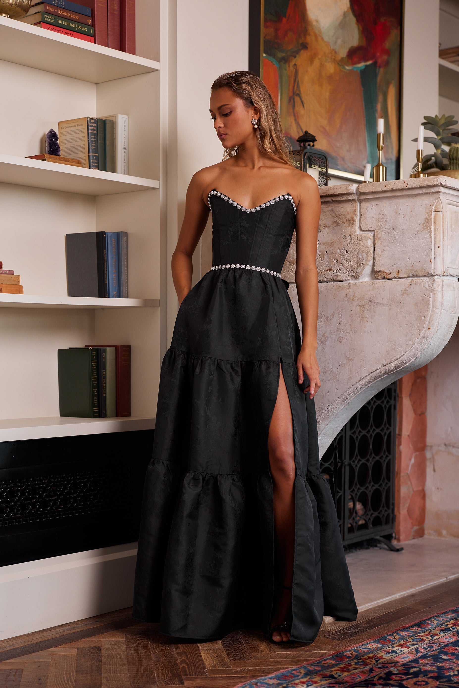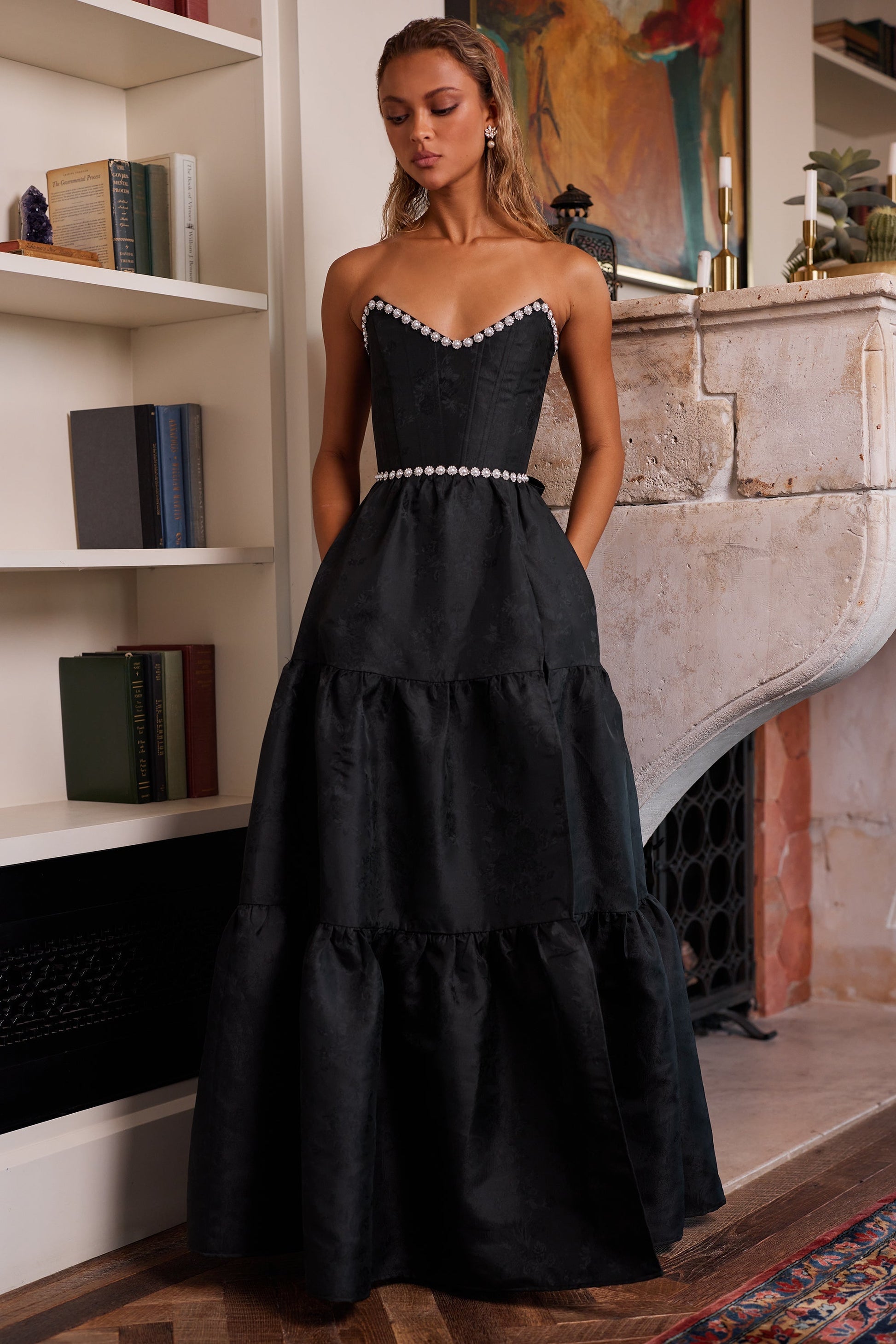 Introducing The Vivian Dress! She's the dreamiest strapless gown, accented with sparkling pearl and crystal beaded trim. Fall in love with cascading gathered tiers and a sexy, but sophisticated, side-front slit. Made in Black Windsor Brocade, which flaunts black florals on a black background, she features a corset bodice, invisible zipper, and side pockets. Dance the night away in this brocade dream.
