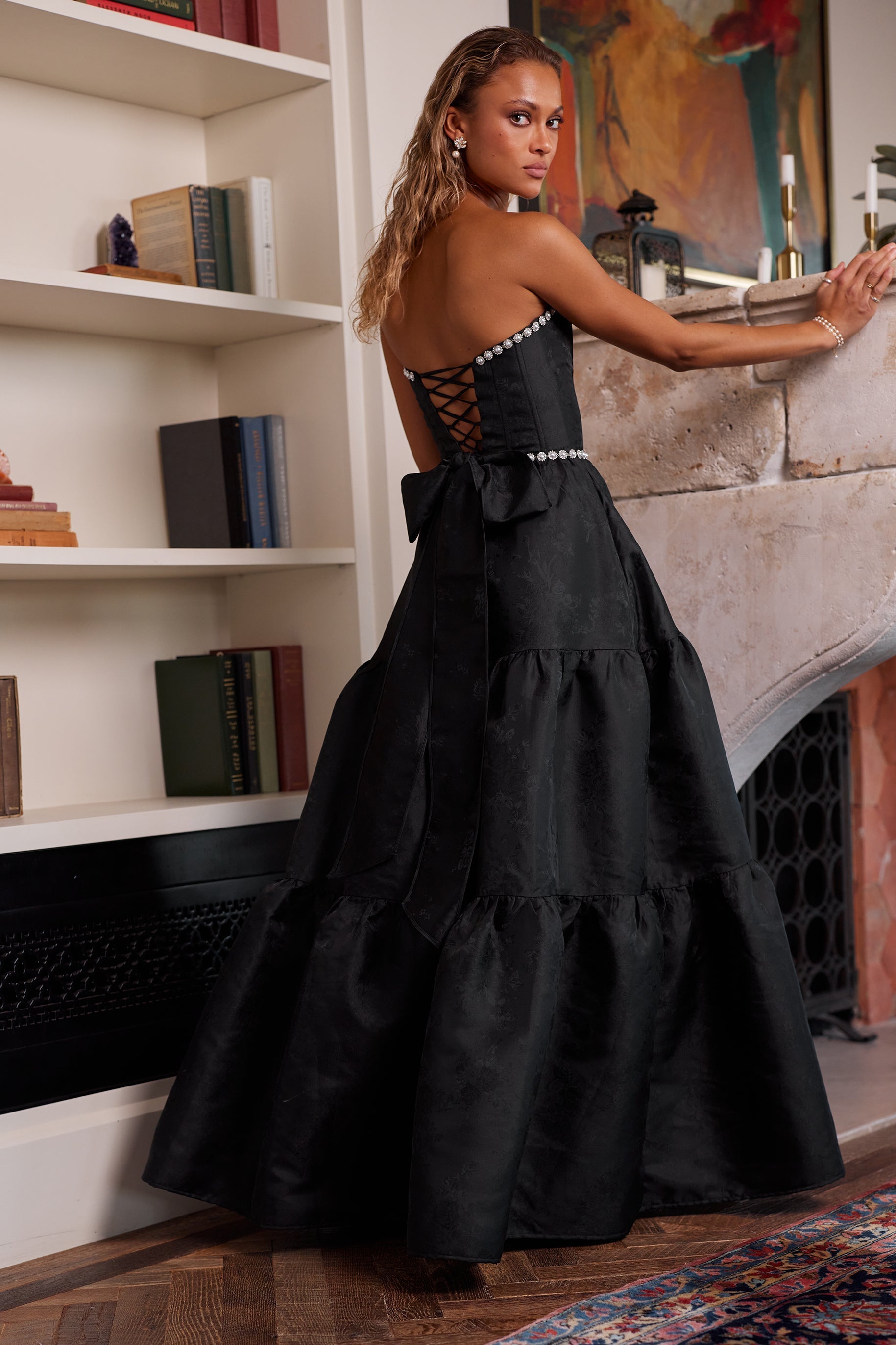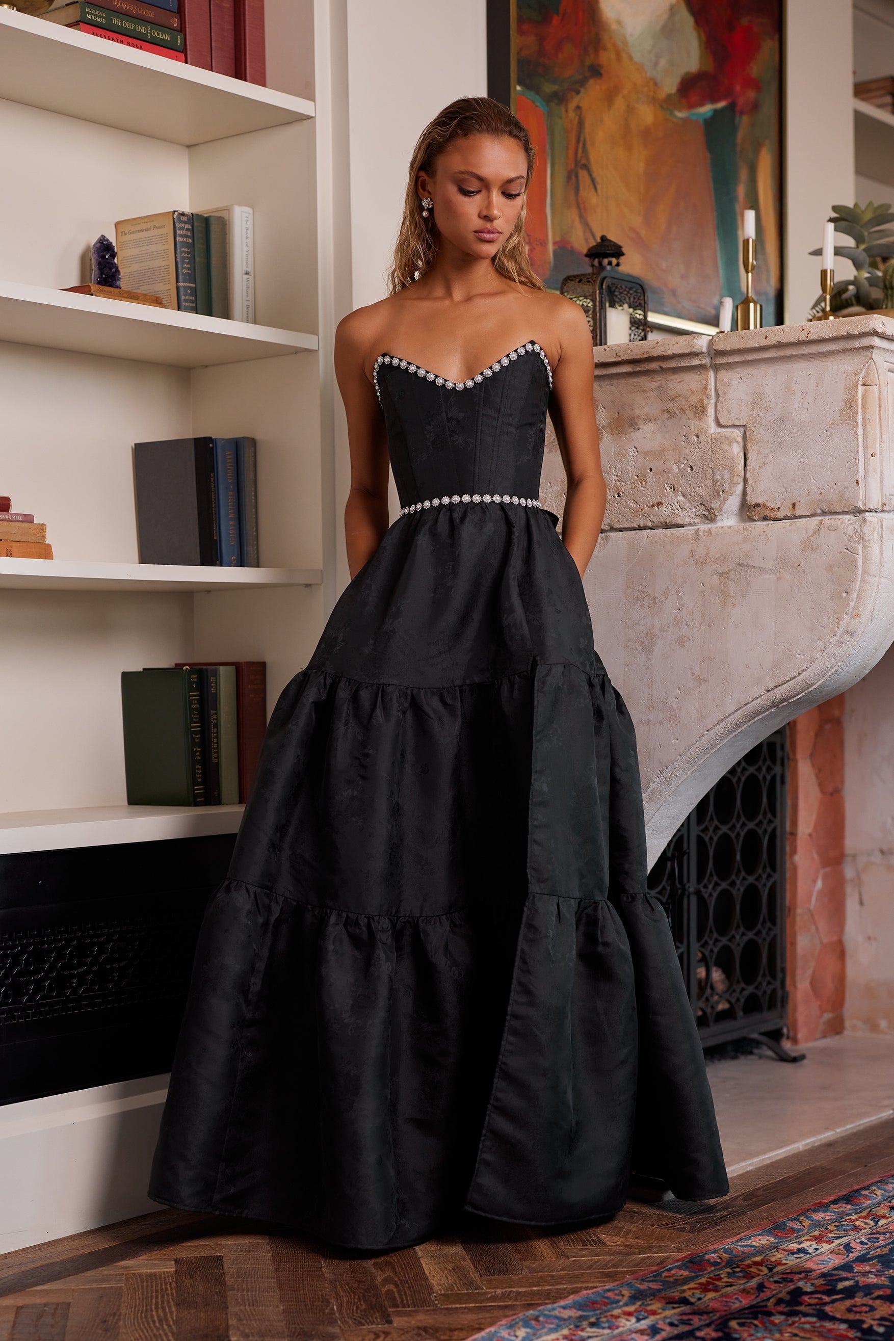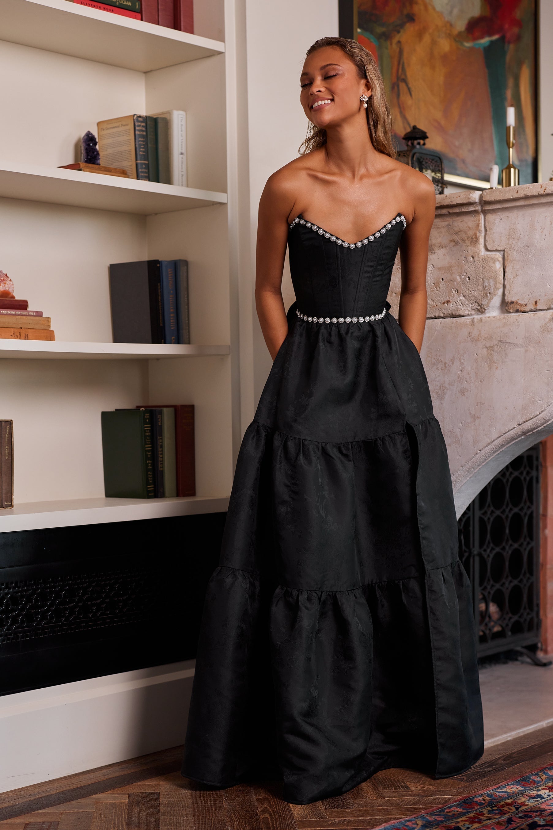 Introducing The Vivian Dress! She's the dreamiest strapless gown, accented with sparkling pearl and crystal beaded trim. Fall in love with cascading gathered tiers and a sexy, but sophisticated, side-front slit. Made in Black Windsor Brocade, which flaunts black florals on a black background, she features a corset bodice, invisible zipper, and side pockets. Dance the night away in this brocade dream.
